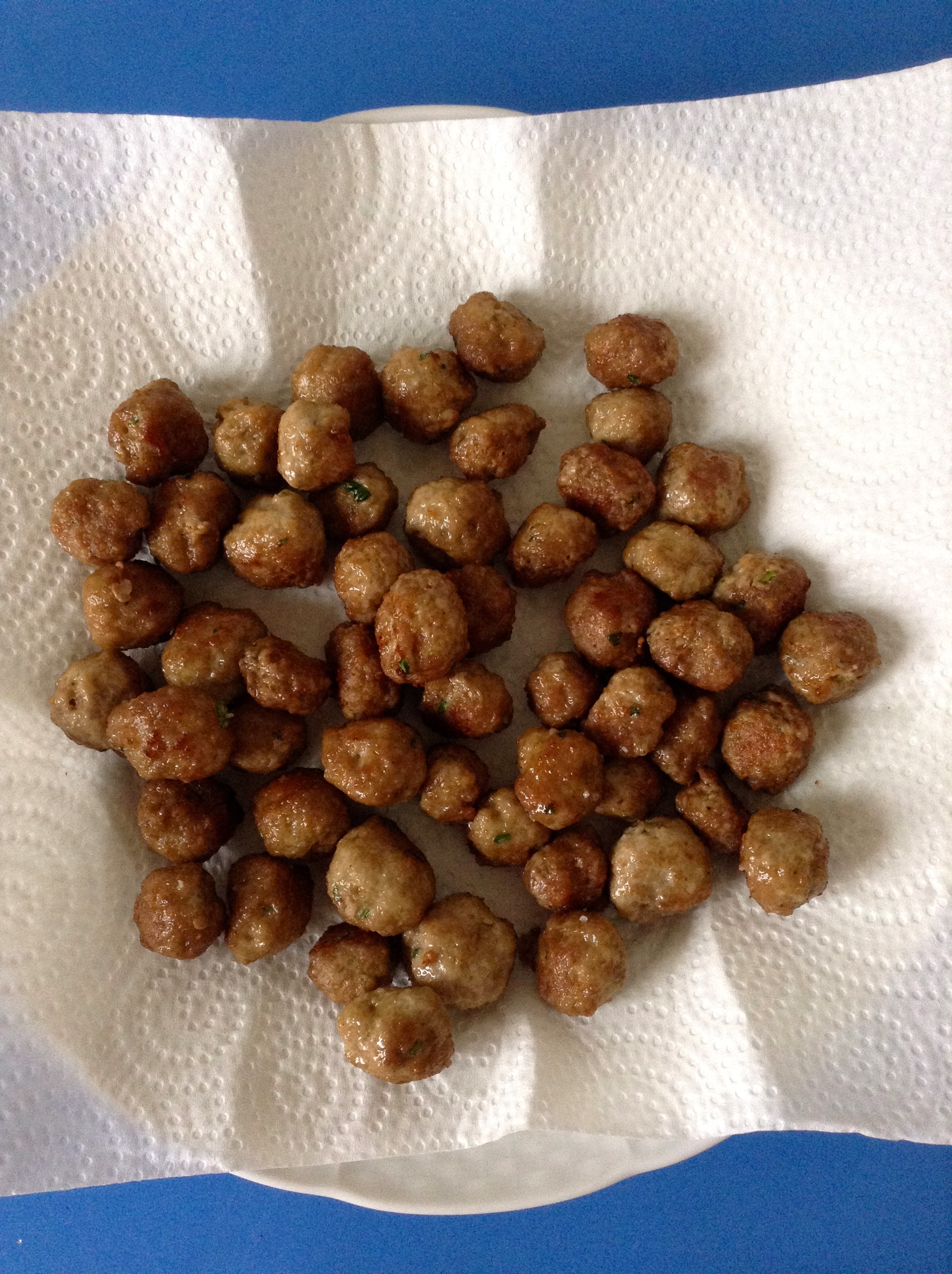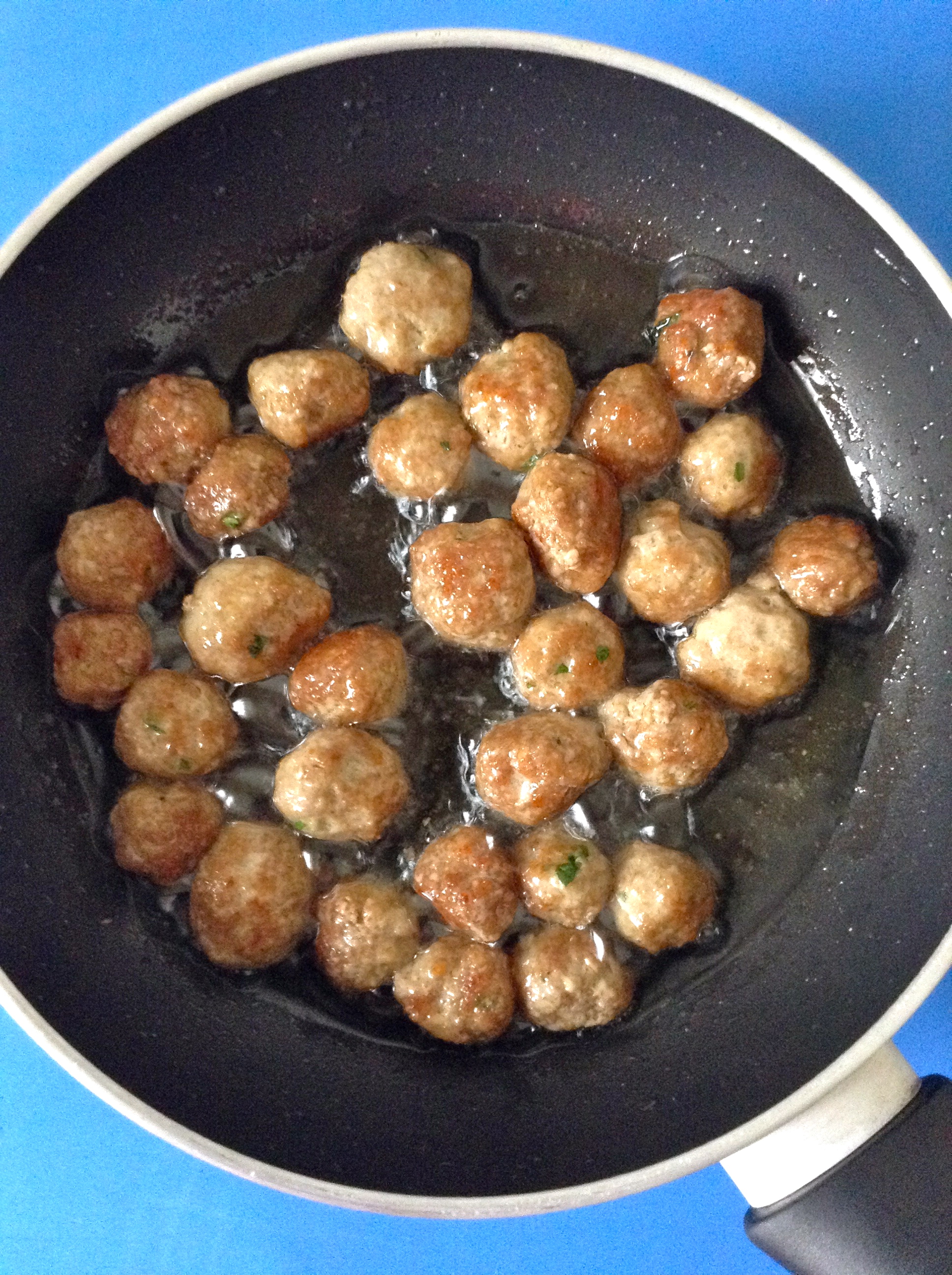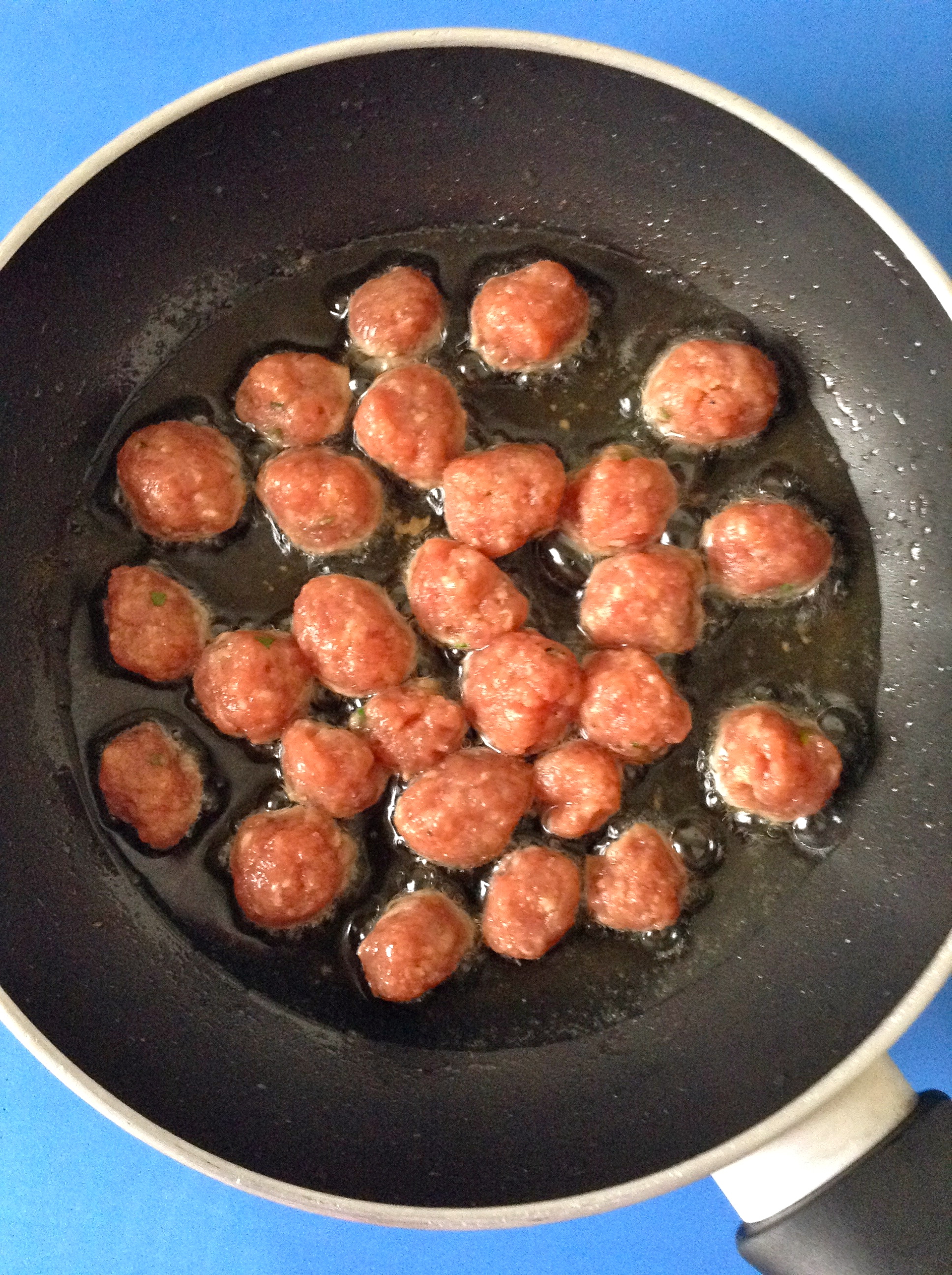 Formo pequeñas albóndigas y las frío en aceite de oliva a fuego medio.