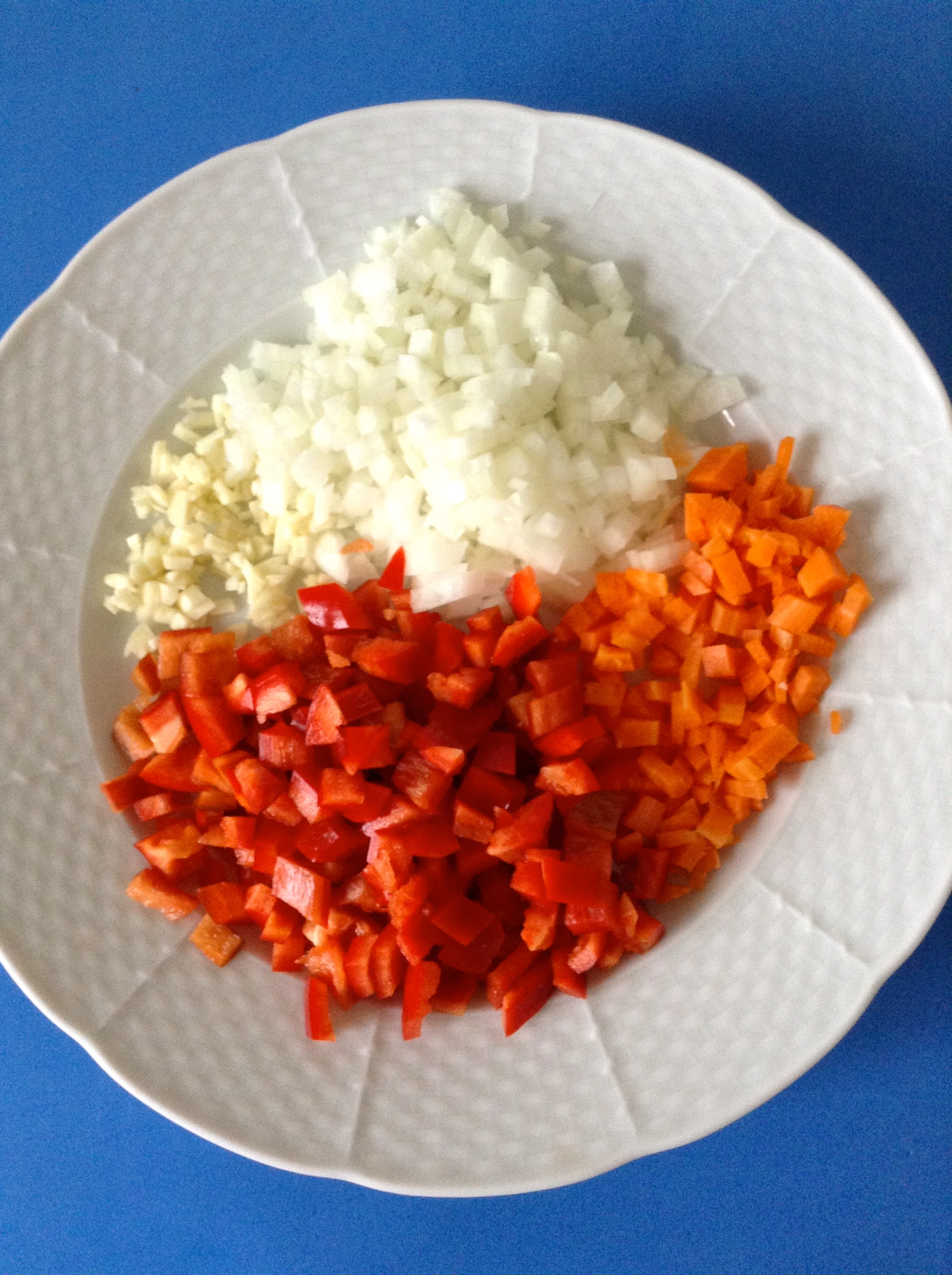 Pico los ajos, la cebolla, el pimiento y la zanahoria.