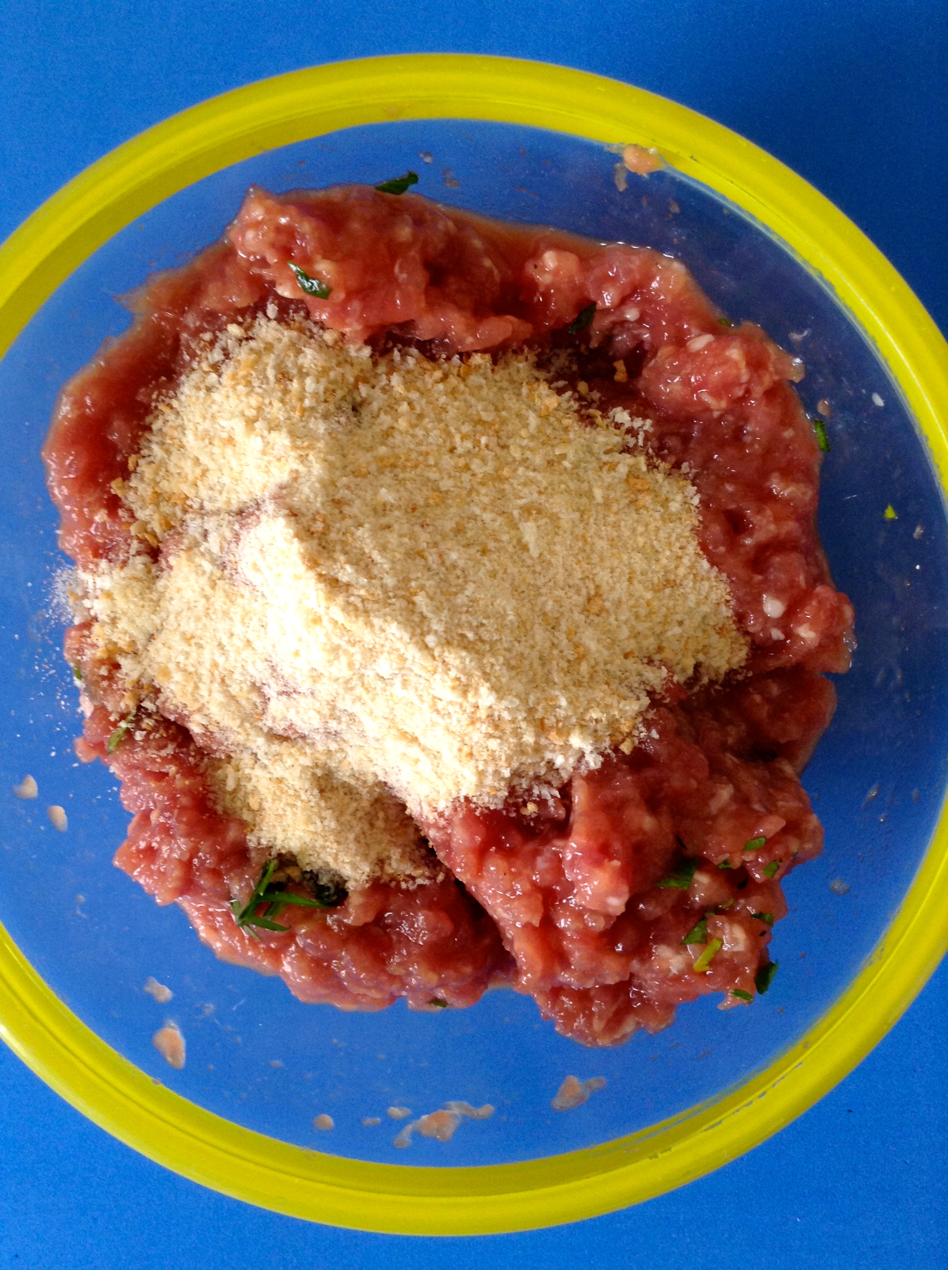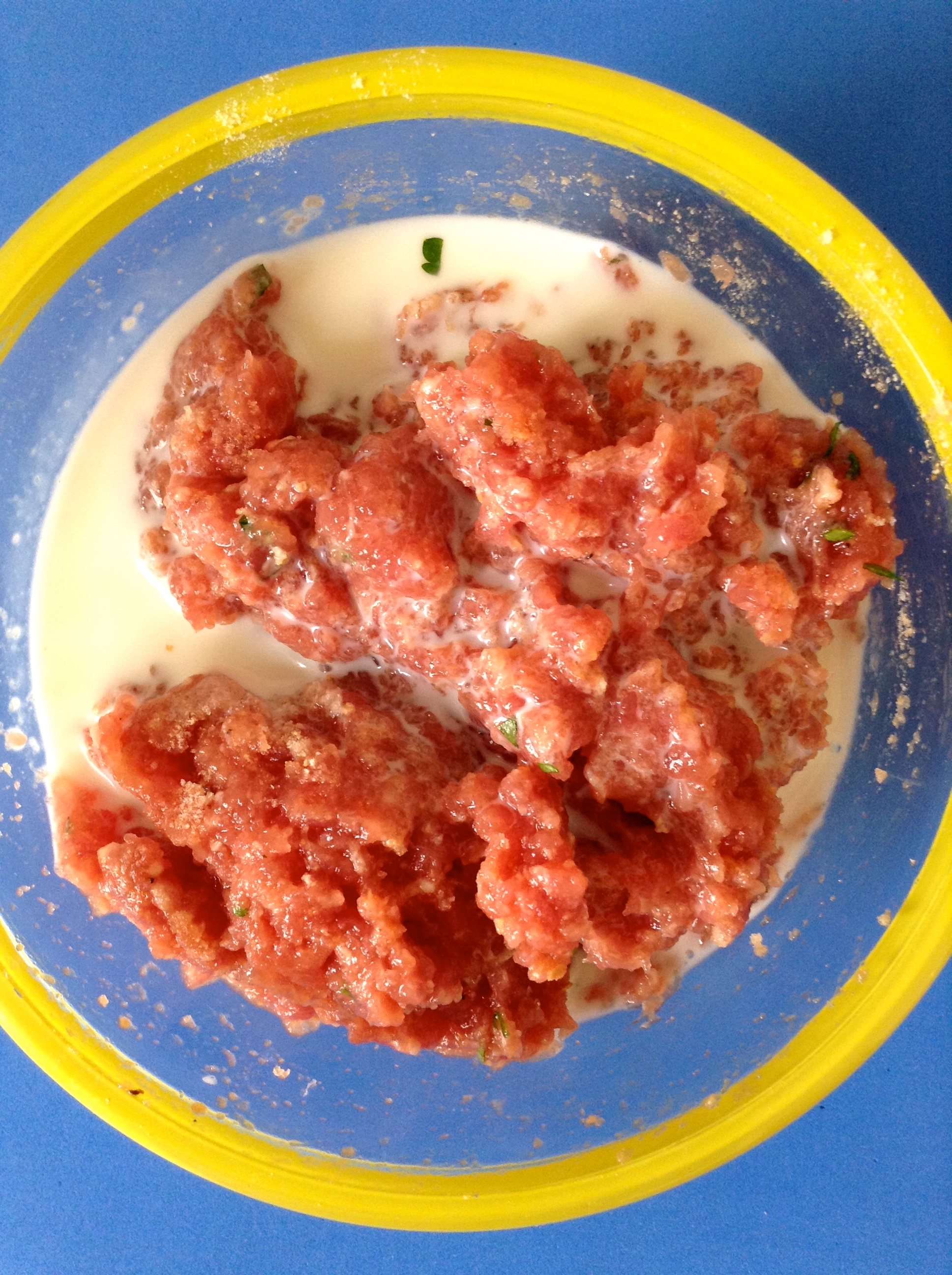 La apaño con sal, perejil y pimienta. Luego, le añado el pan rallado y la leche. Lo mezclo bien.