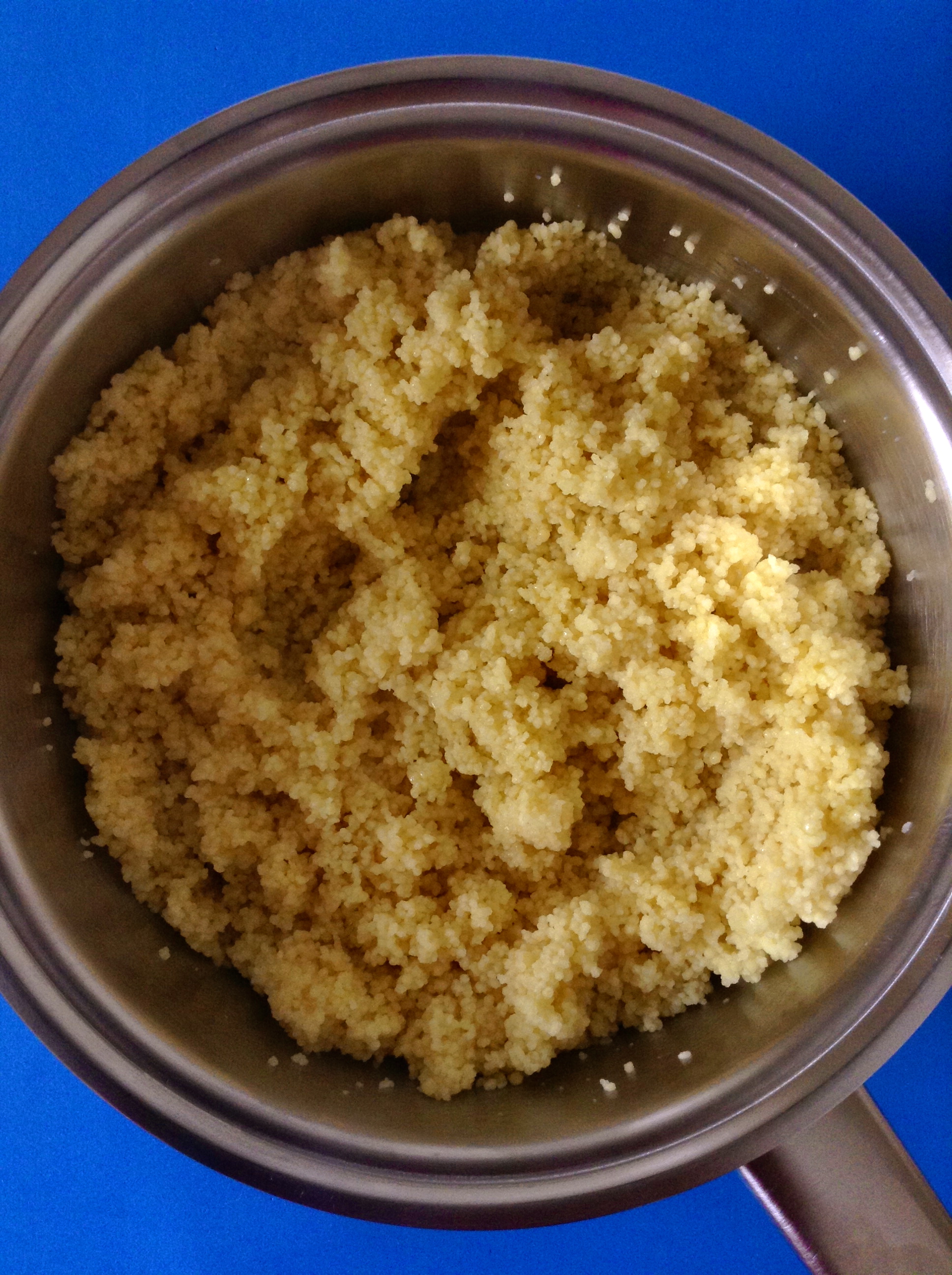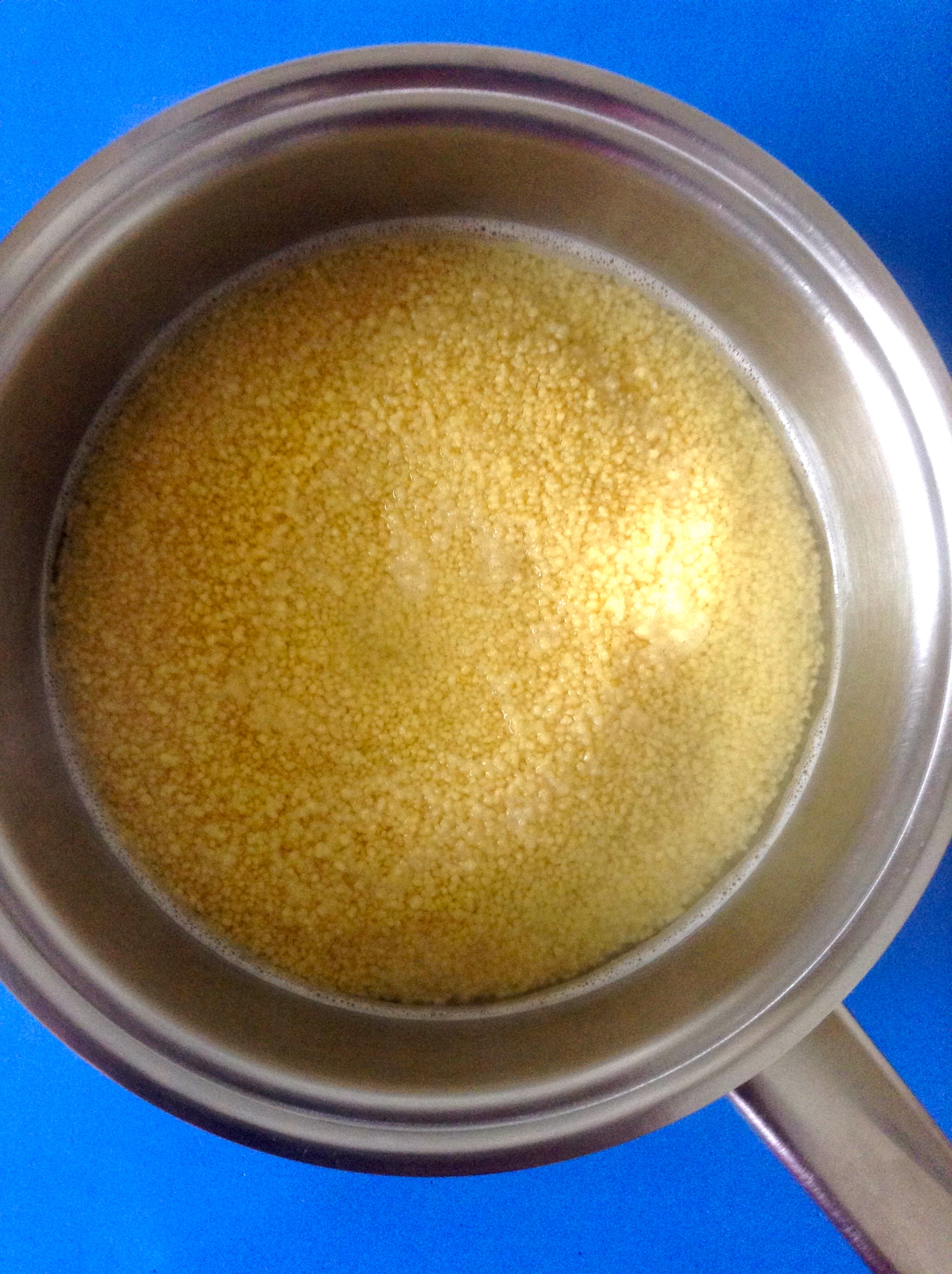 Cuando rompa a hervir, apago el fuego y echo el cous cous. Dejo que repose durante un par de minutos para que el grano absorba el agua.