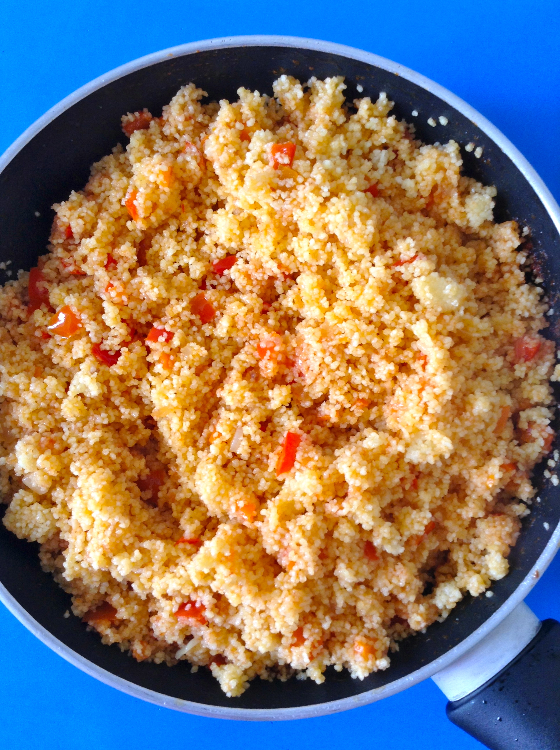 Entonces, lo vuelco en la sartén y lo rehogo durante unos cinco minutos dando vueltas para que el cous cous se impregne de sabor.