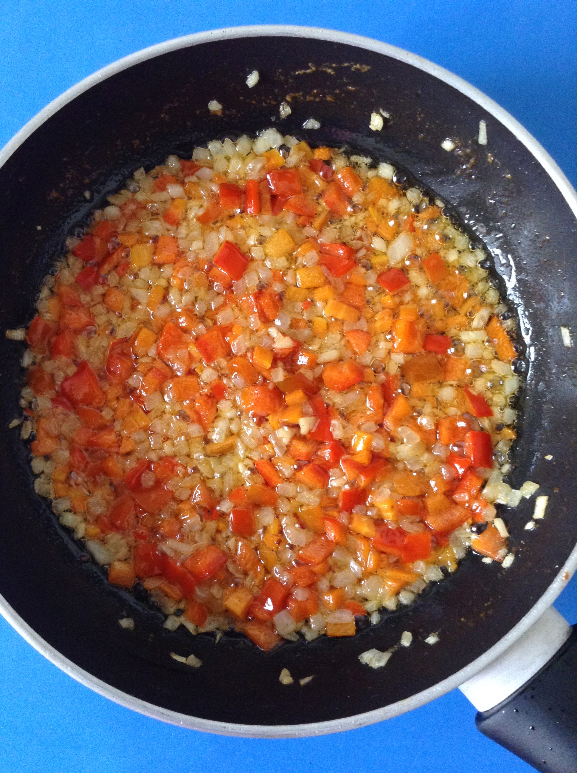 Cuando las verduras están pochadas, añado el tomate rallado. Remuevo.