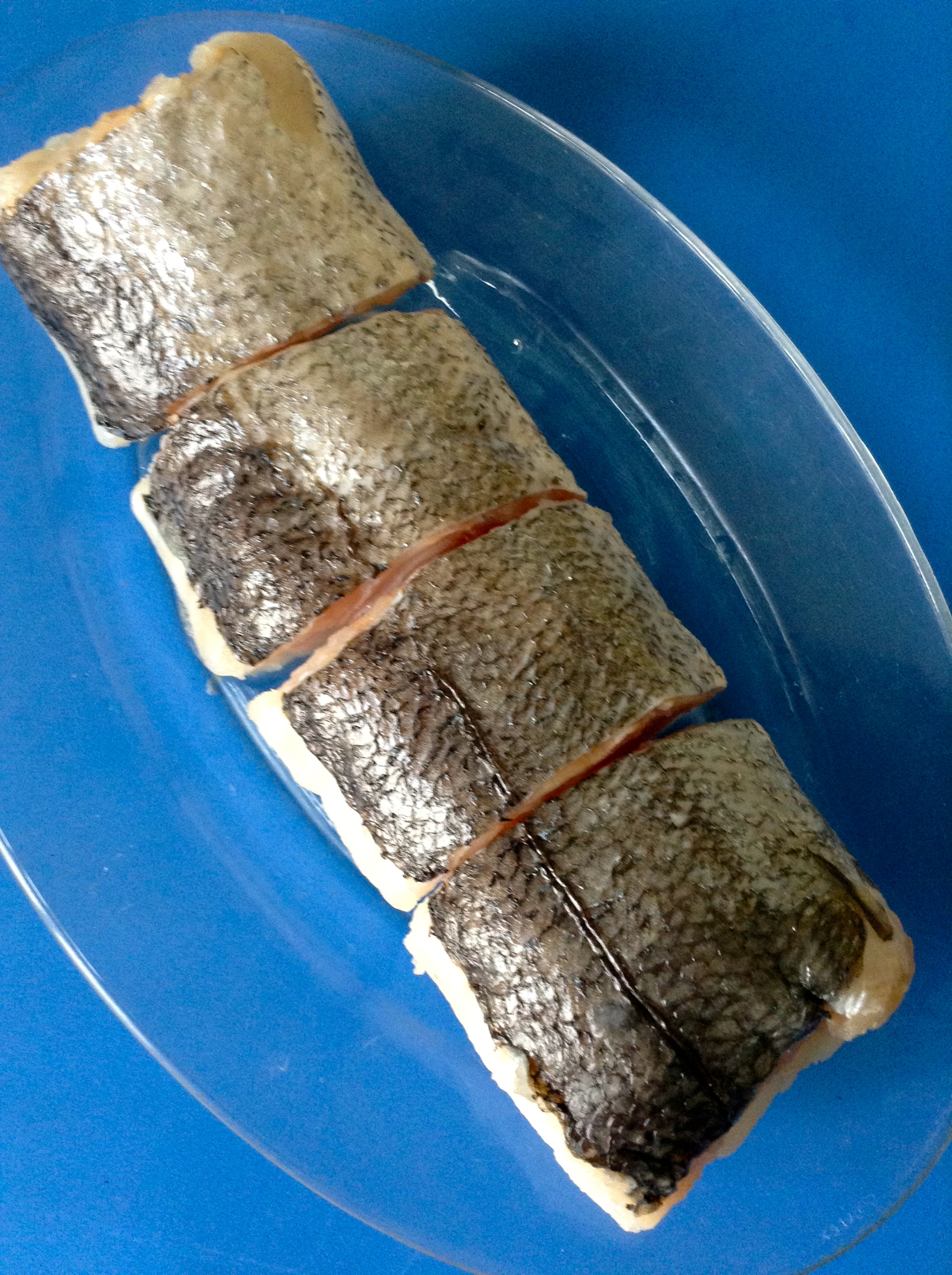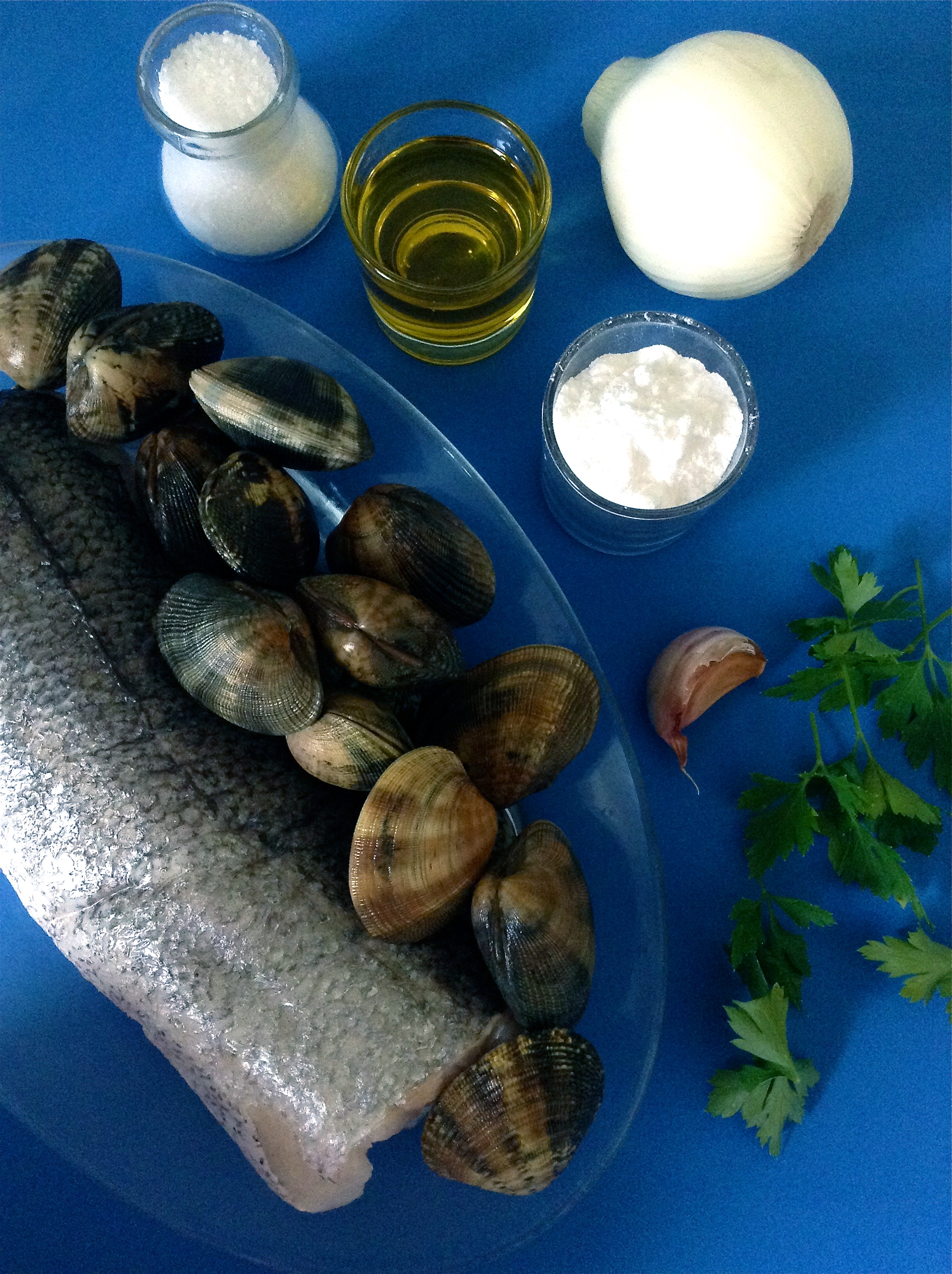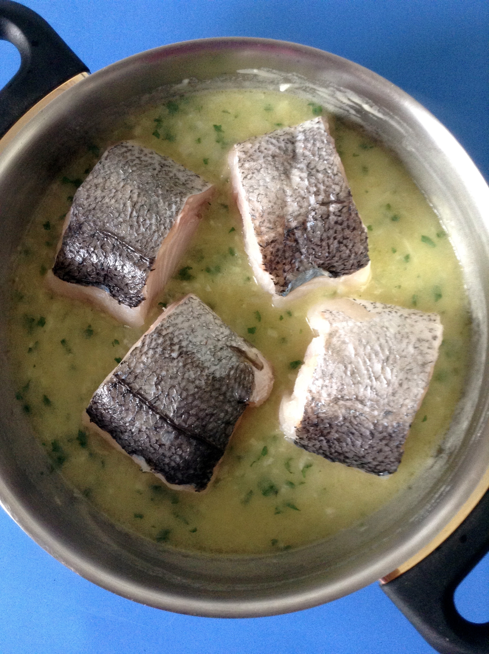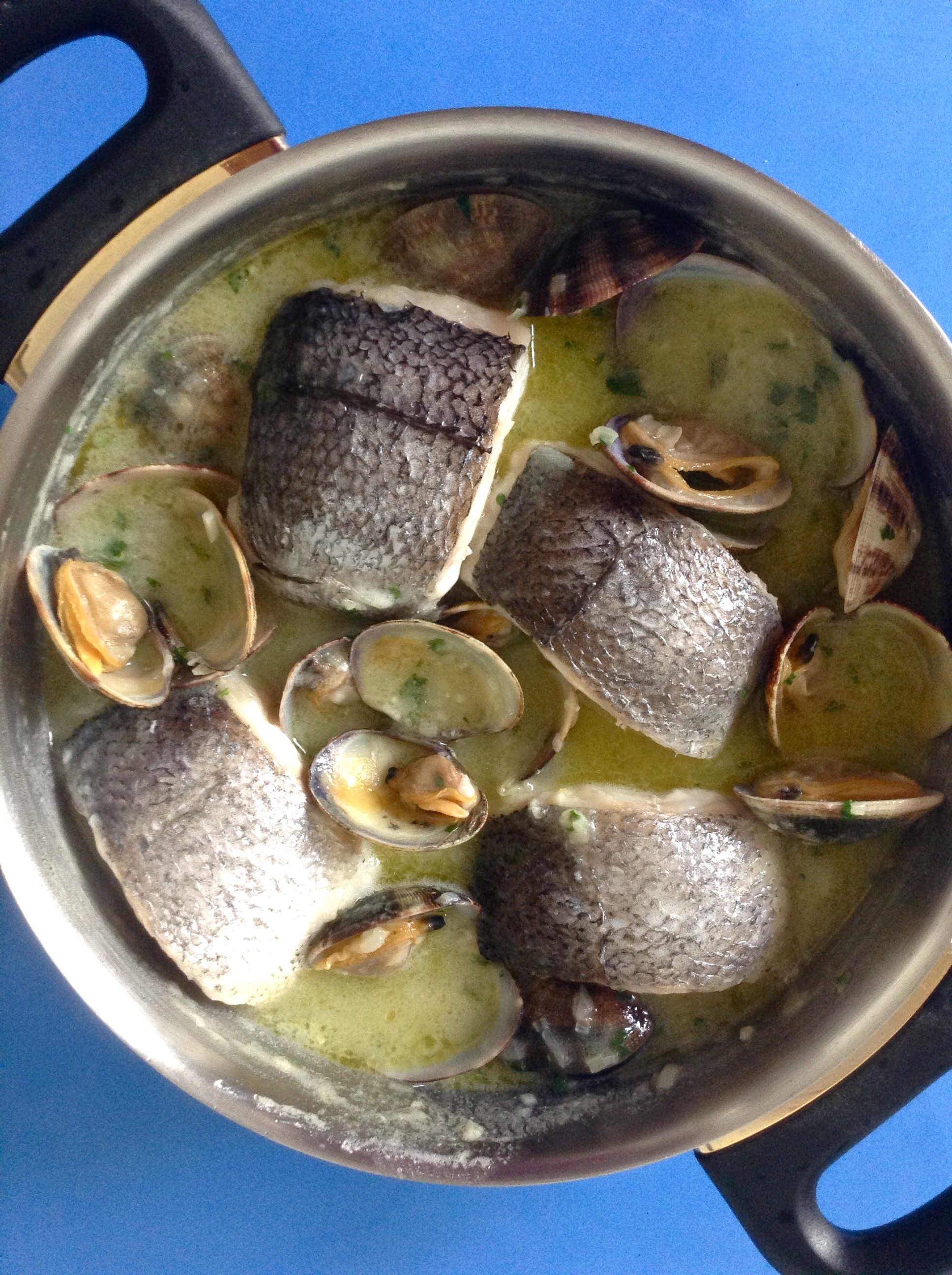 Cuando la salsa está lista, pongo en la cazuela los filetes de merluza con la piel hacia arriba y las almejas.