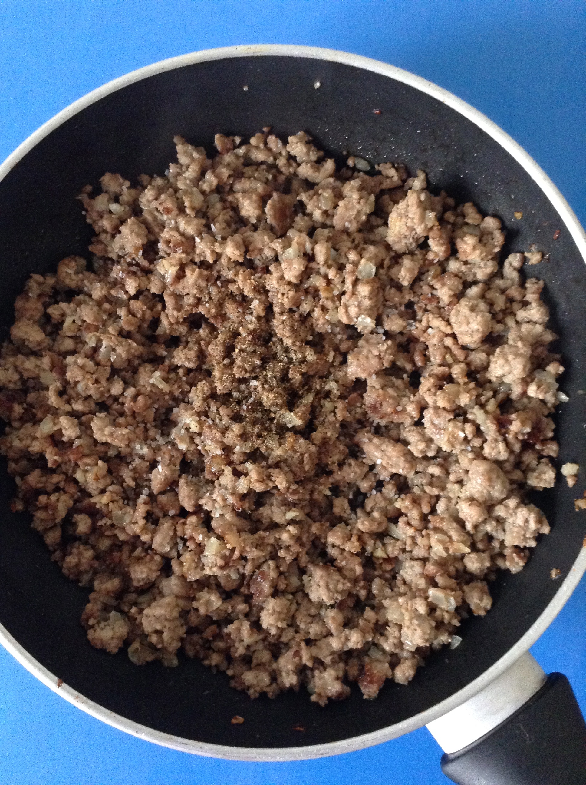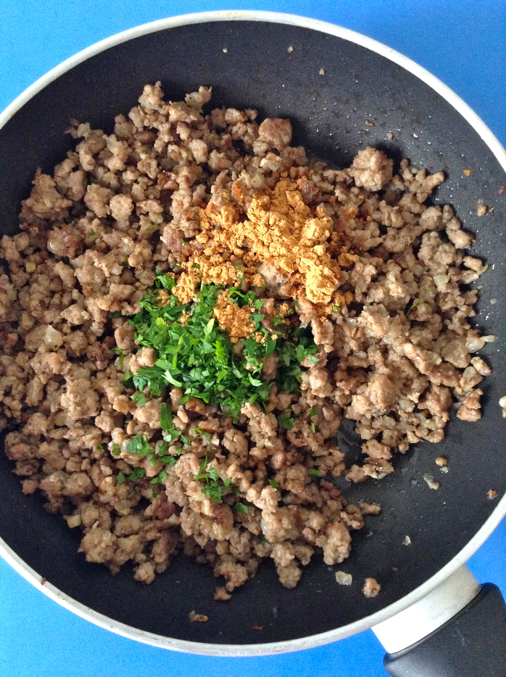 Cuando empiezan a dorarse, añado la carne. Remuevo de vez en cuando para que no se quede apelmazada. La salpimiento y le echo el perejil y la canela.