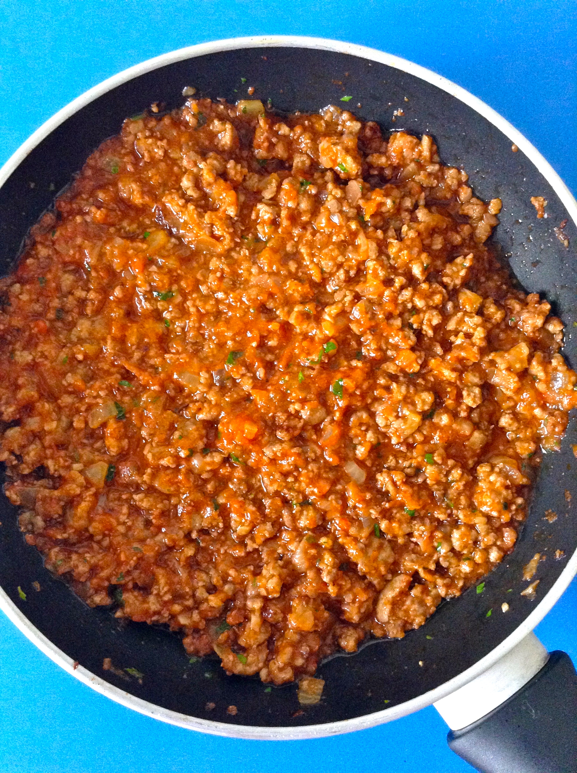 Cuando la carne se ha cocinado (unos diez minutos), añado la salsa de tomate. Lo dejo cociendo unos minutos más para que se mezclen los sabores. Lo pruebo y rectifico de sal.