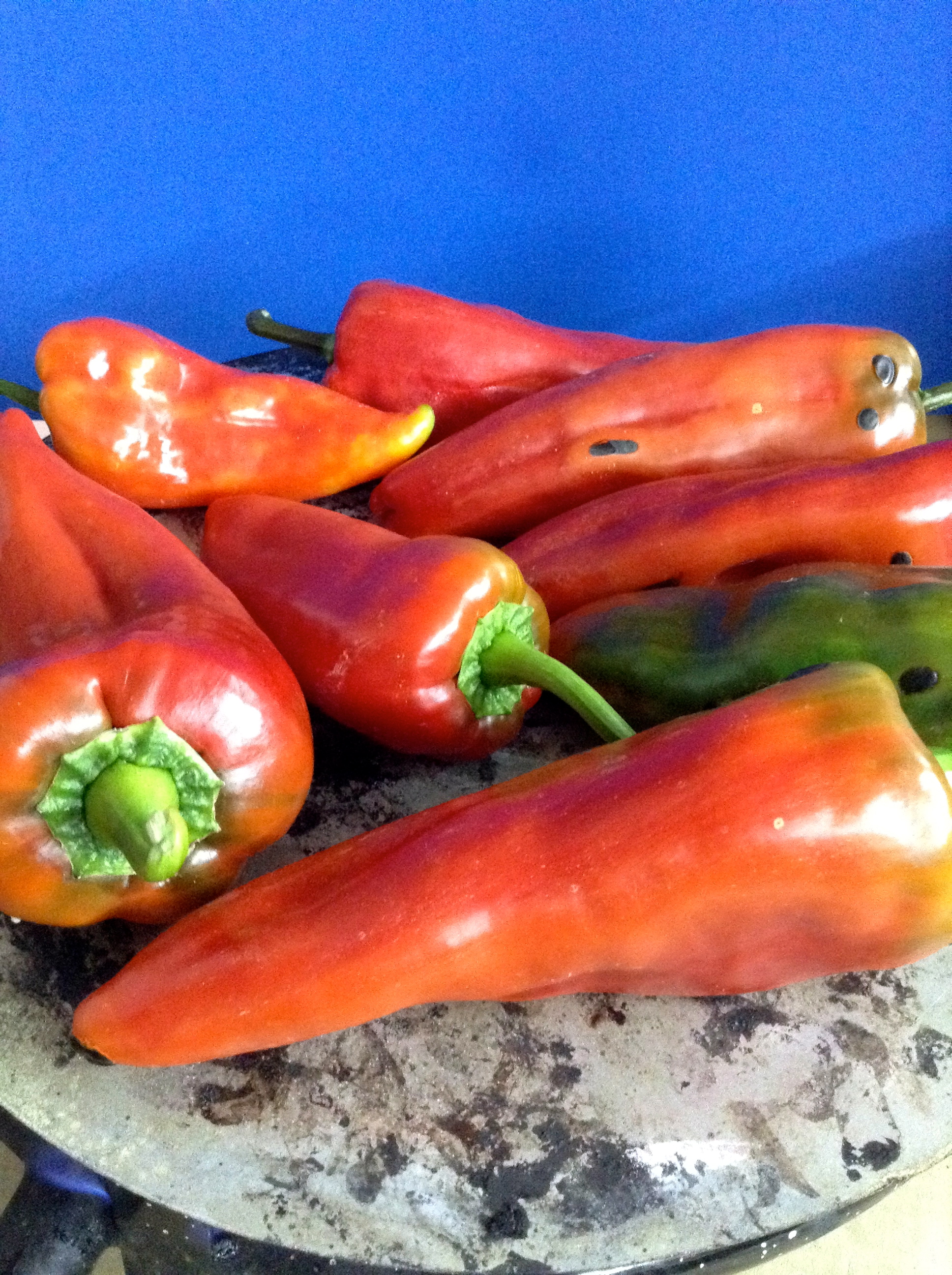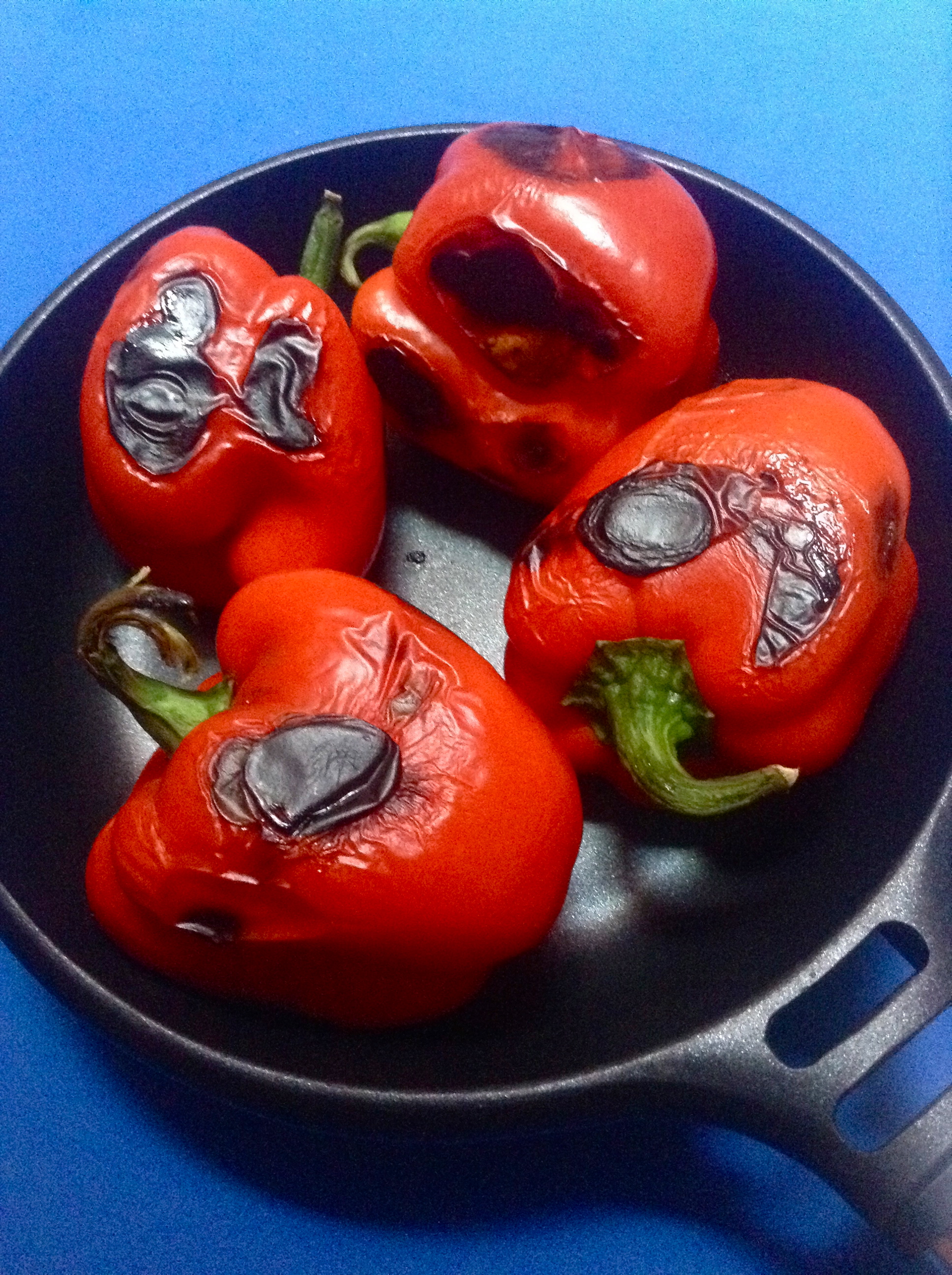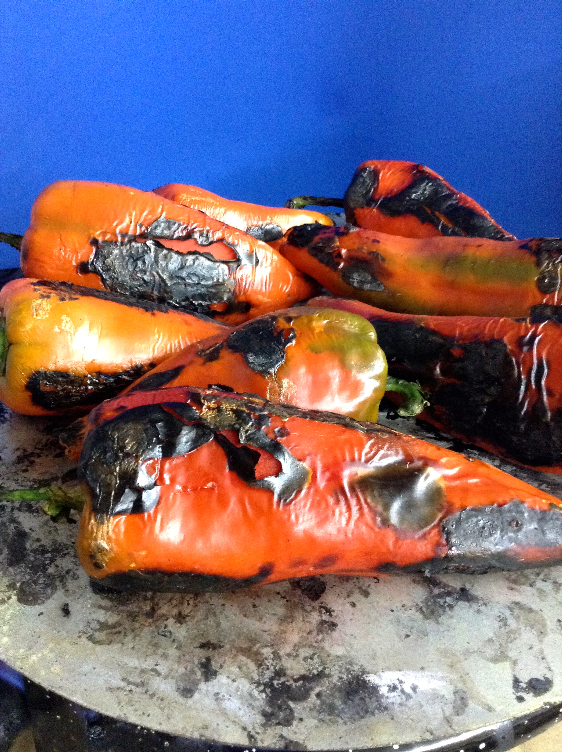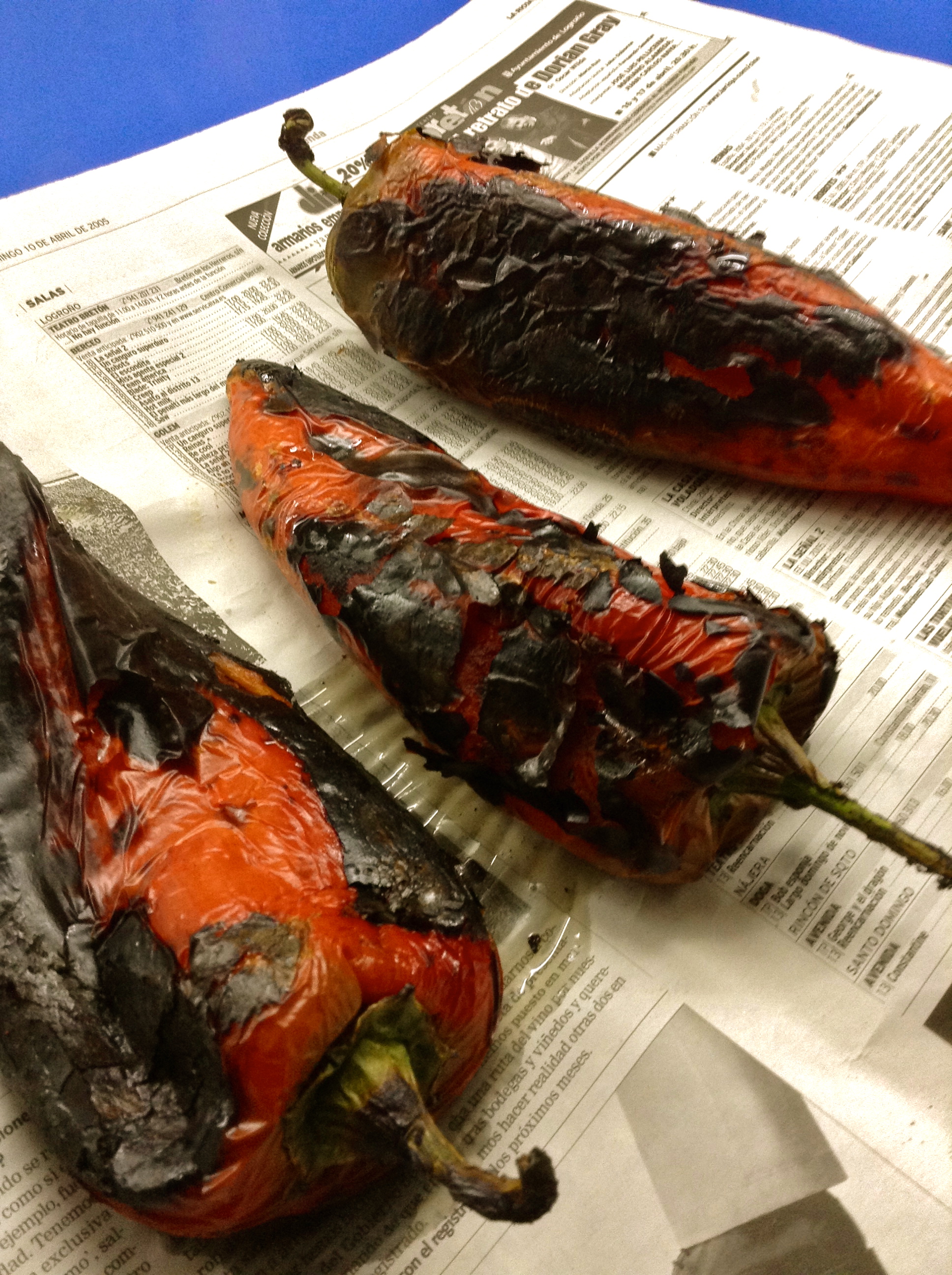 En cualquier forma que los haga, cuando la piel está bien tostada por todos los lados y se está arrugando y separando de la carne, aparto los pimientos del calor y los envuelvo en papel de periódico para que suden y así se puedan pelar mejor.