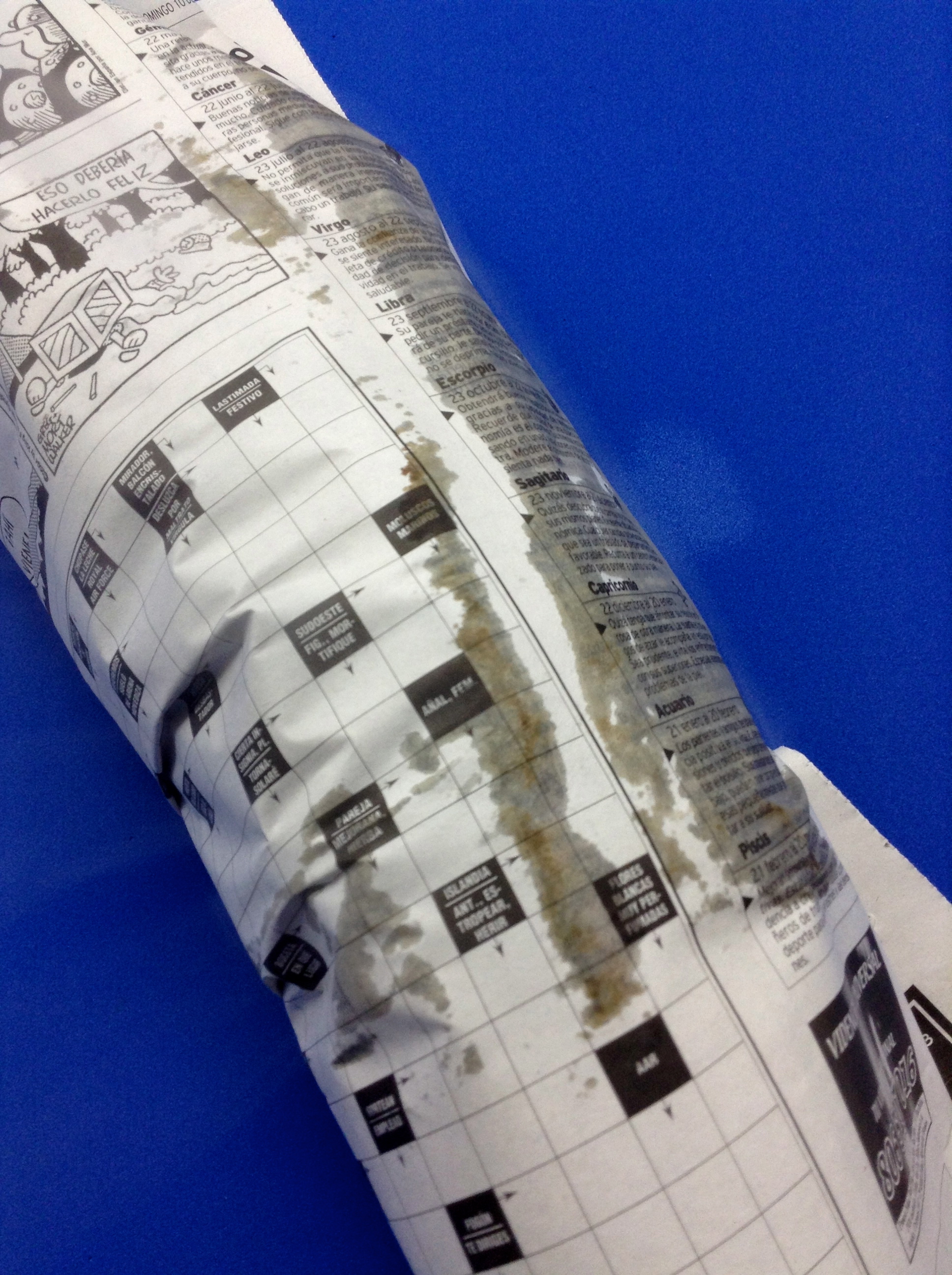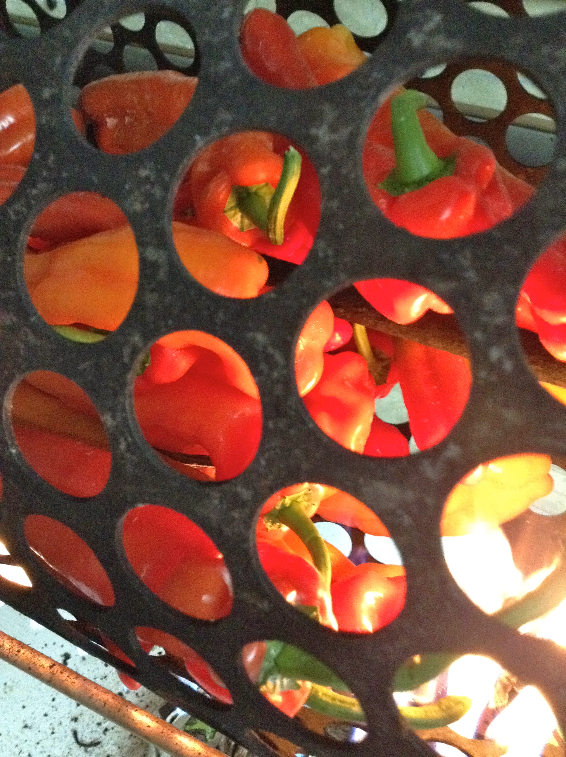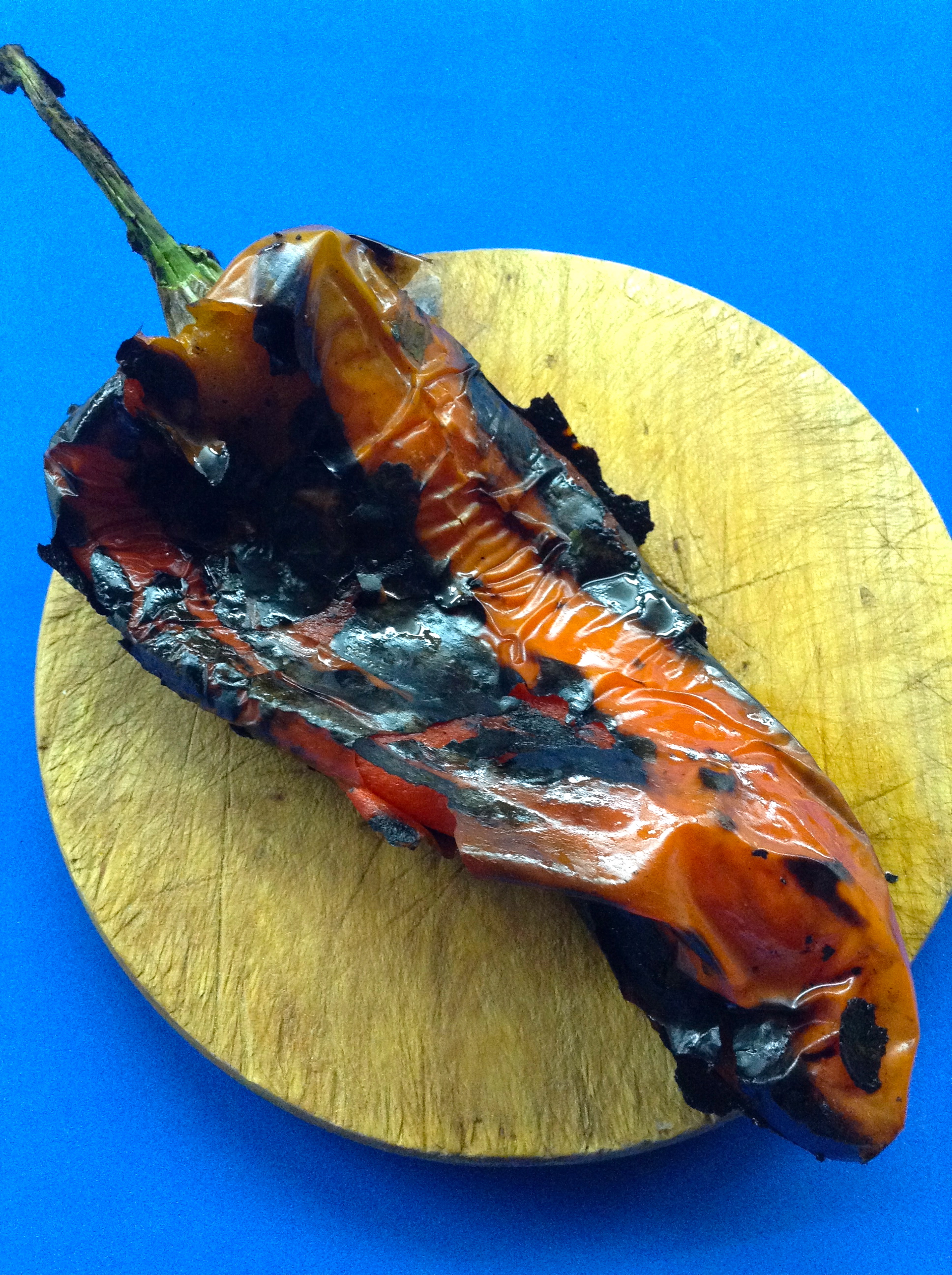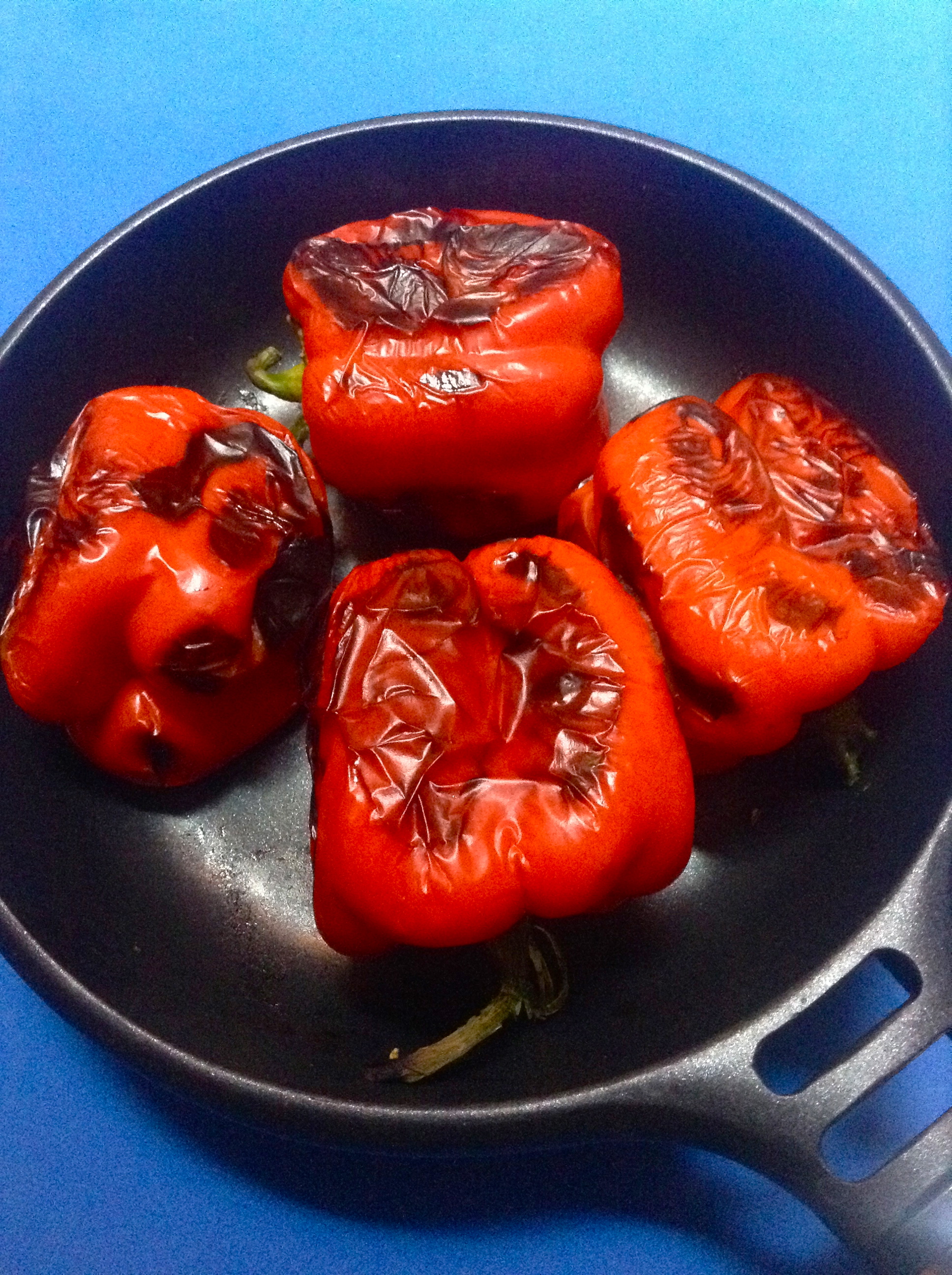 En cualquier forma que los haga, cuando la piel está bien tostada por todos los lados y se está arrugando y separando de la carne, aparto los pimientos del calor y los envuelvo en papel de periódico para que suden y así se puedan pelar mejor.