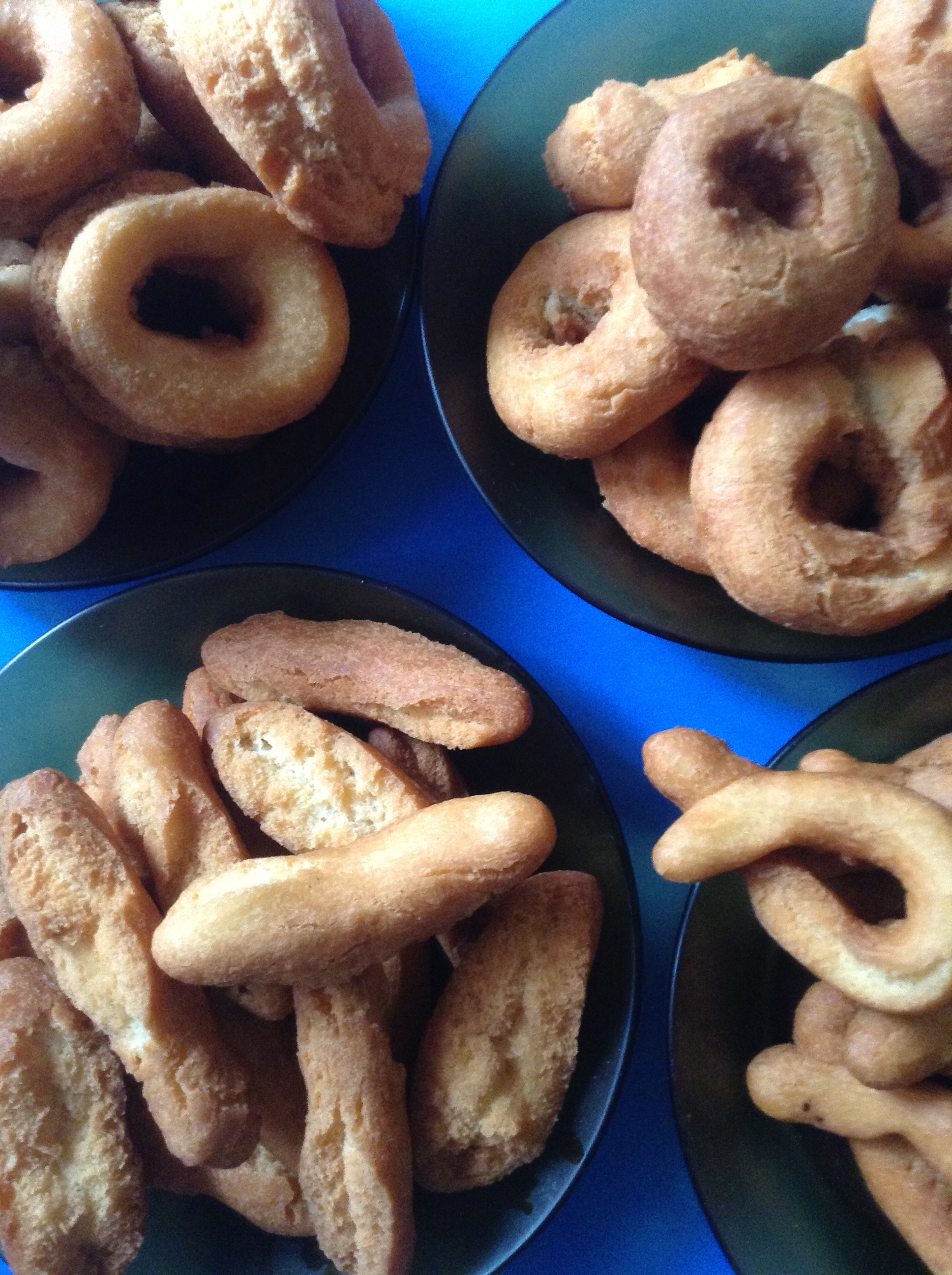 Frío las rosquillas en una cazuela con abundante aceite a fuego medio y, cuando están doradas, las voy retirando en papel absorbente. Si el aceite no está lo suficientemente caliente, las rosquillas quedarán aceitosas. Si está muy caliente, quedarán crudas.