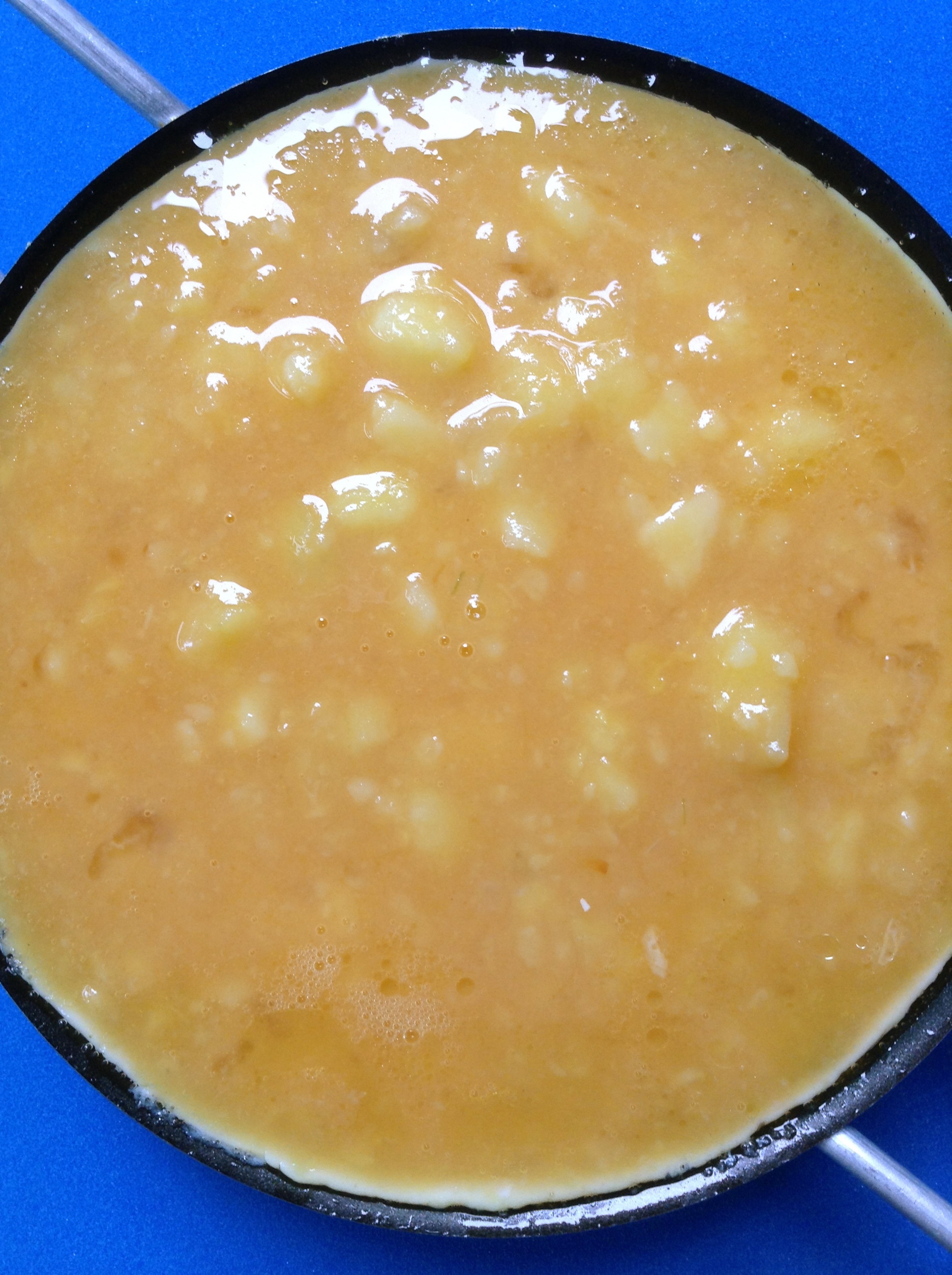 Cuando la patata está pochada, la escacho en la propia sartén, y la dejo cociendo 5 minutos más.