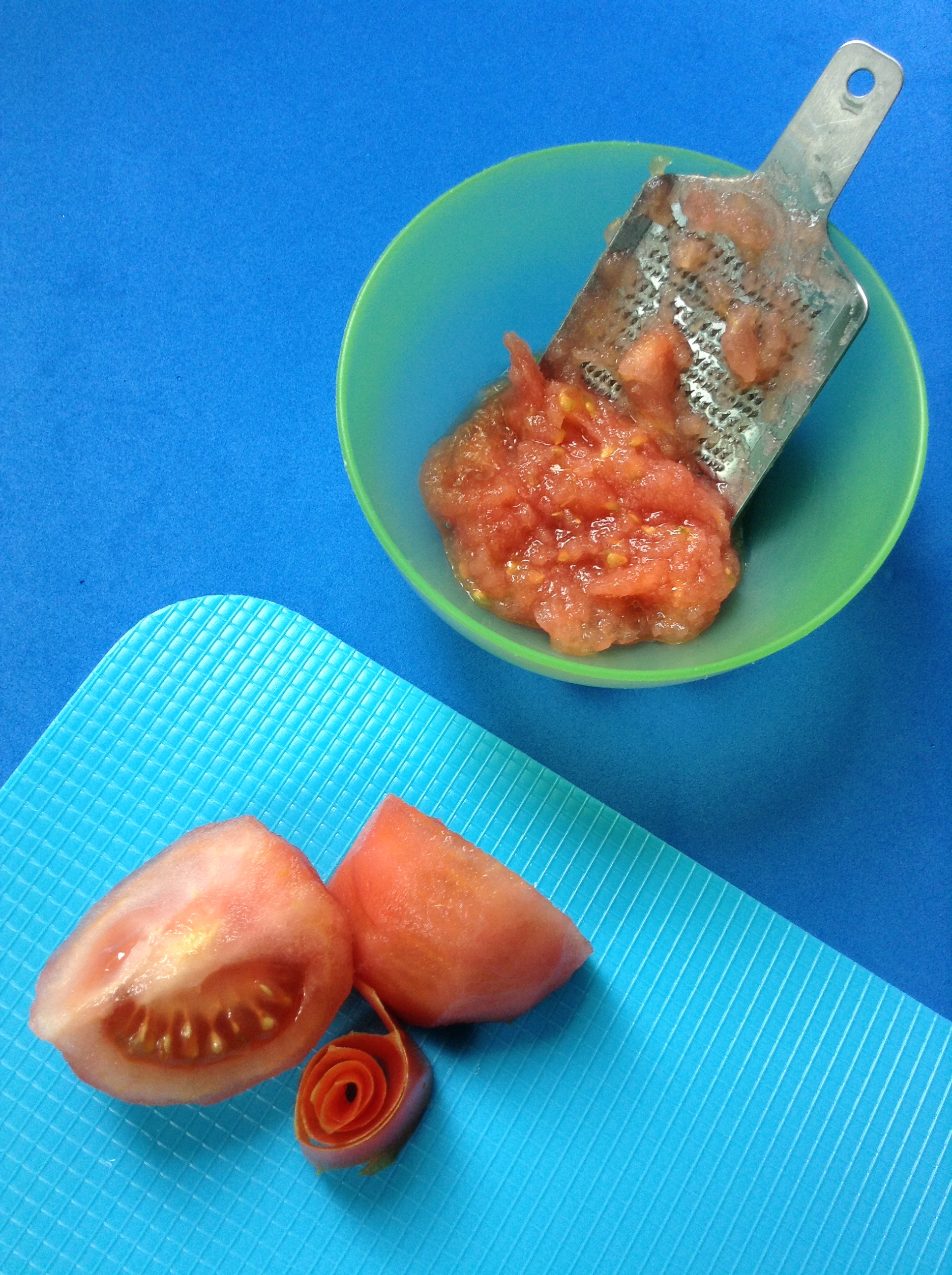Lo remuevo hasta que la carne empieza a hacerse y añado el tomate rallado o troceado.