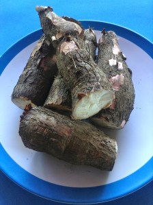 Hervir la yuca en agua con sal hasta que se ablanda (unos 30 minutos), y dejar que se seque durante bastante tiempo. En este caso, la he dejado un día entero.