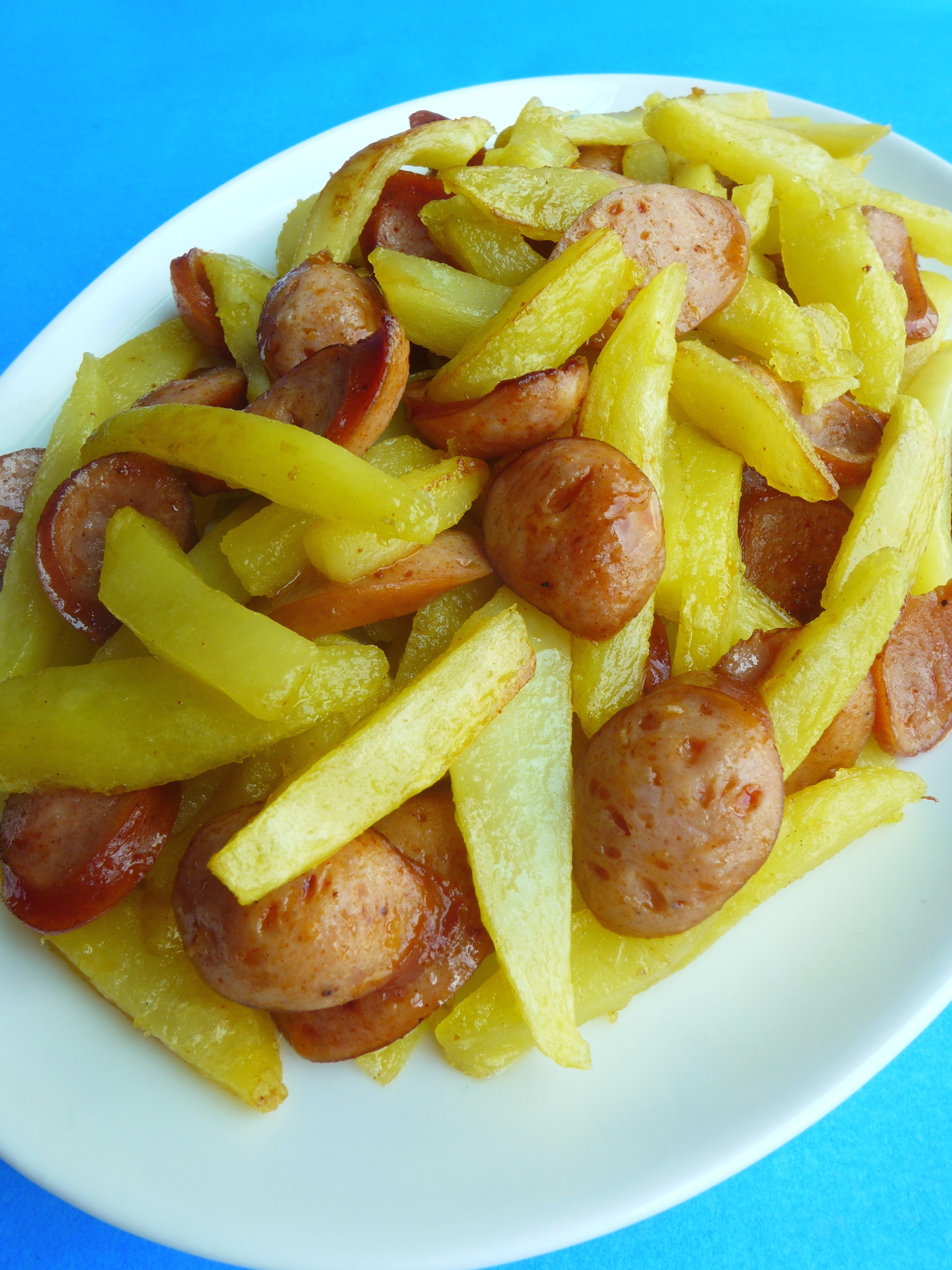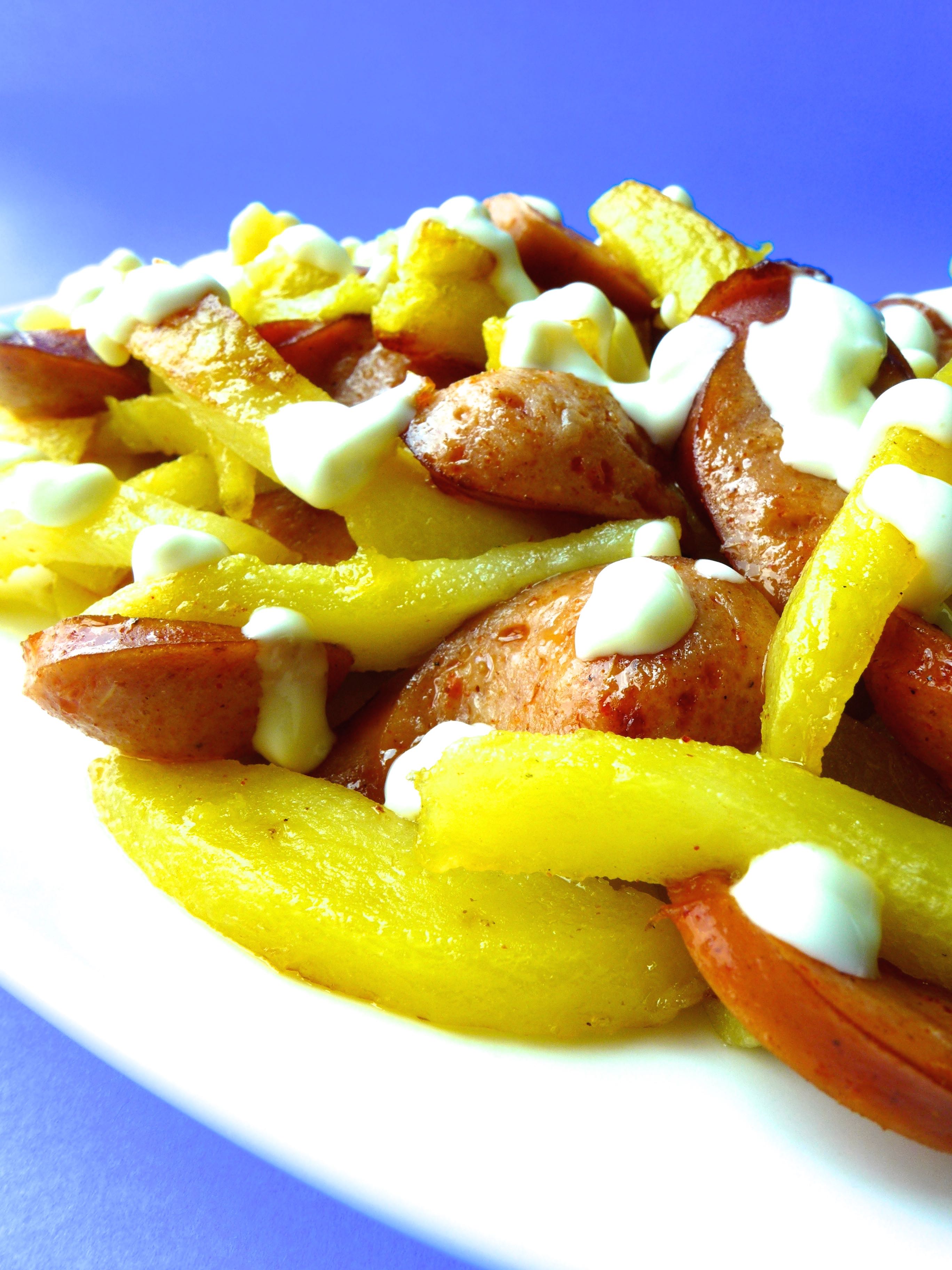 Mezclo las patatas y las salchichas, y las sirvo calientes acompañadas de un poco de mahonesa.