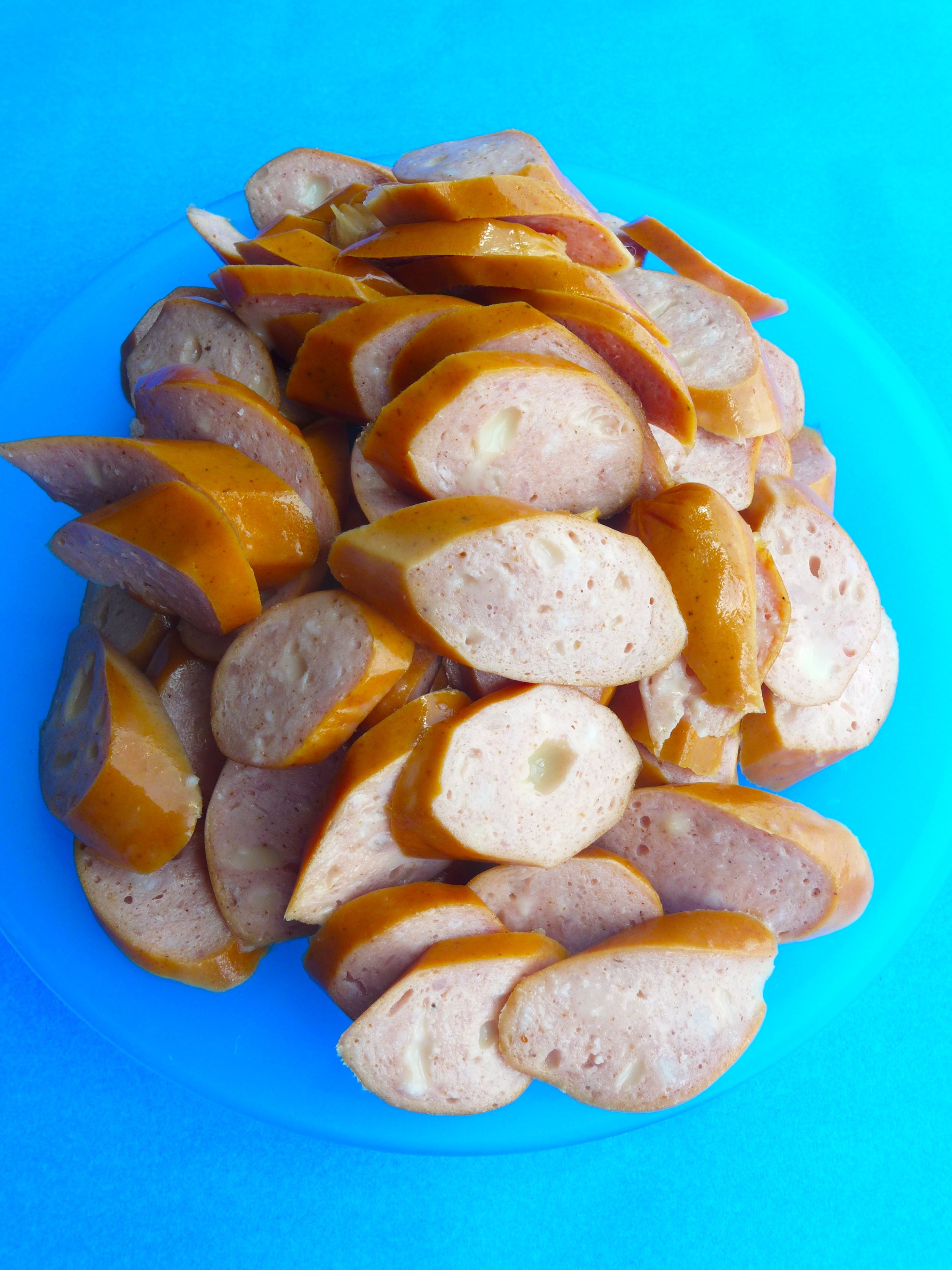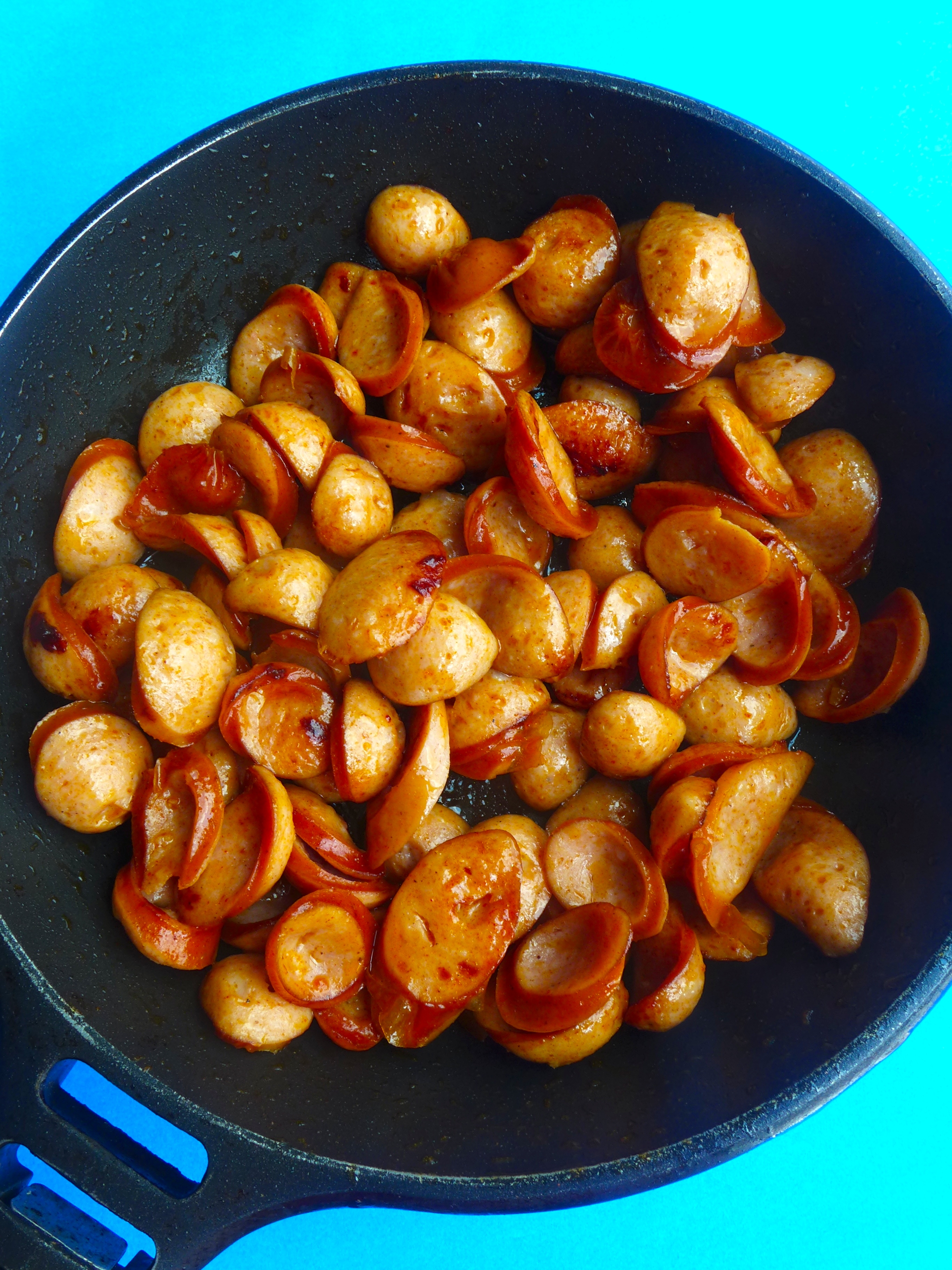 Corto las salchichas al bies y las frío rápidamente en un poco de aceite.