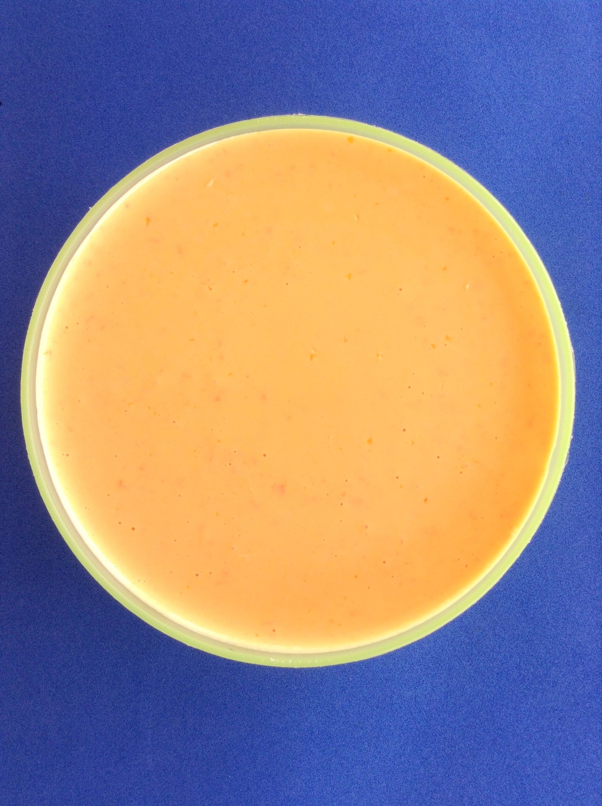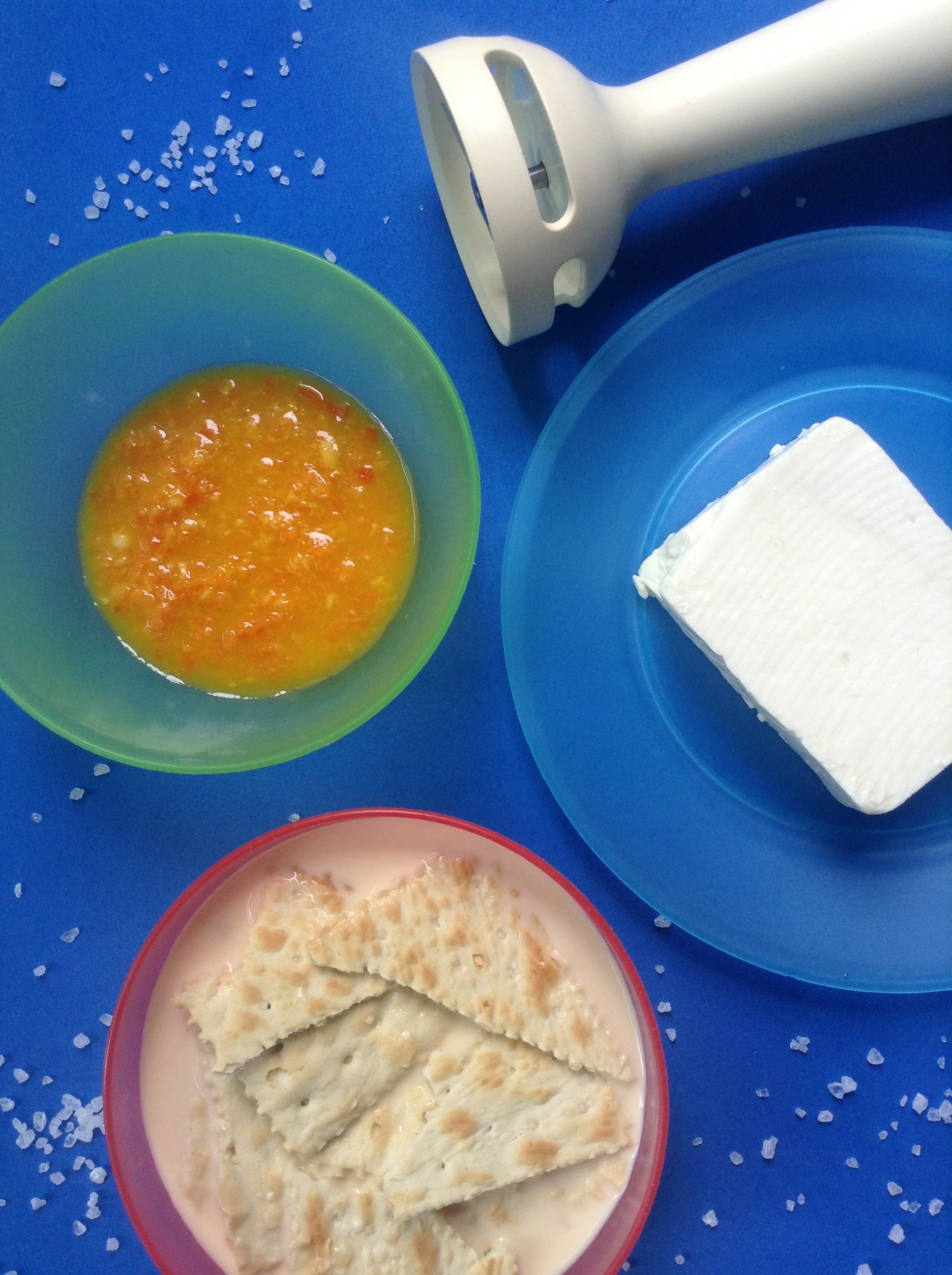 Añado sal, el queso y la leche con las galletas, y sigo batiendo hasta que quede una salsa uniforme. Si queda muy espesa, echo más leche. Si queda muy líquida, añado más galletas. Lo pruebo y rectifico de sal.
