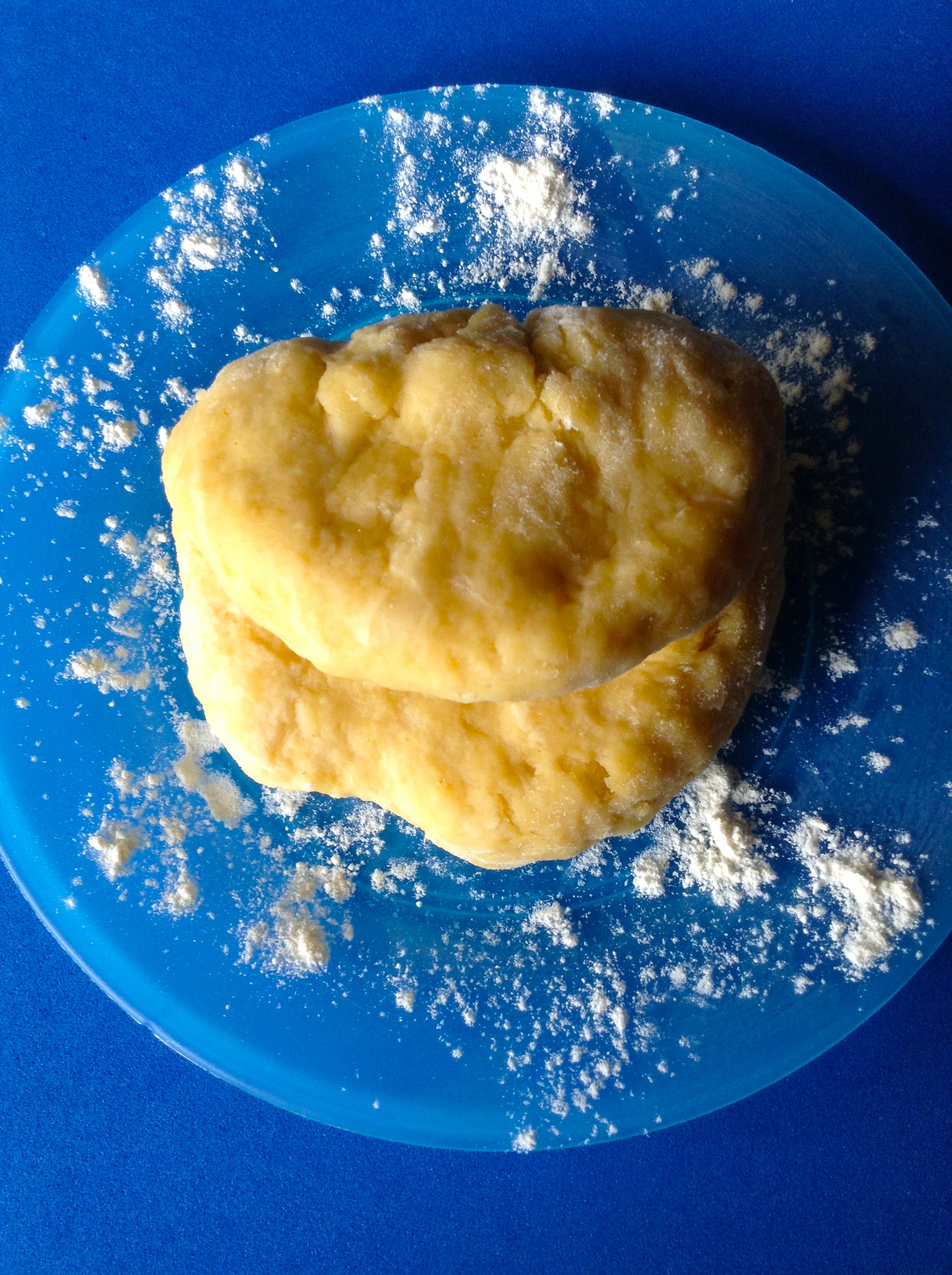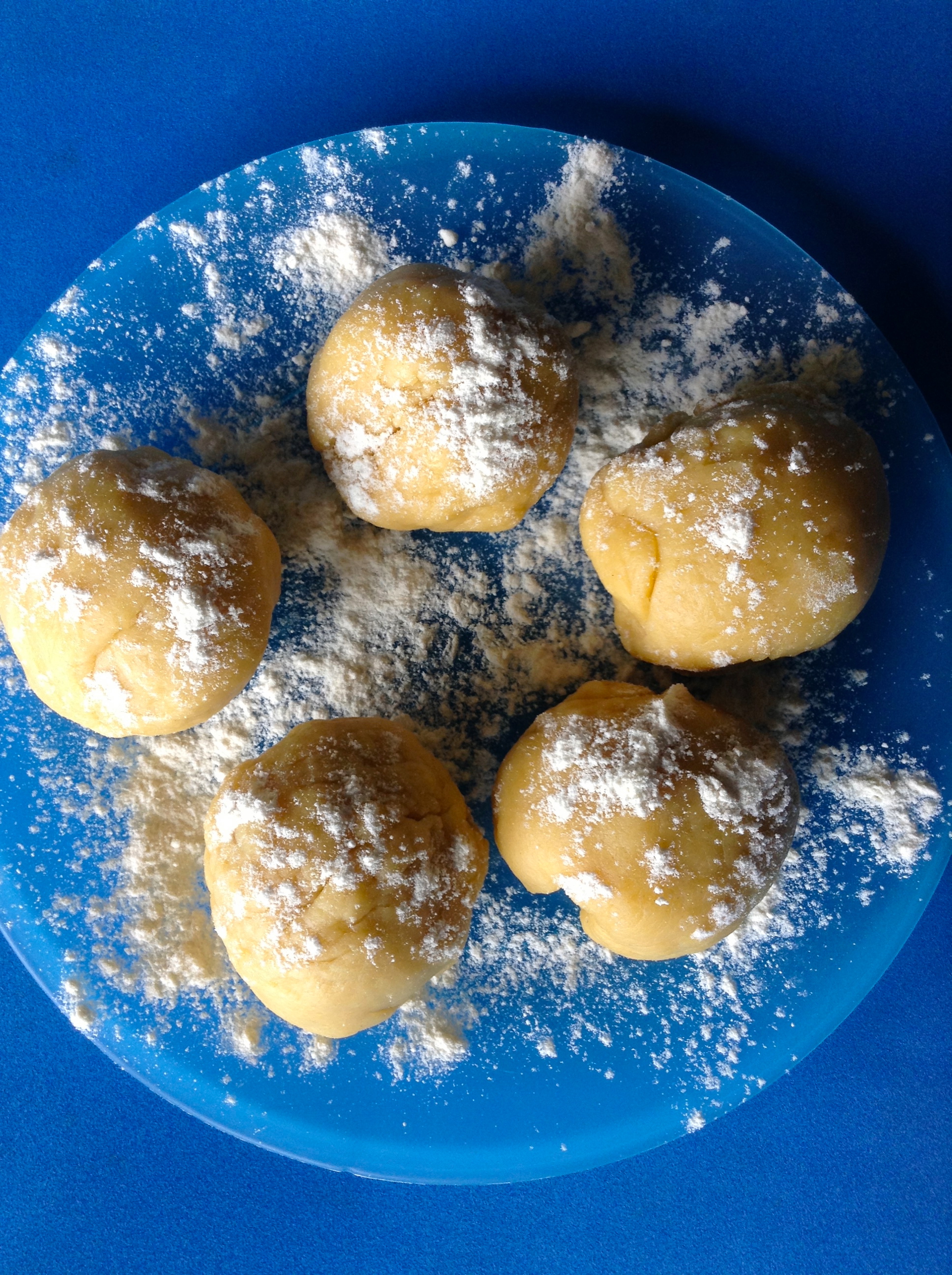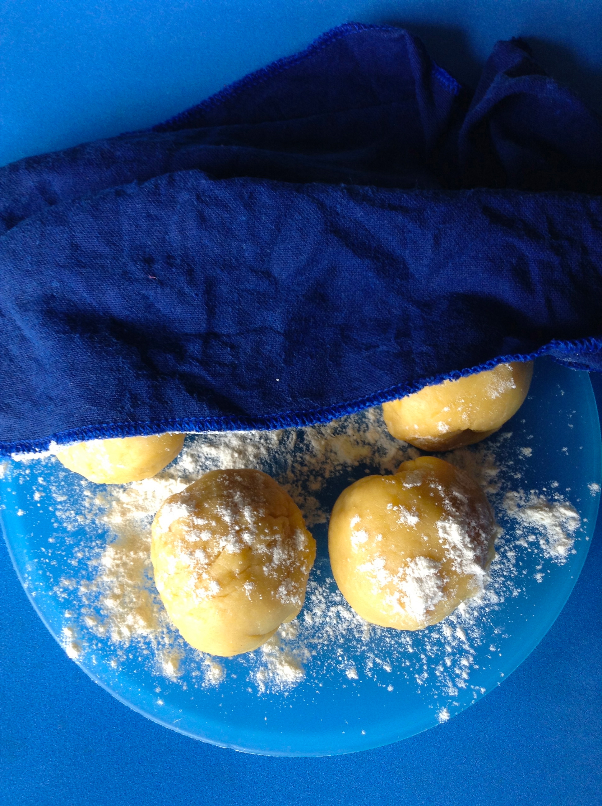 Cuando consigo una mezcla homogénea, amaso desde el centro hacia afuera, doblando cada vez por la mitad, hasta formar un bollo suave pero firme. Hago unas bolitas, las cubro con un paño húmedo y lo dejo reposar de 15 a 30 minutos.