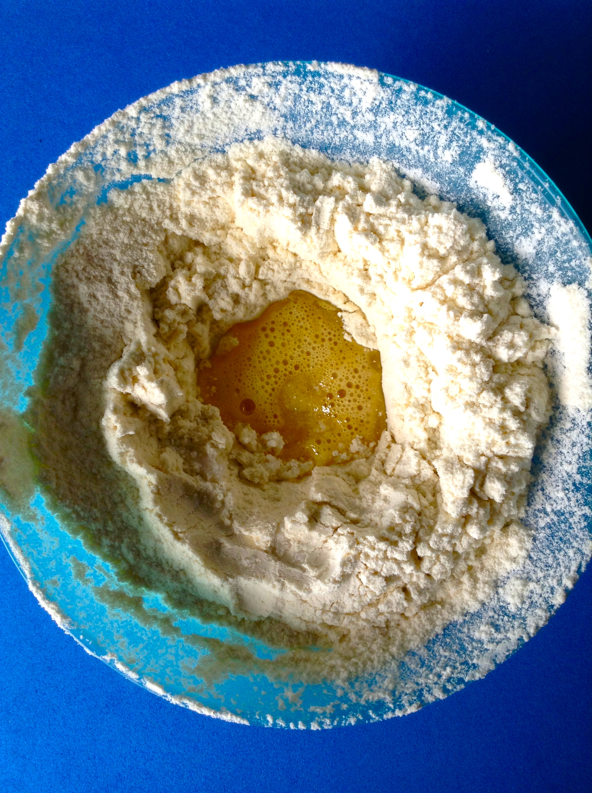 Primero tamizo la harina, la mezclo con la sal y la coloco en forma de volcán. Bato los huevos y los vierto en el centro junto con el aceite de oliva.