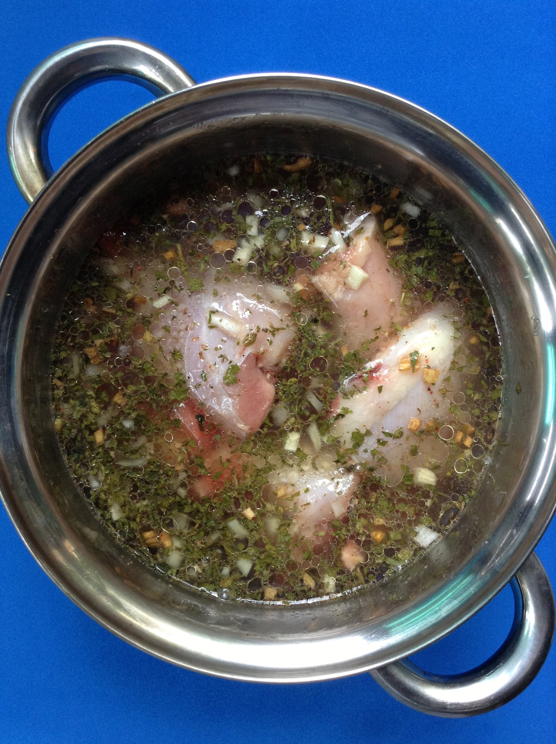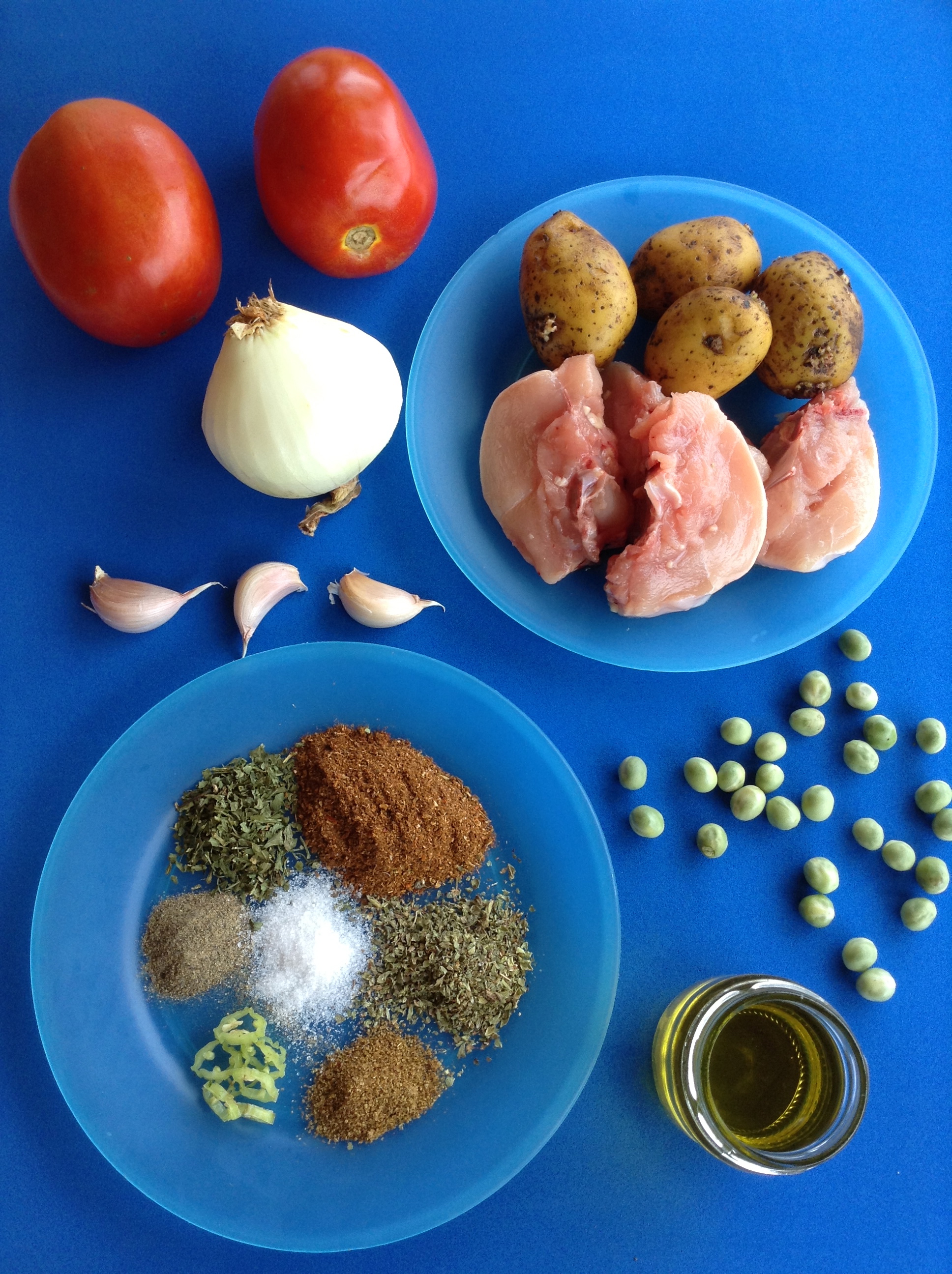 En una cazuela profunda pongo todos los ingredientes, excepto las papas y las arvejas, y añado agua hasta cubrirlos.