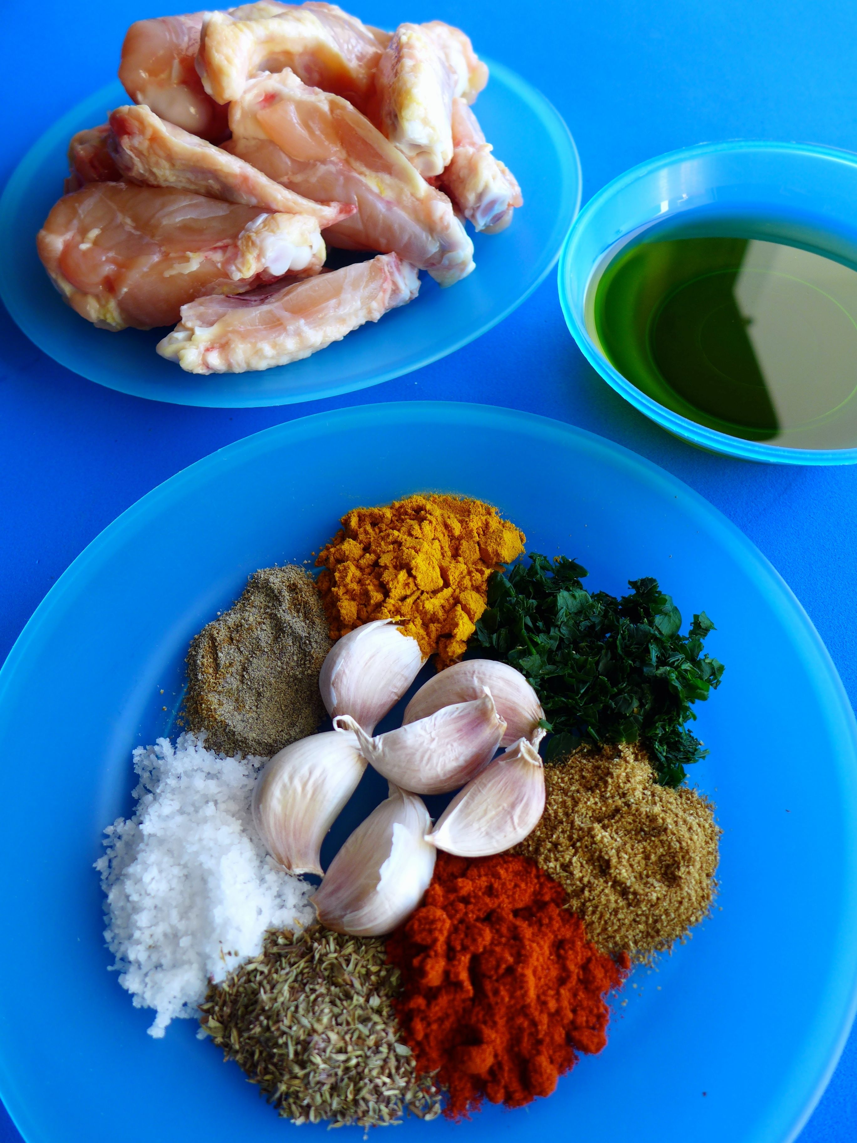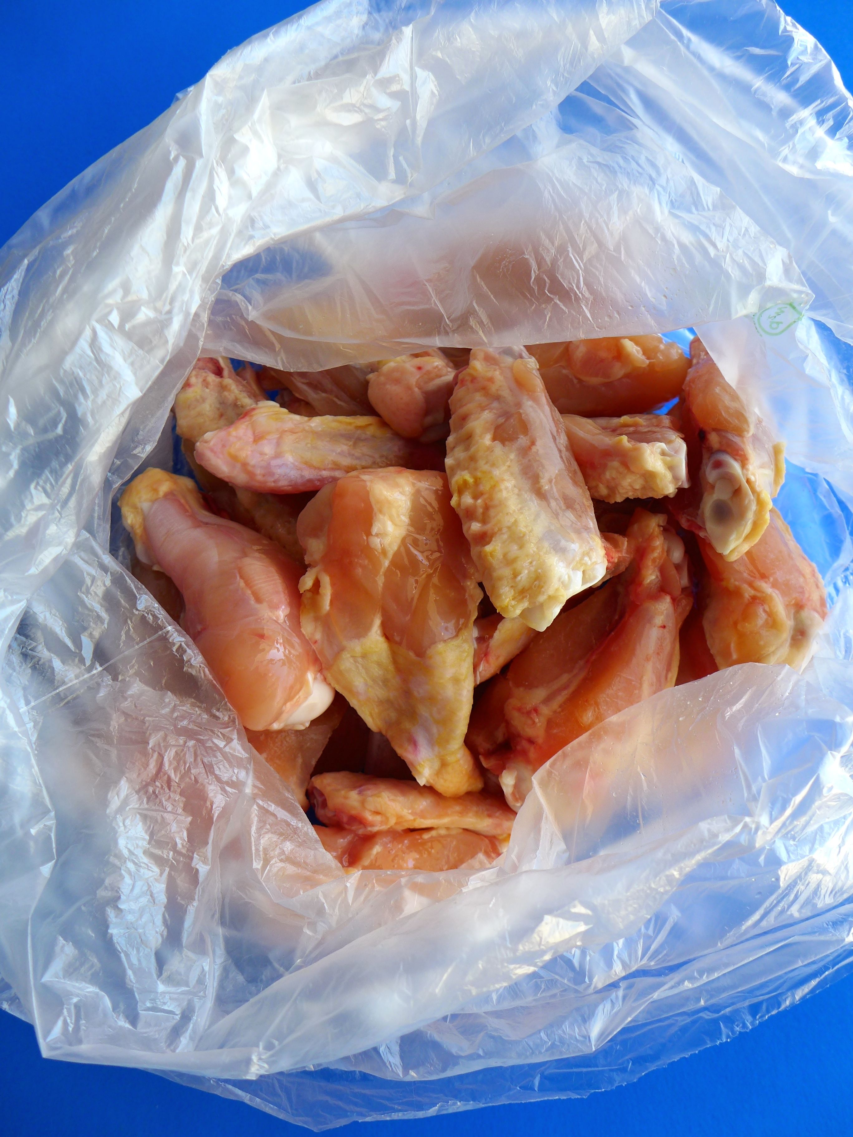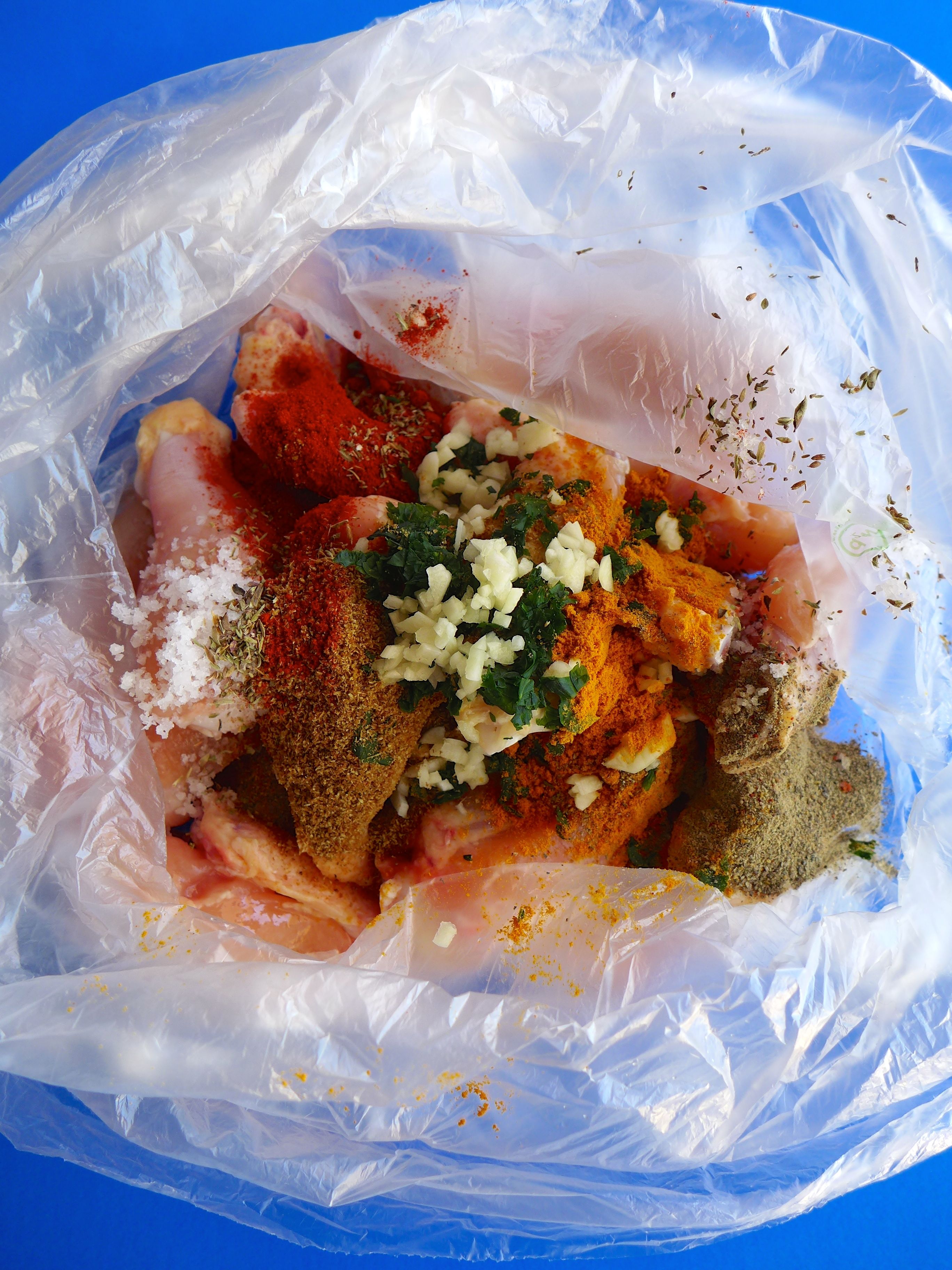 Meto todos los ingredientes en una bolsa de plástico y la anudo. Meneo la bolsa para que las alitas se impregnen del aceite, el ajo, las hierbas y las especias. Si tengo tiempo, lo dejo reposar durante unas horas para que el pollo coja en mayor medida el sabor y aroma de los condimentos.