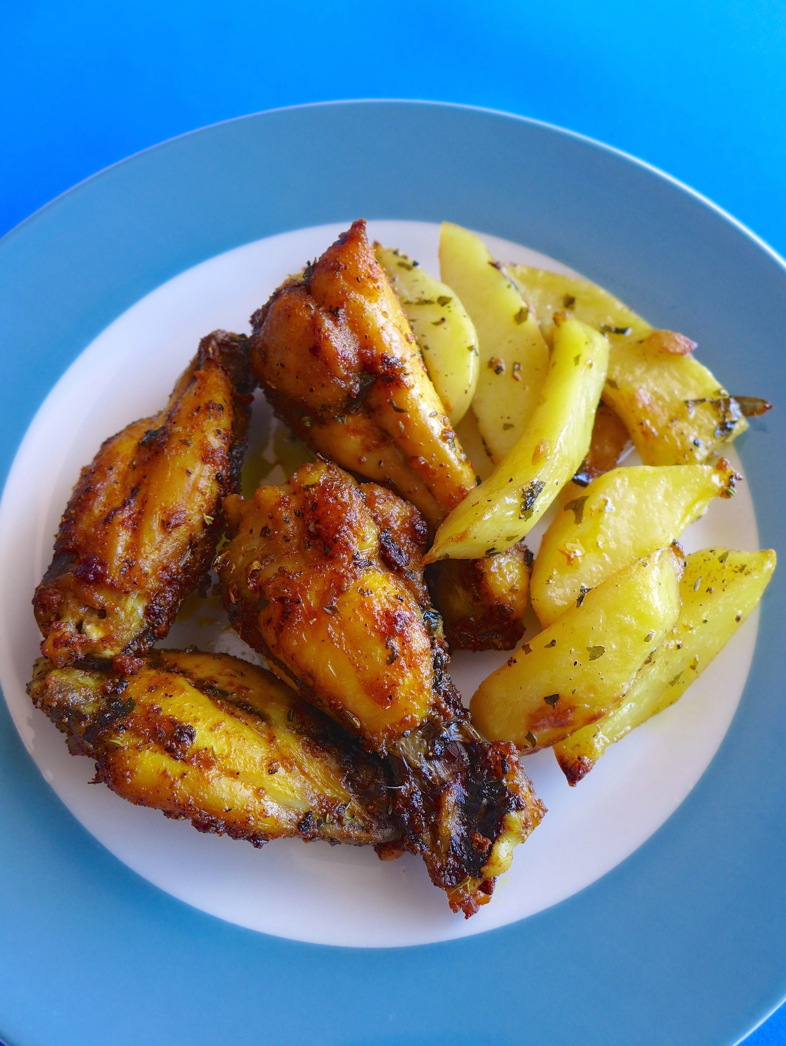 Sirvo las alitas muy calientes acompañadas de patatas fritas.