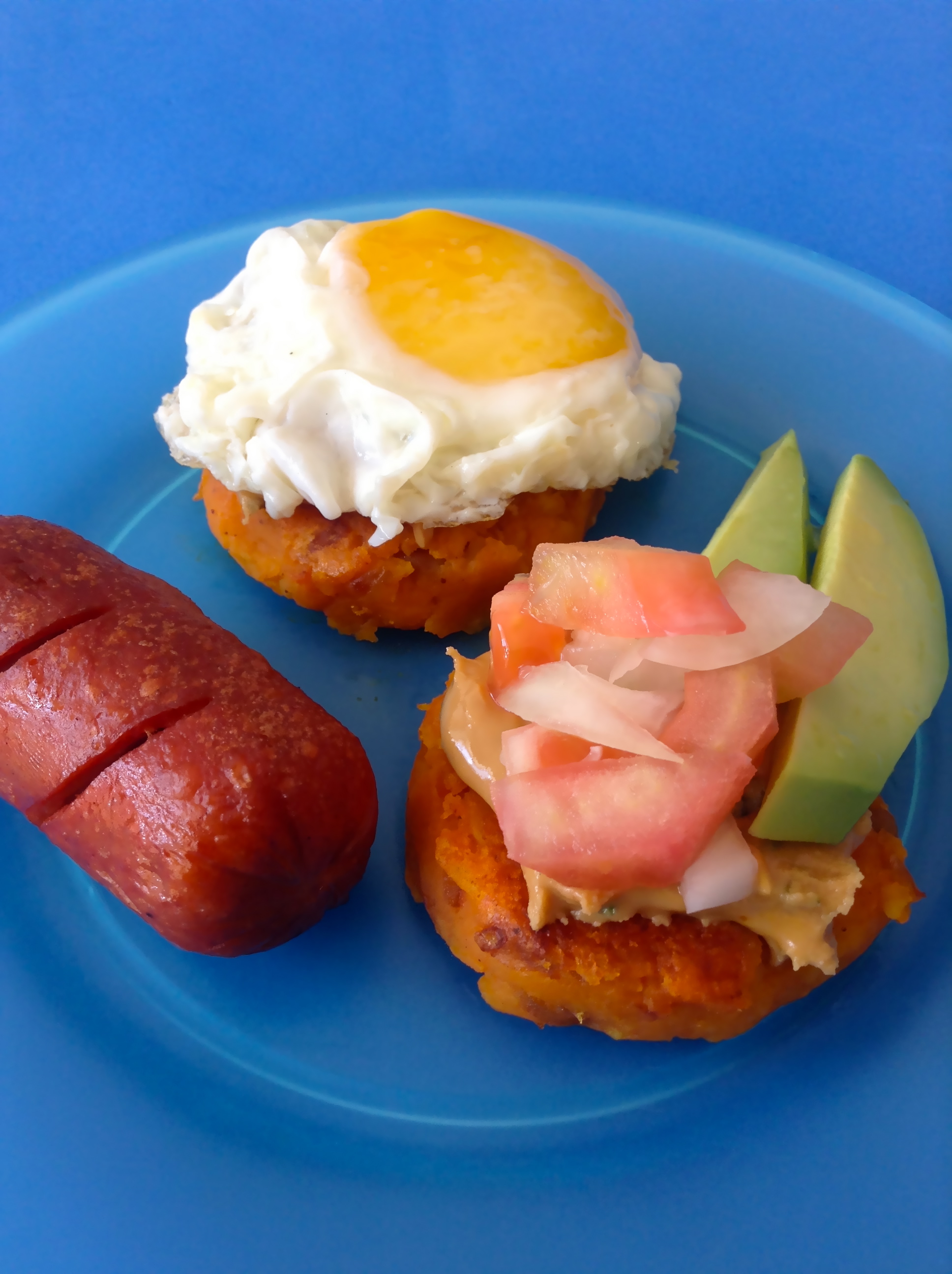 Decoro el plato con tiras de aguacate, una cucharada de encurtido, el chorizo, el huevo frito y, a veces, lechuga.