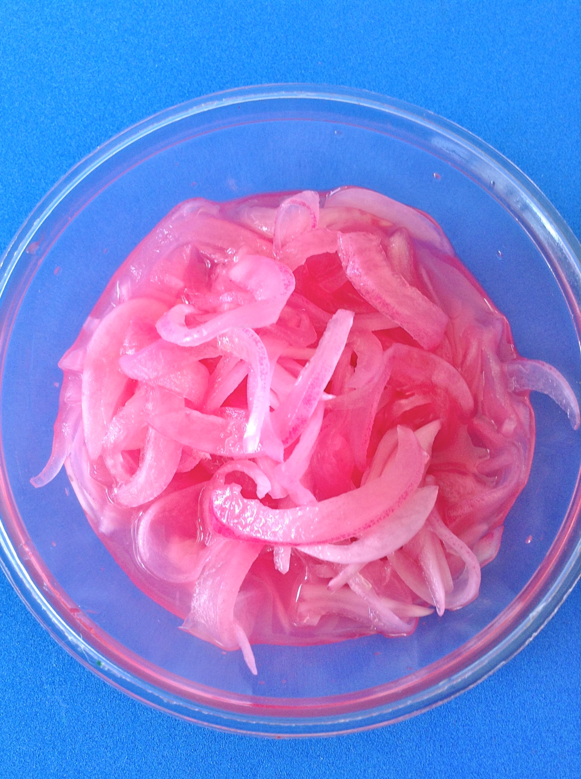Y el otro con cebolla roja partida en juliana muy fina y aliñada con lima, sal y azúcar. Meto los dos boles en la nevera y lo dejo reposar por lo menos 1 hora. El encurtido de cebolla roja adquiere una tonalidad más rosada cuánto más tiempo esté marinando.