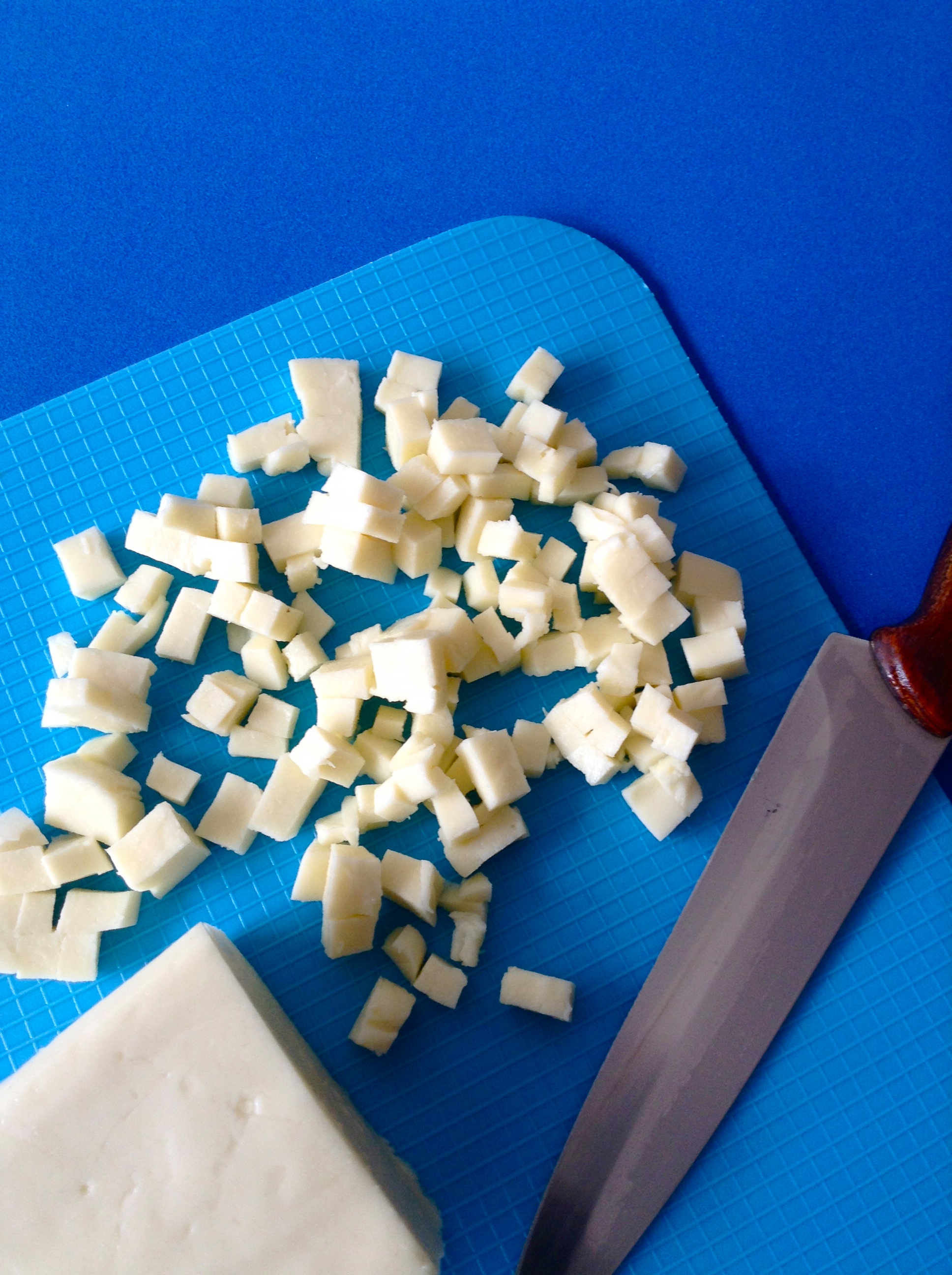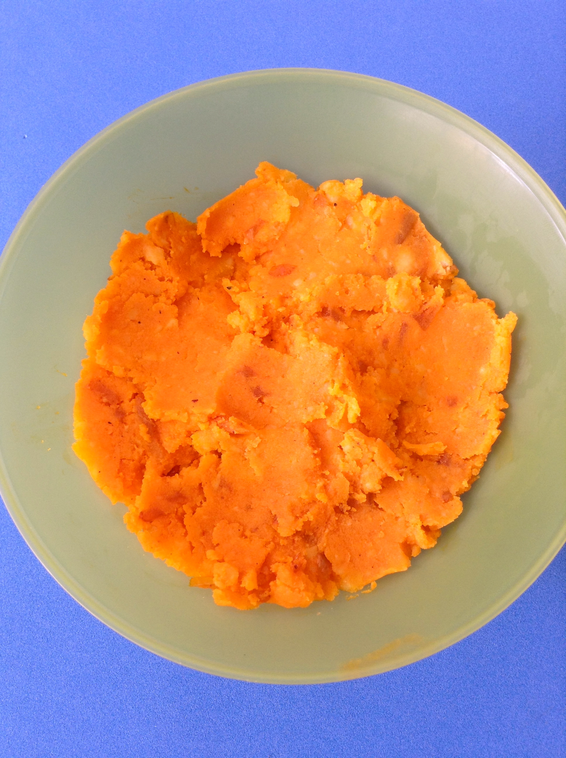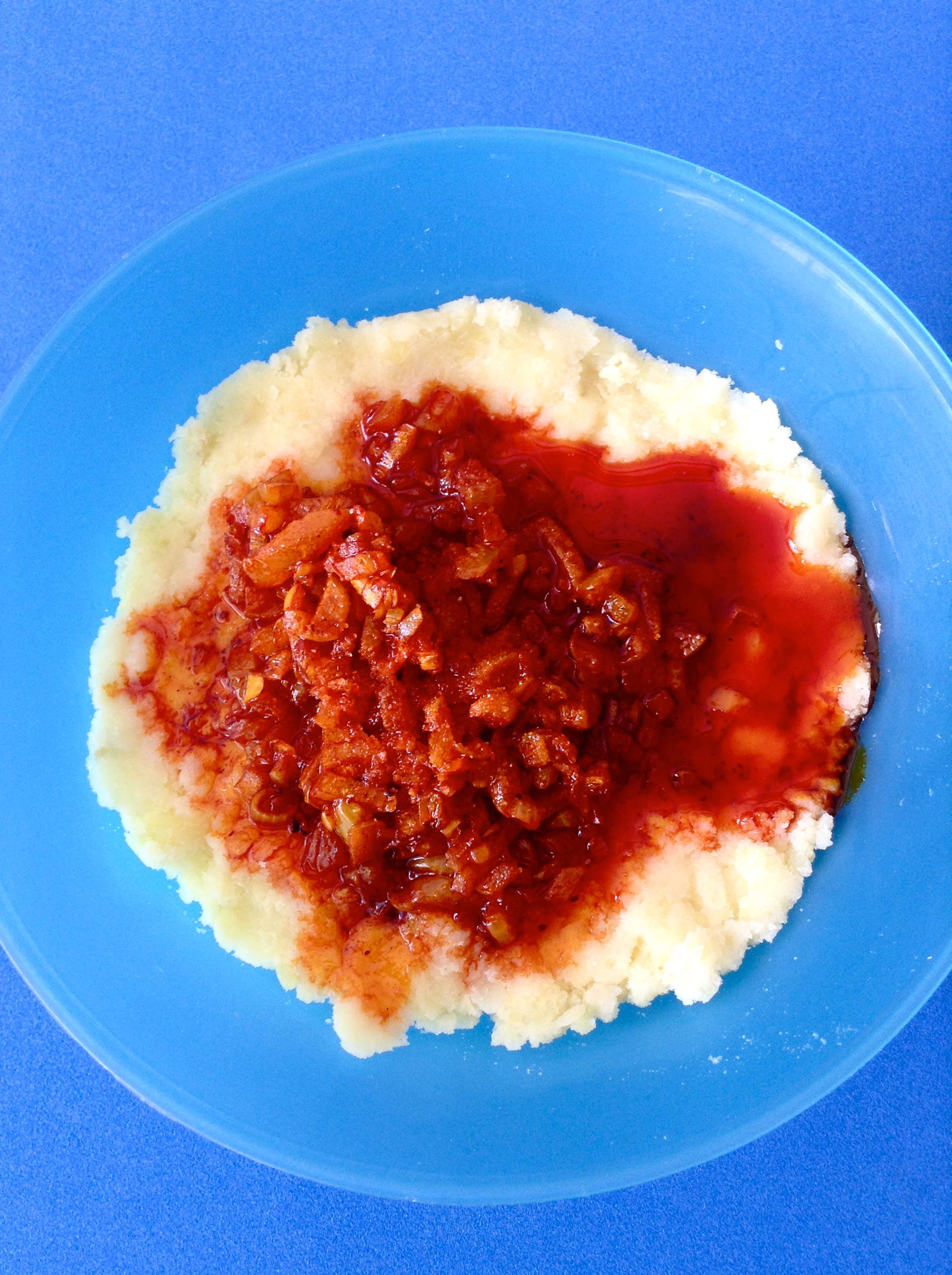 Cuando las papas están blandas, las pelo y las escacho hasta formar un puré. Luego lo mezclo con la cebolla rehogada.