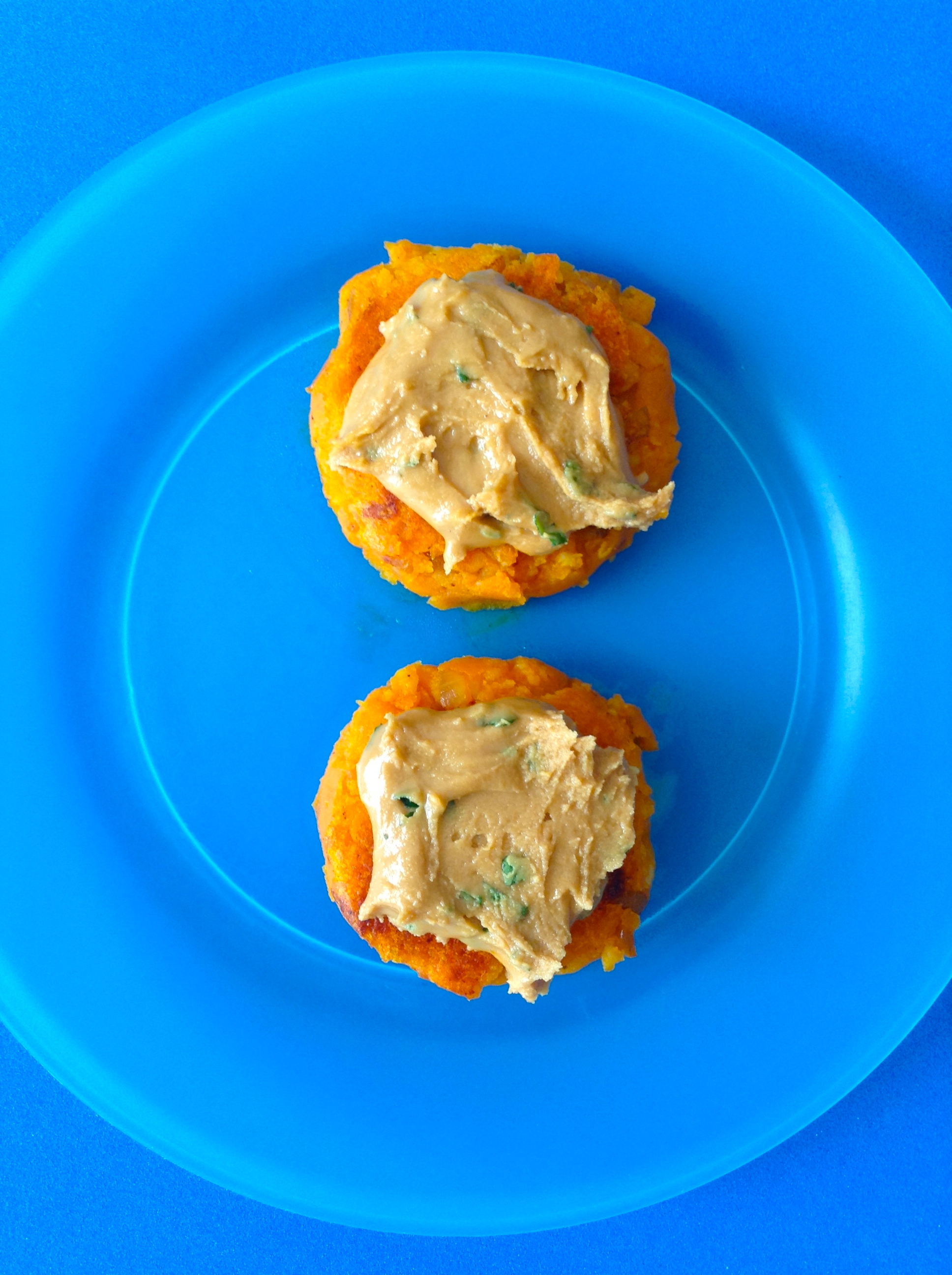 Pongo las tortillas tostadas en un plato, las cubro de crema de maní.