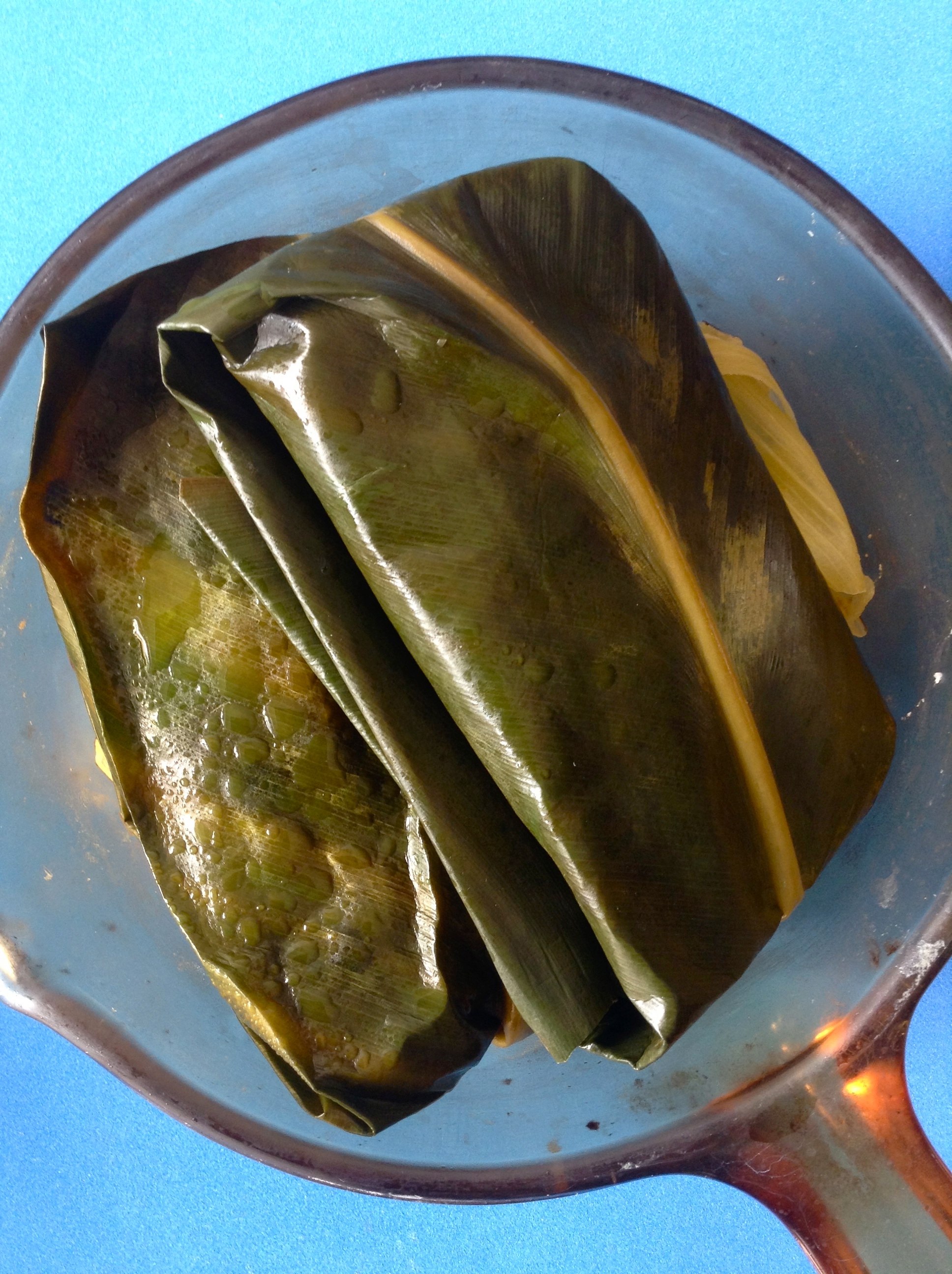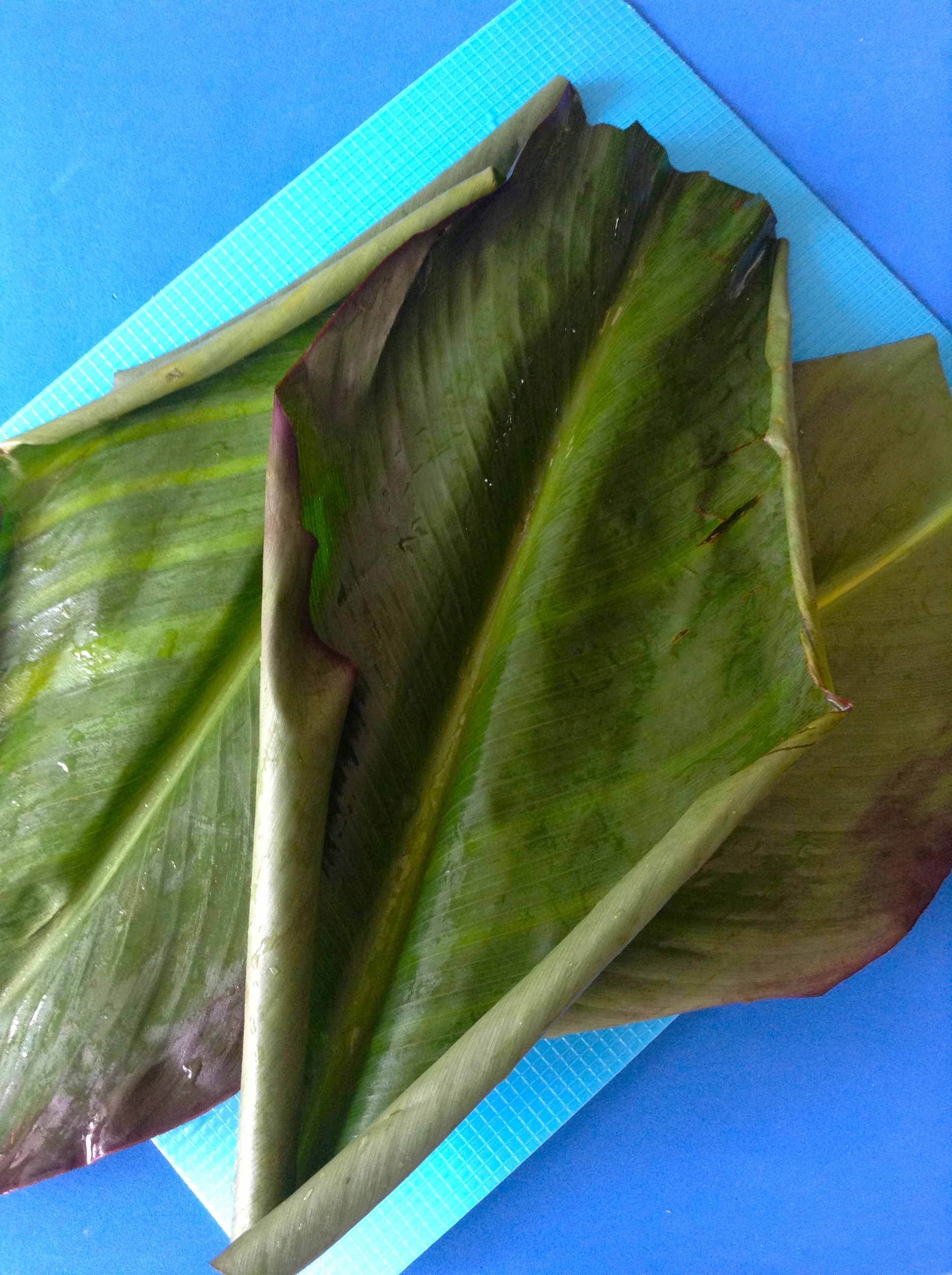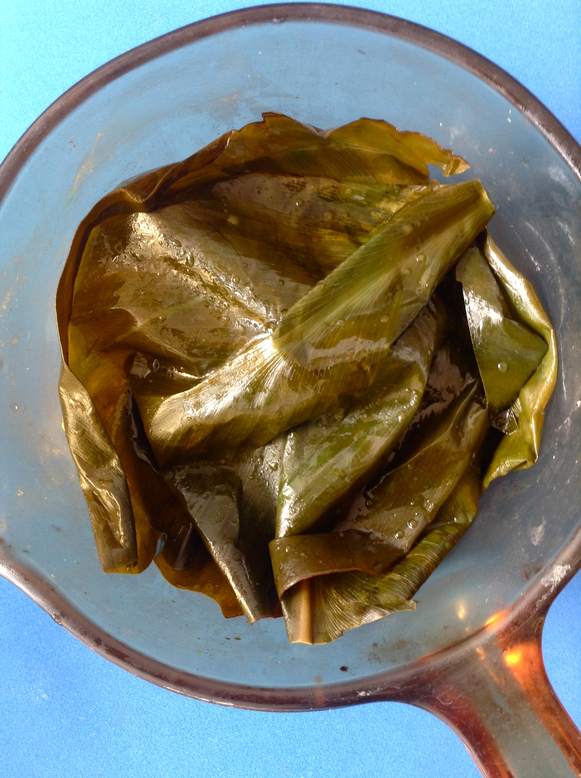 Lavo las hojas de achira y las escaldo durante un par de minutos en agua hirviendo.