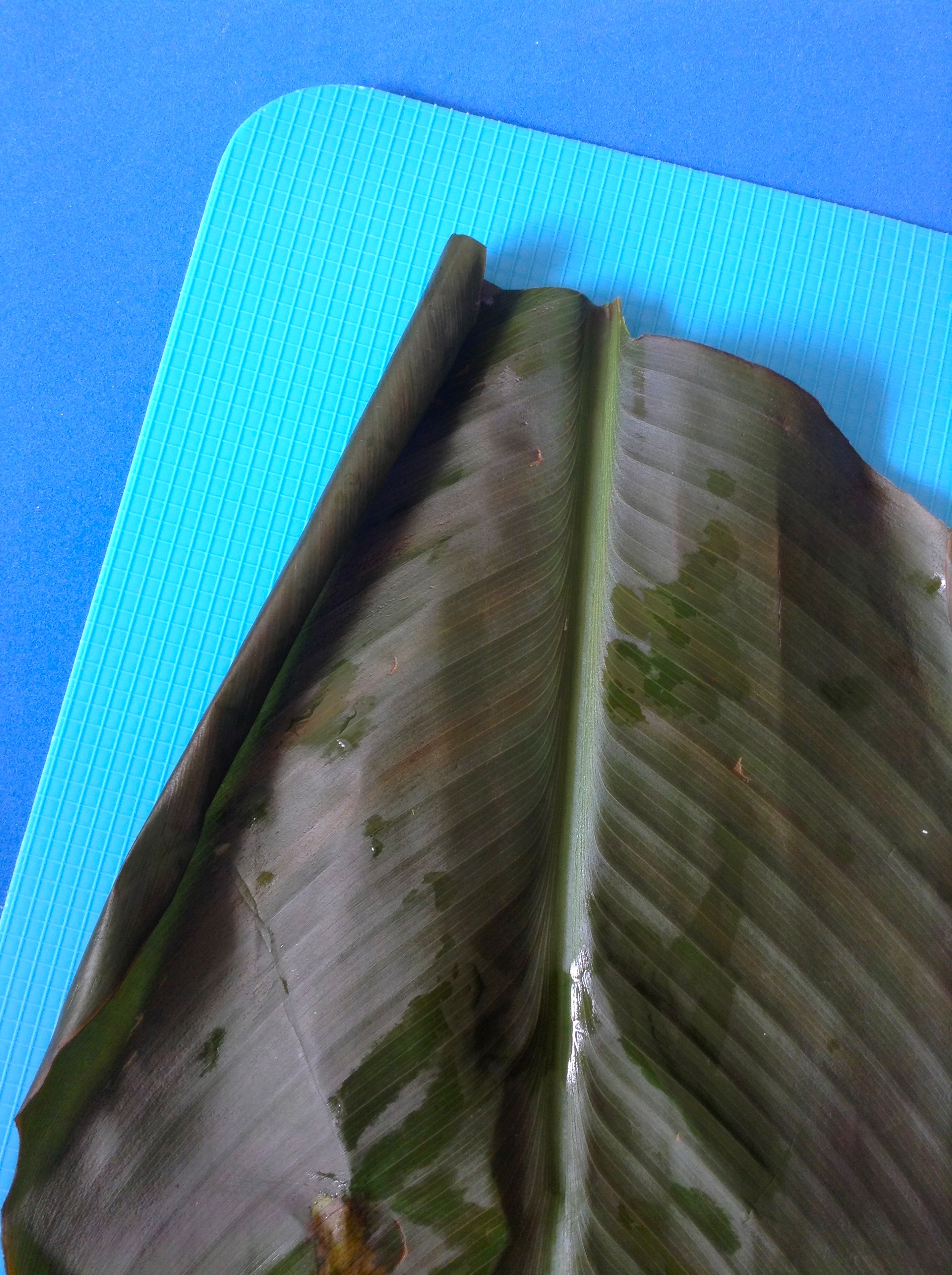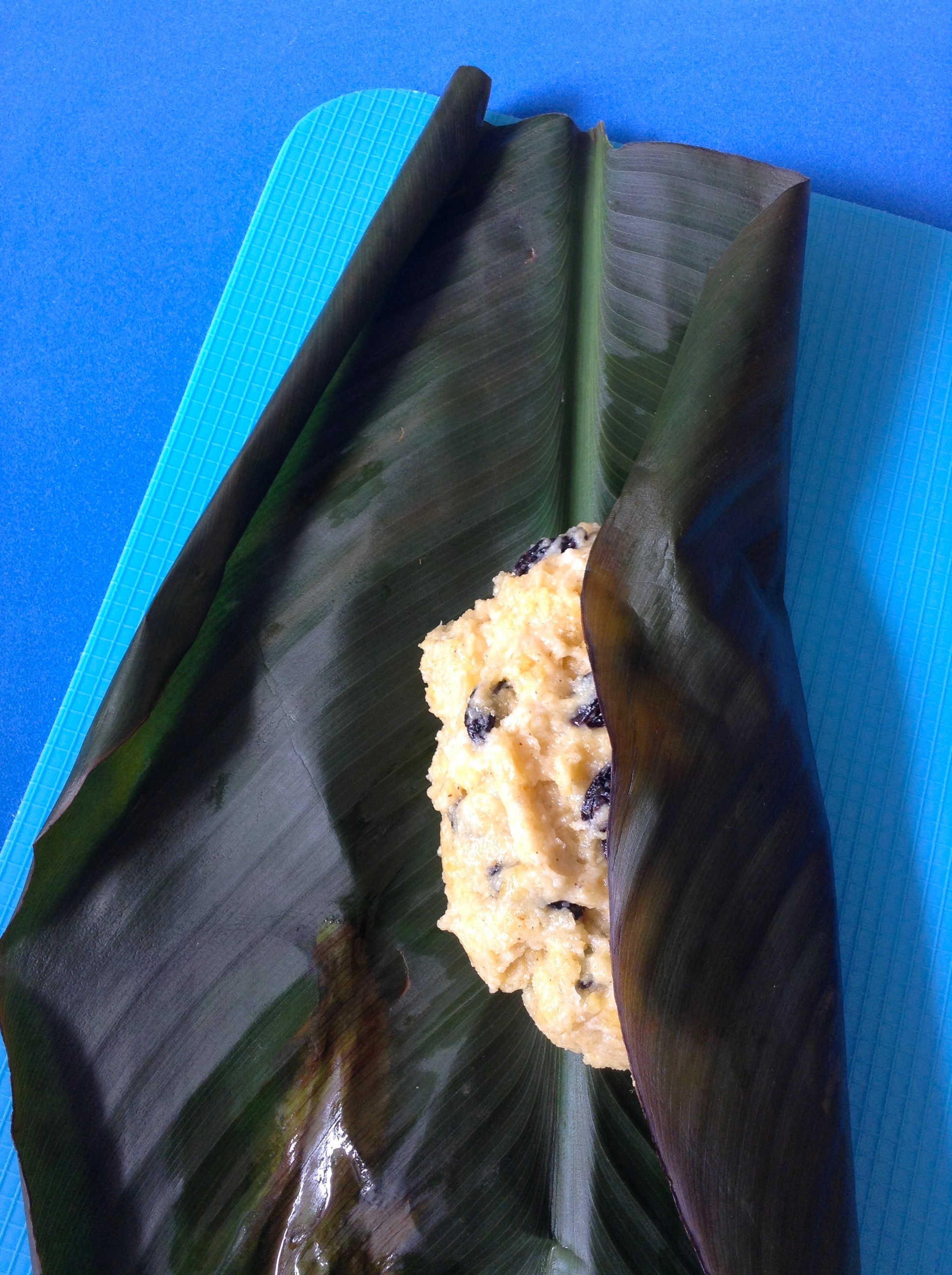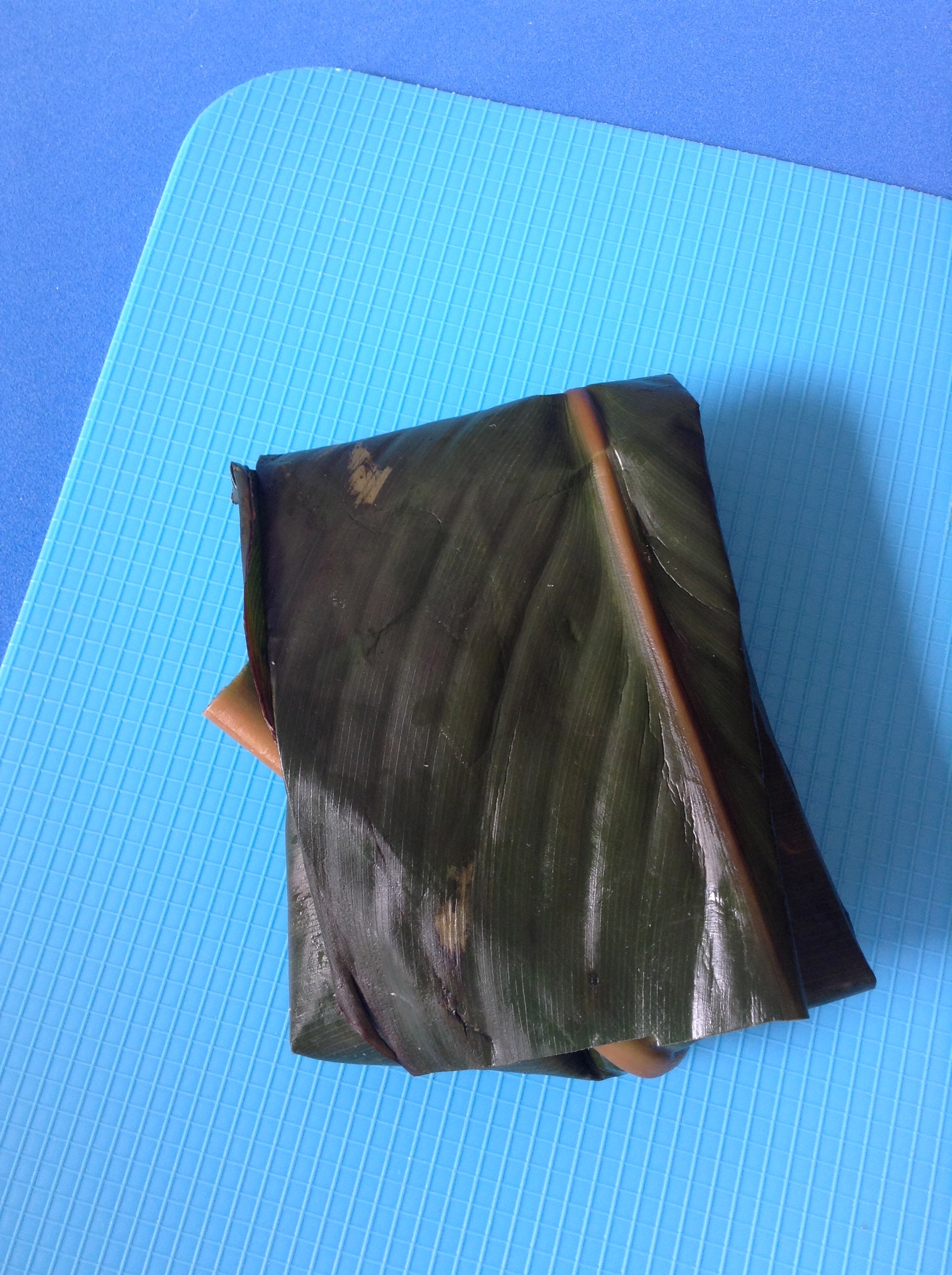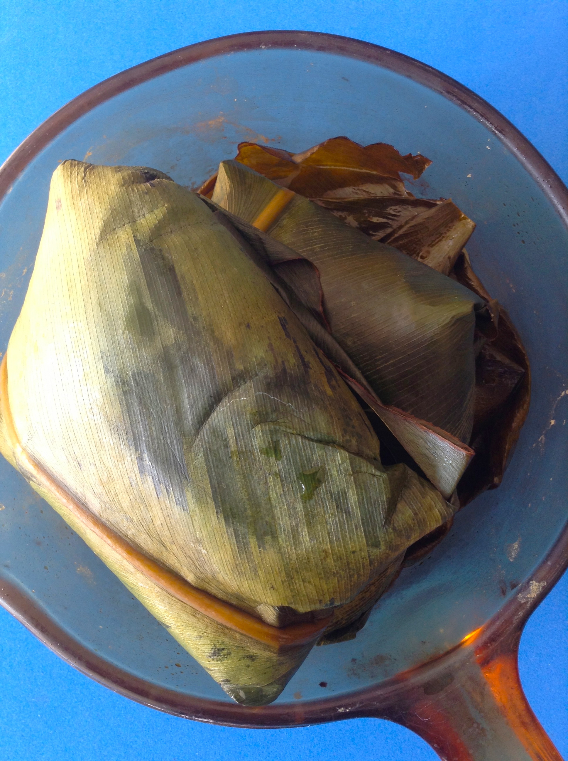 Lavo las hojas de achira y las escaldo durante un par de minutos en agua hirviendo.