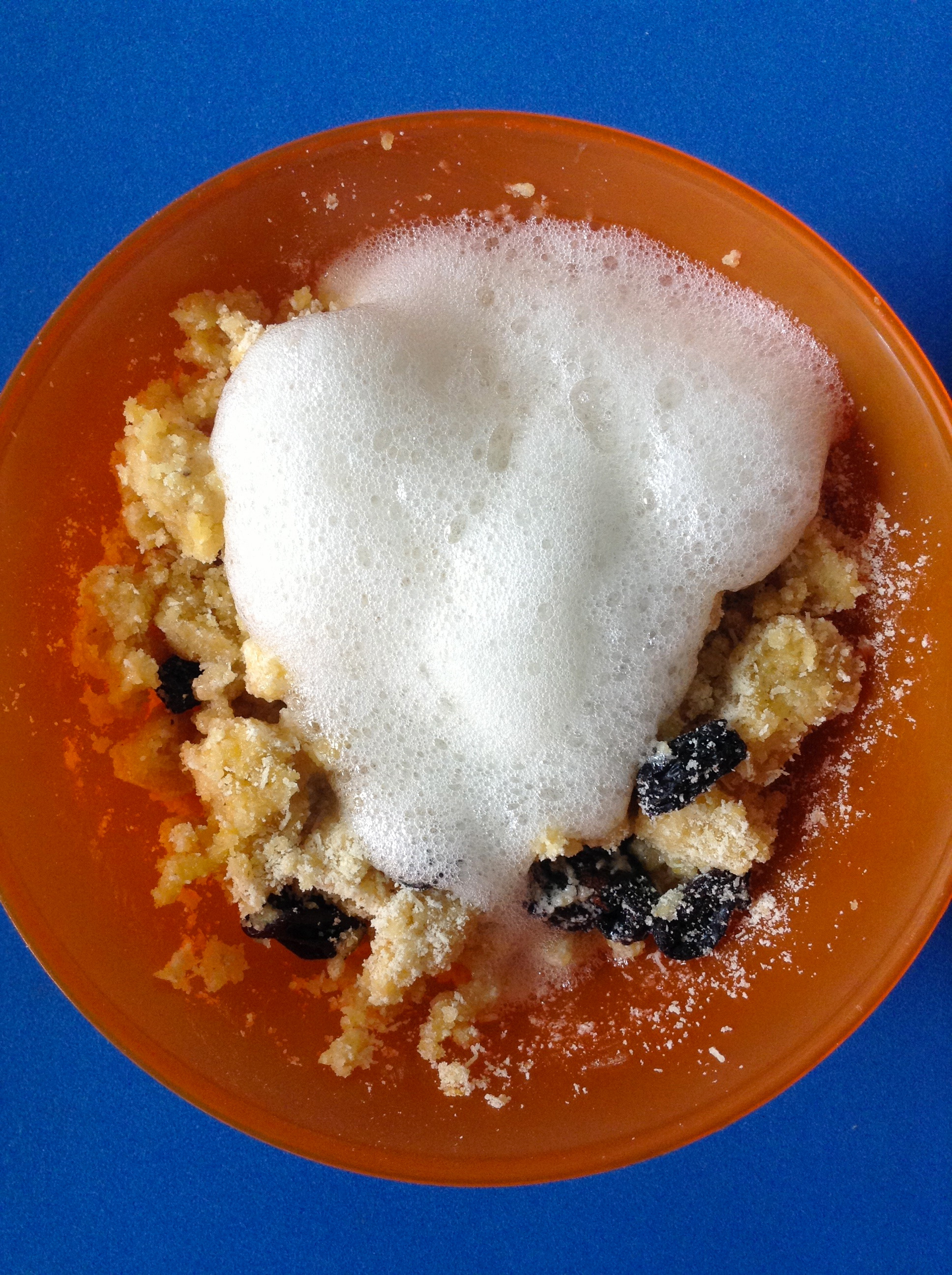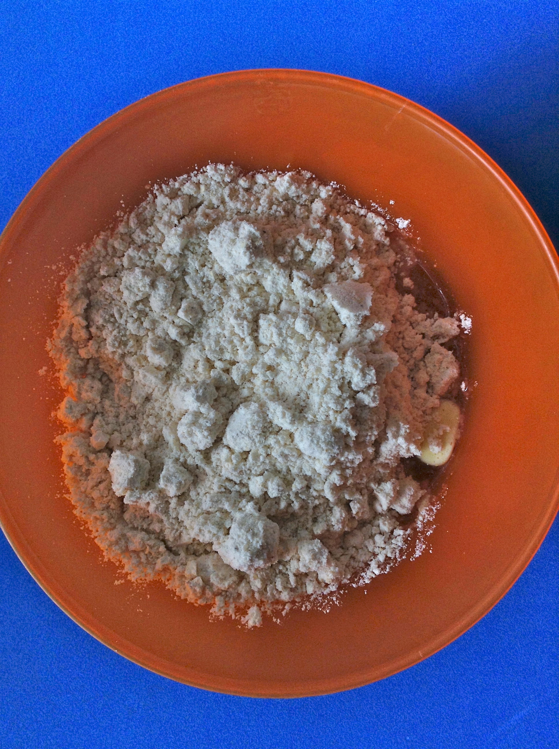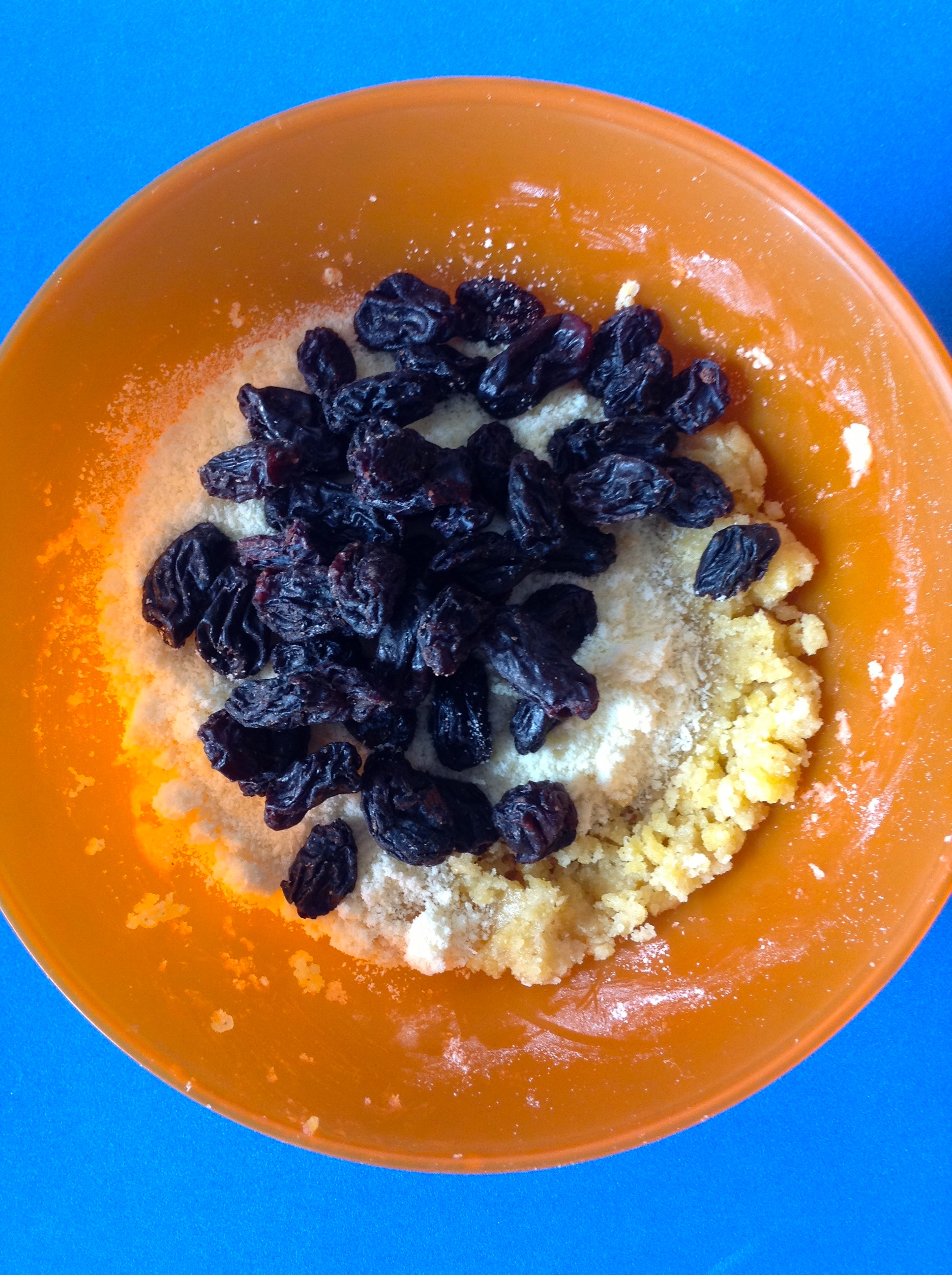 Añado sucesivamente la harina, la mantequilla, el queso rallado y las pasas, y lo voy removiendo.
