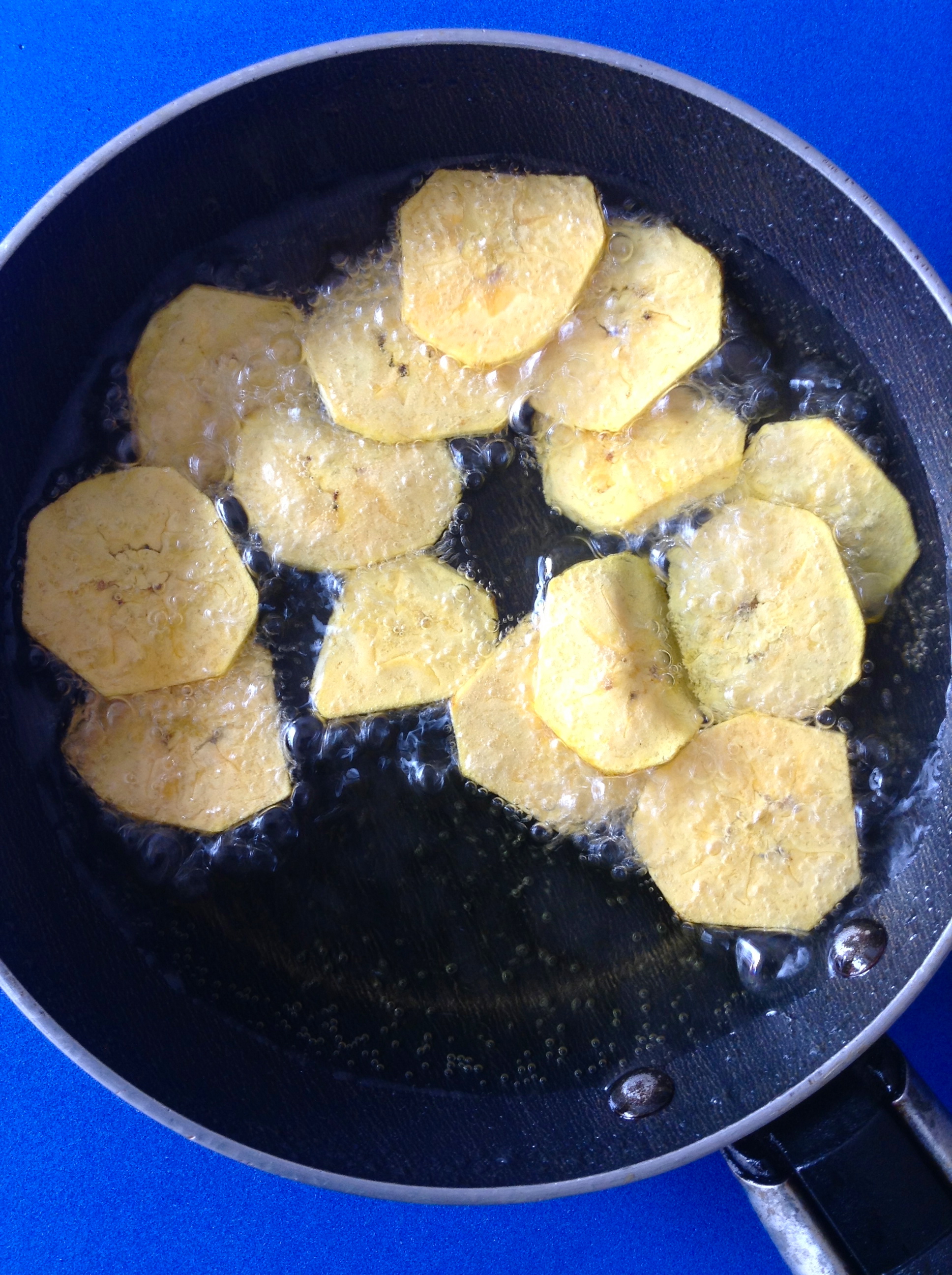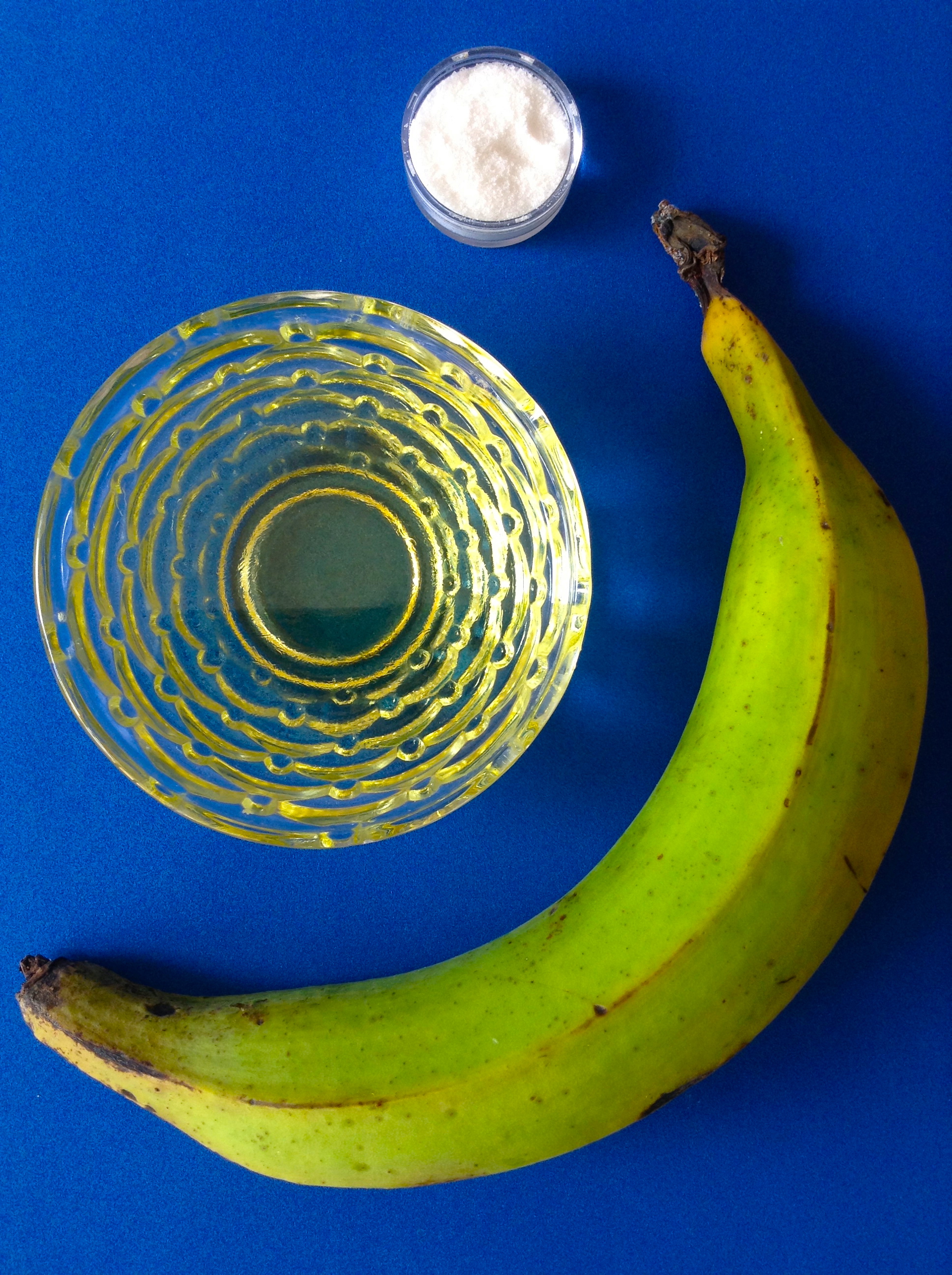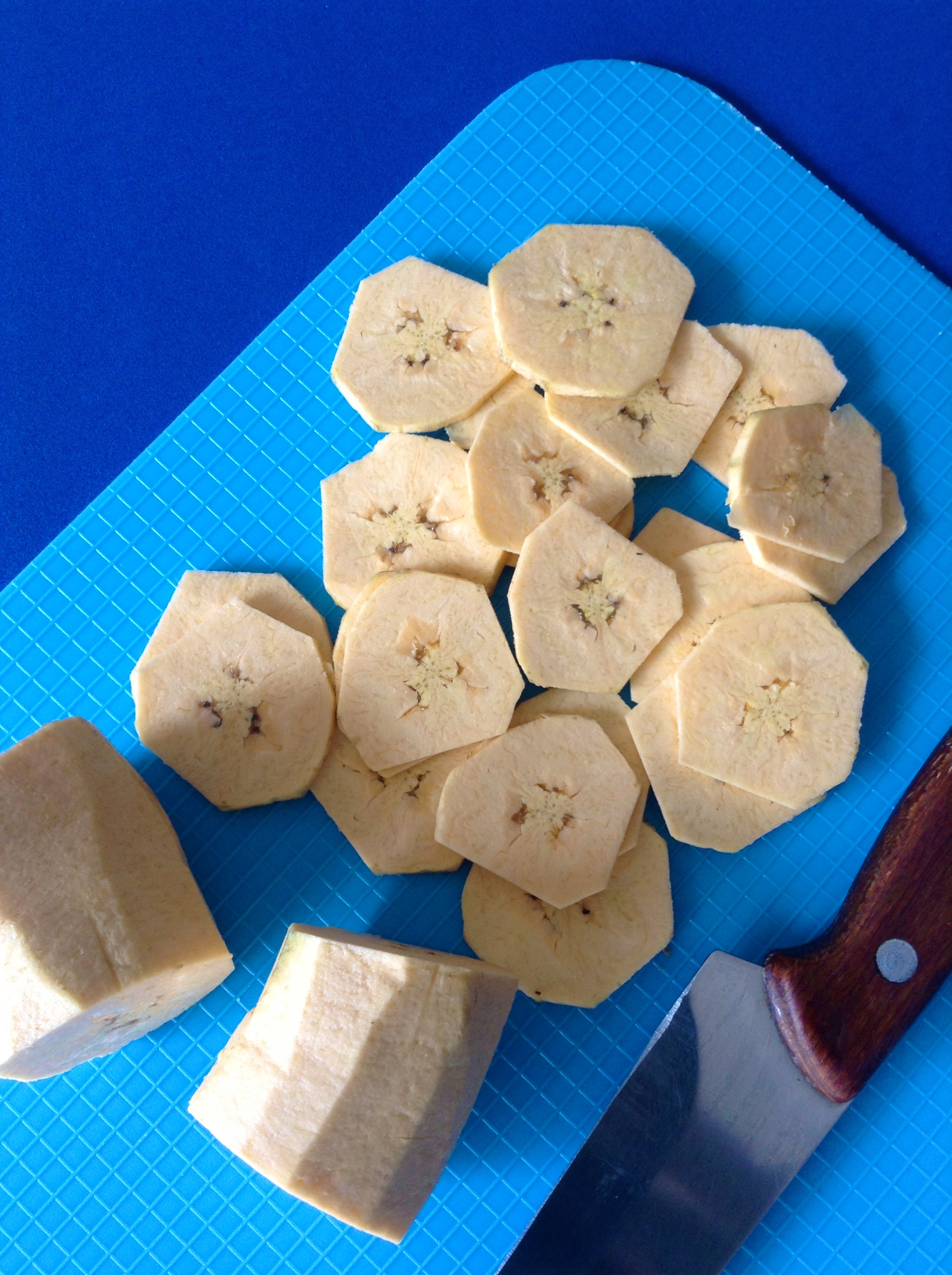Para preparar los chifles salados, quito la piel al verde y lo parto en rodajas finas.
