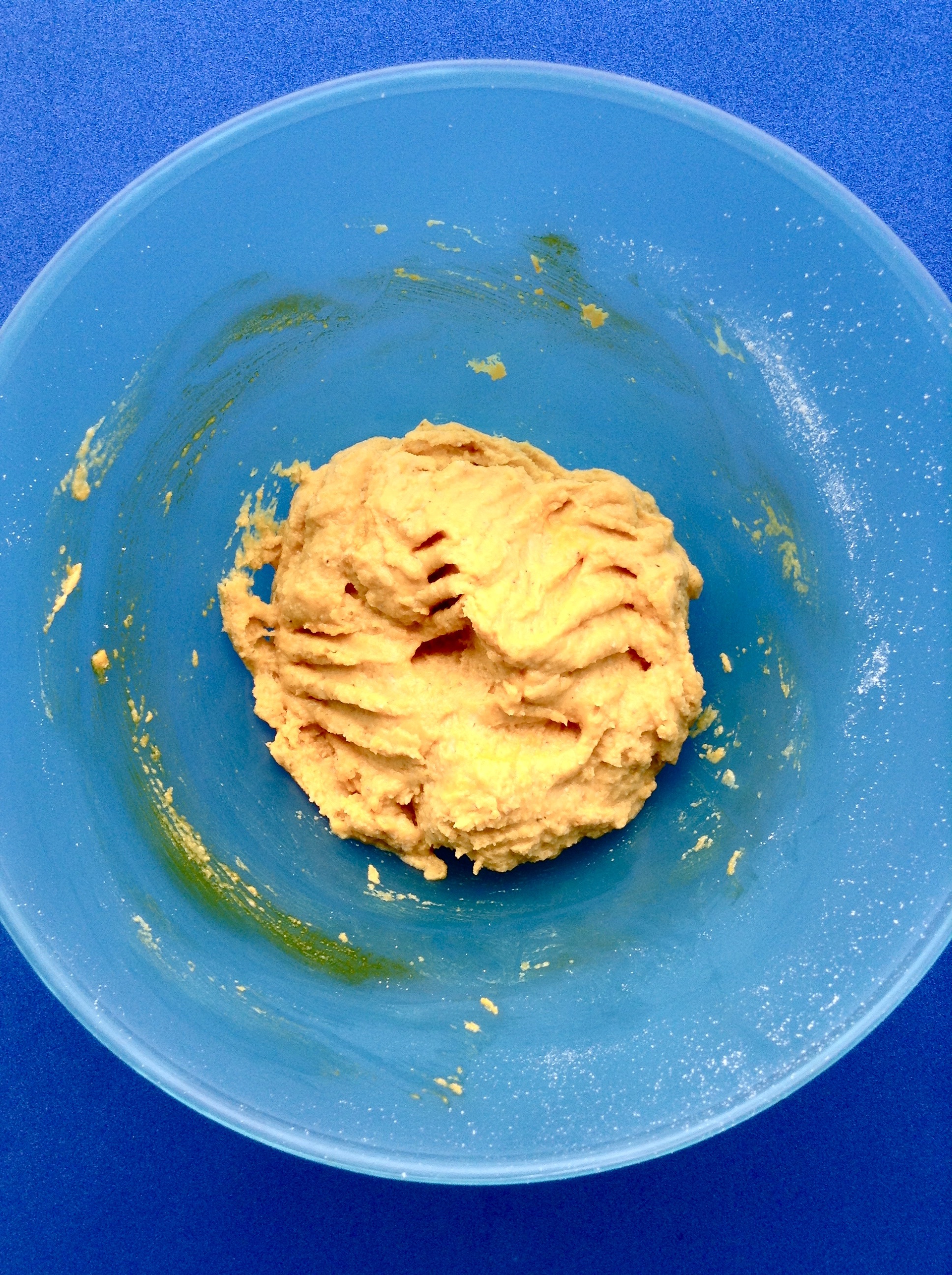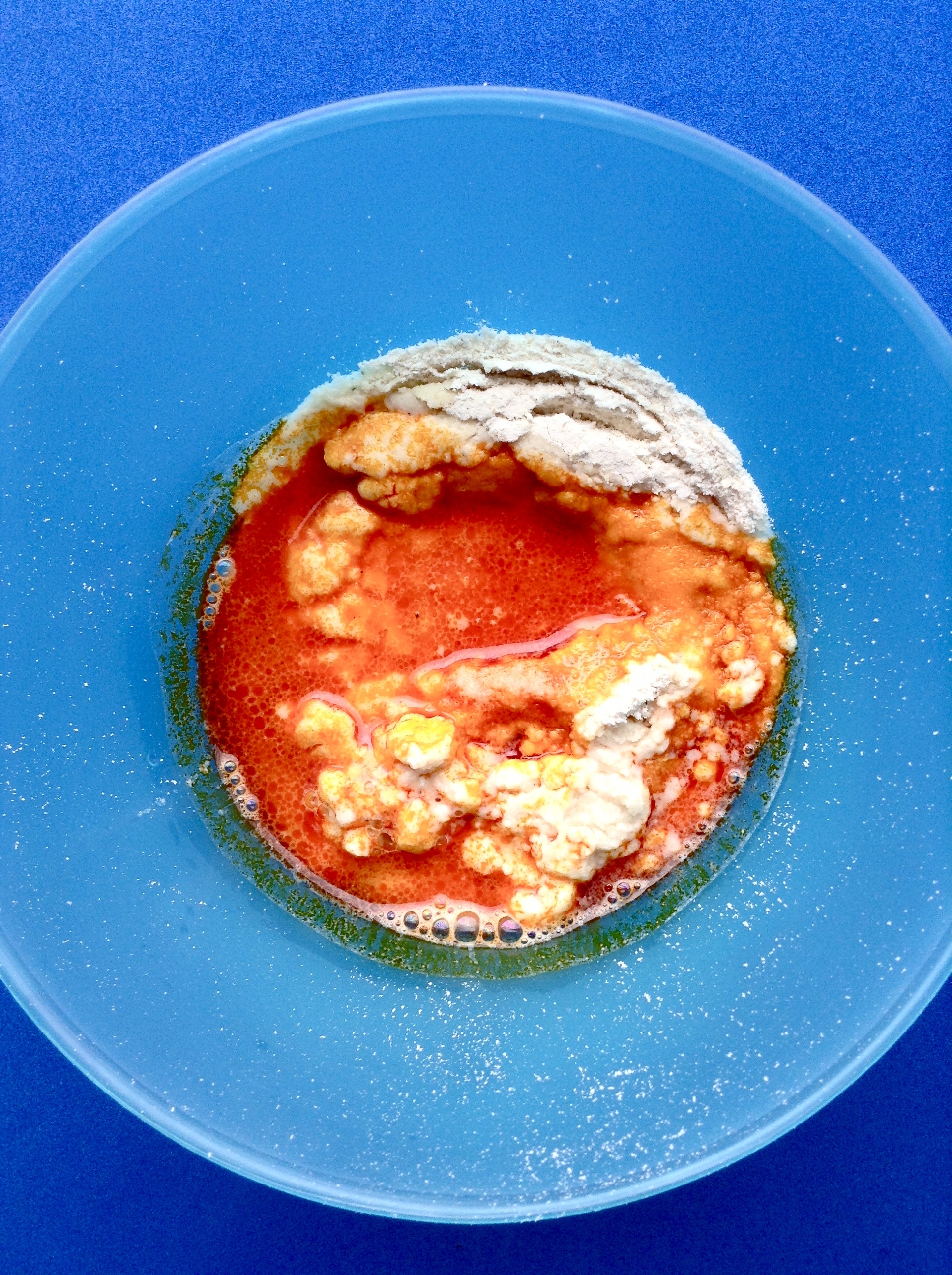 Mezclo la harina, el agua tibia, tres o cuatro cucharaditas de aceite de achiote y sal, hasta que quede una masa lisa, sin grumos.