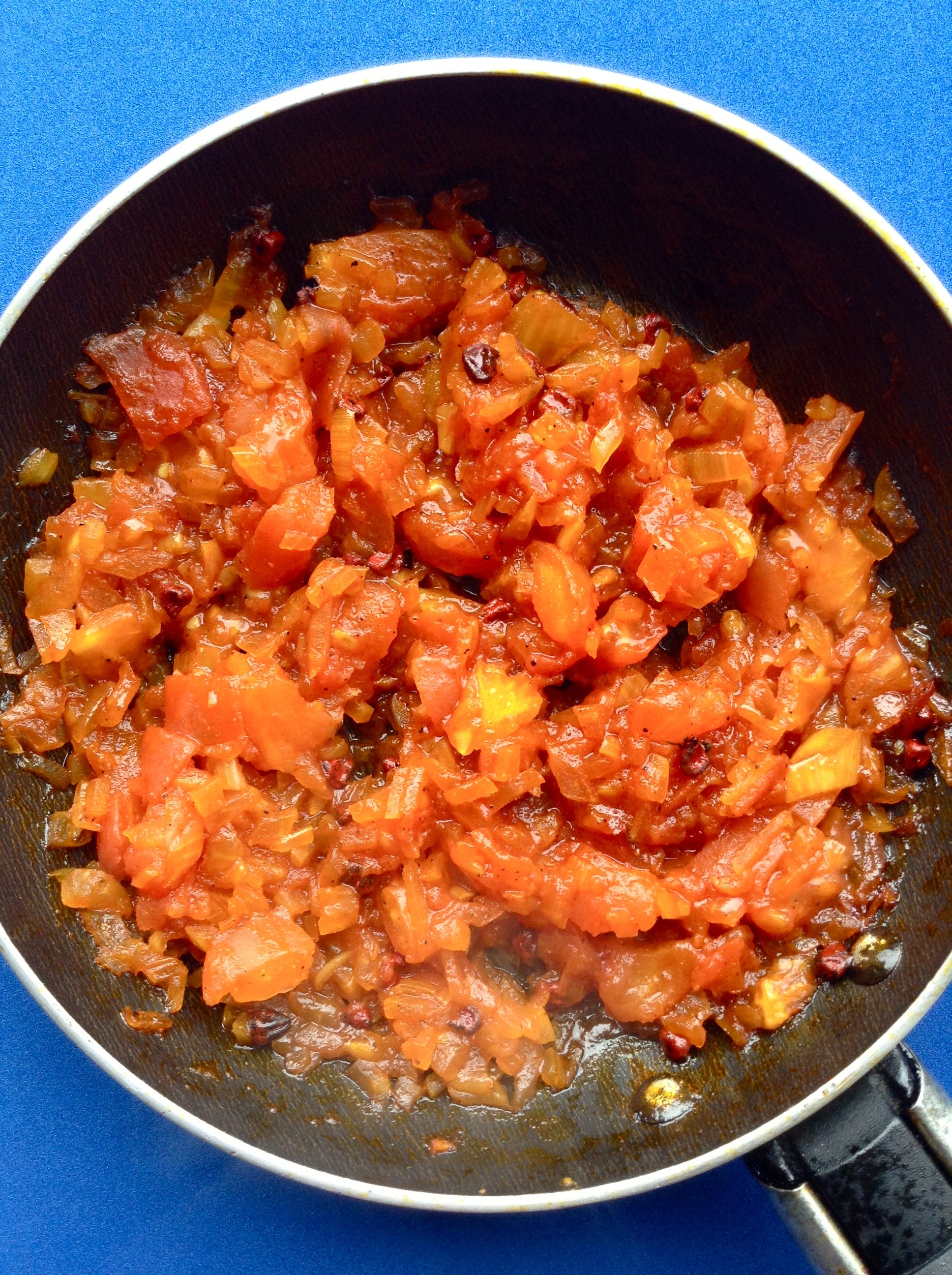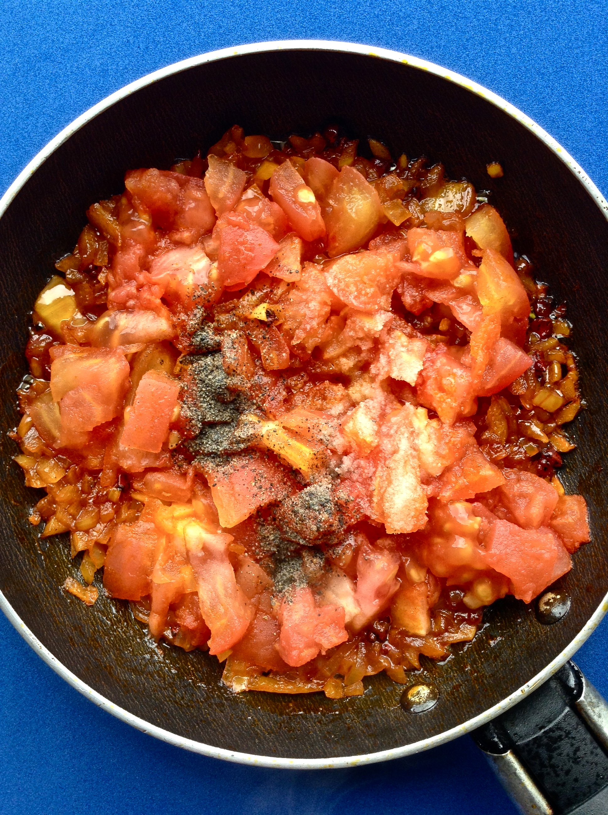 Cuando empieza a ablandarse, reparto el tomate picado entre las dos sartenes. Lo salpimiento.