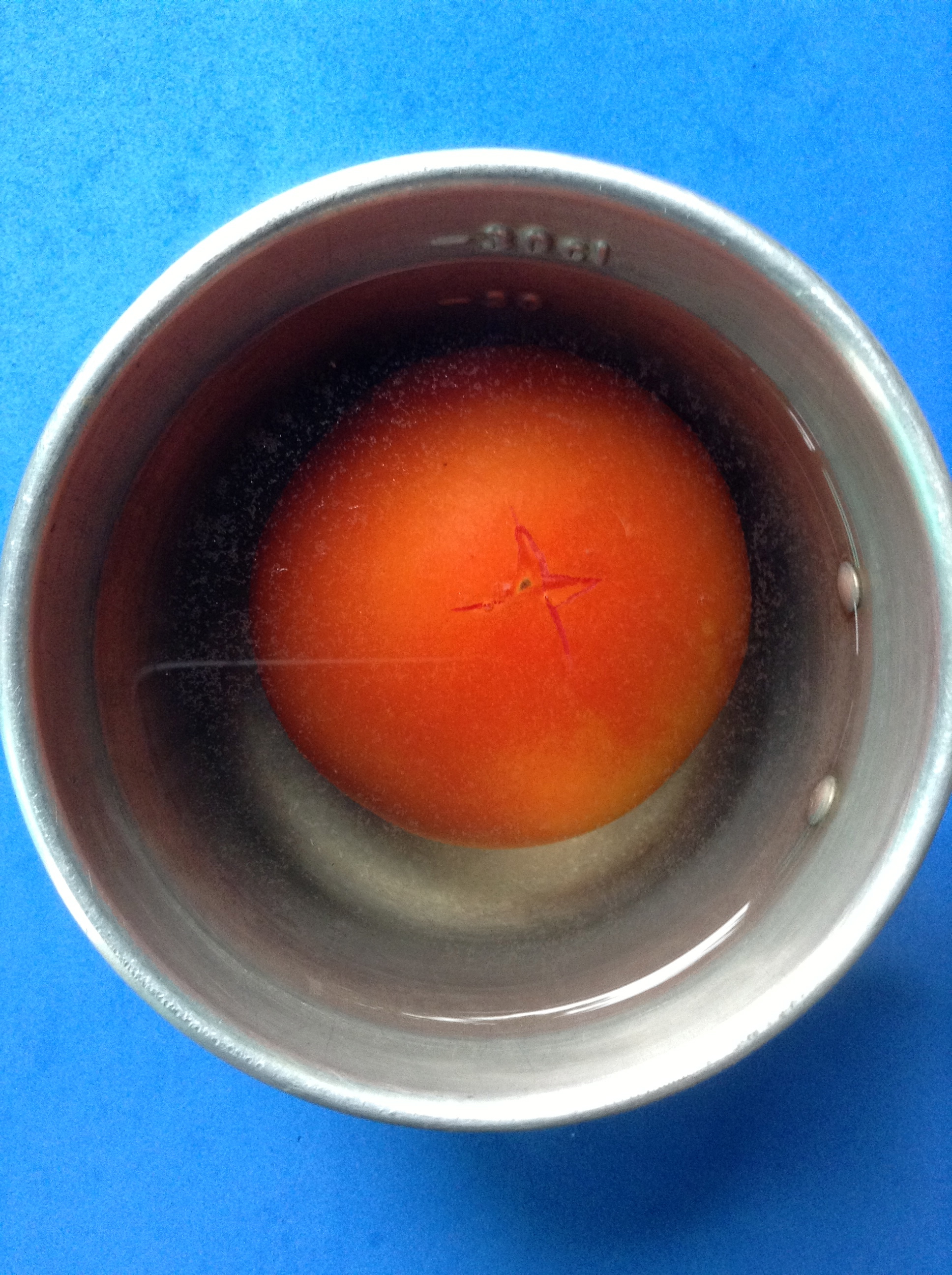 Pico la cebolla. Escaldo el tomate, le quito la piel y lo pico.