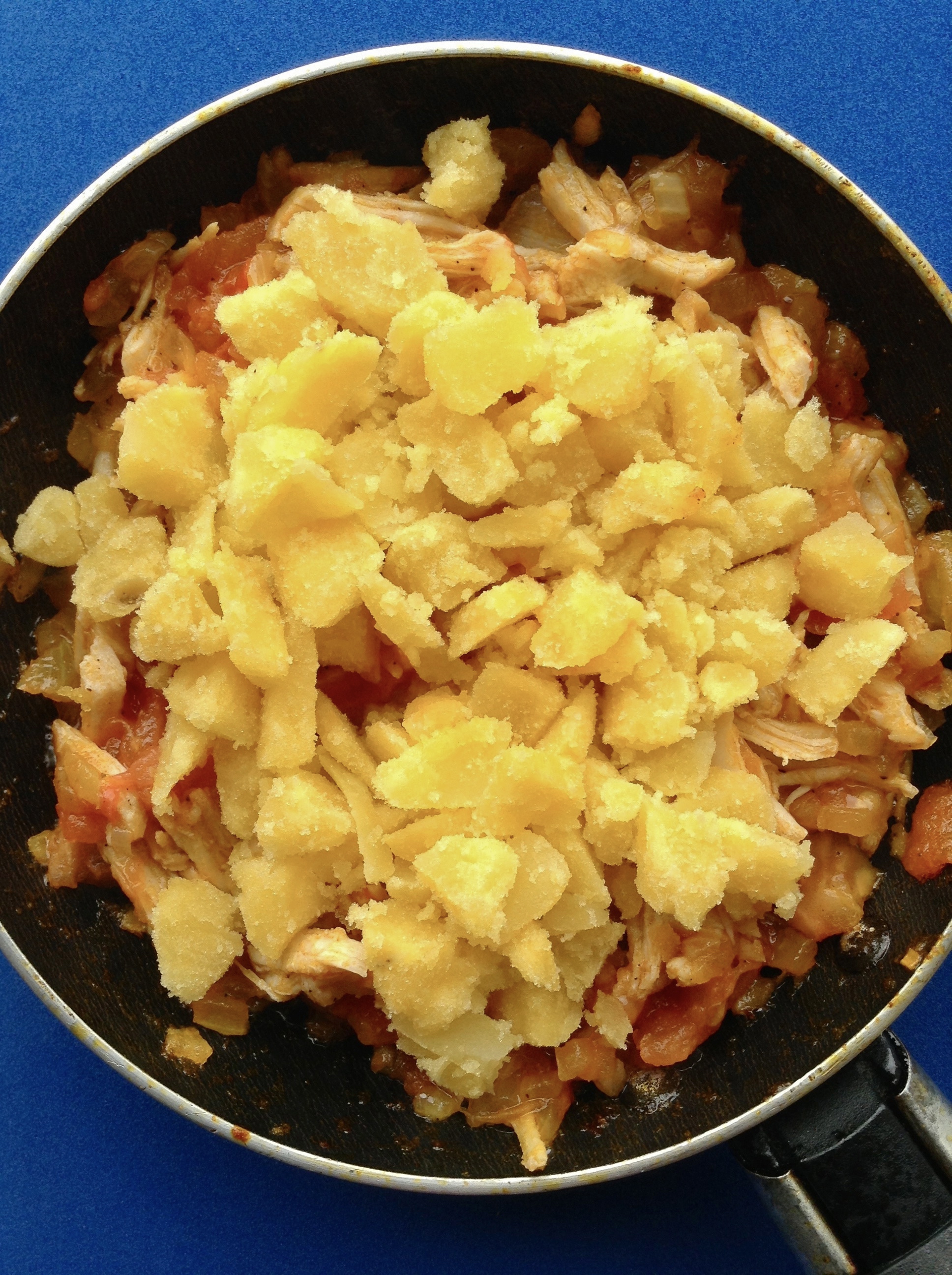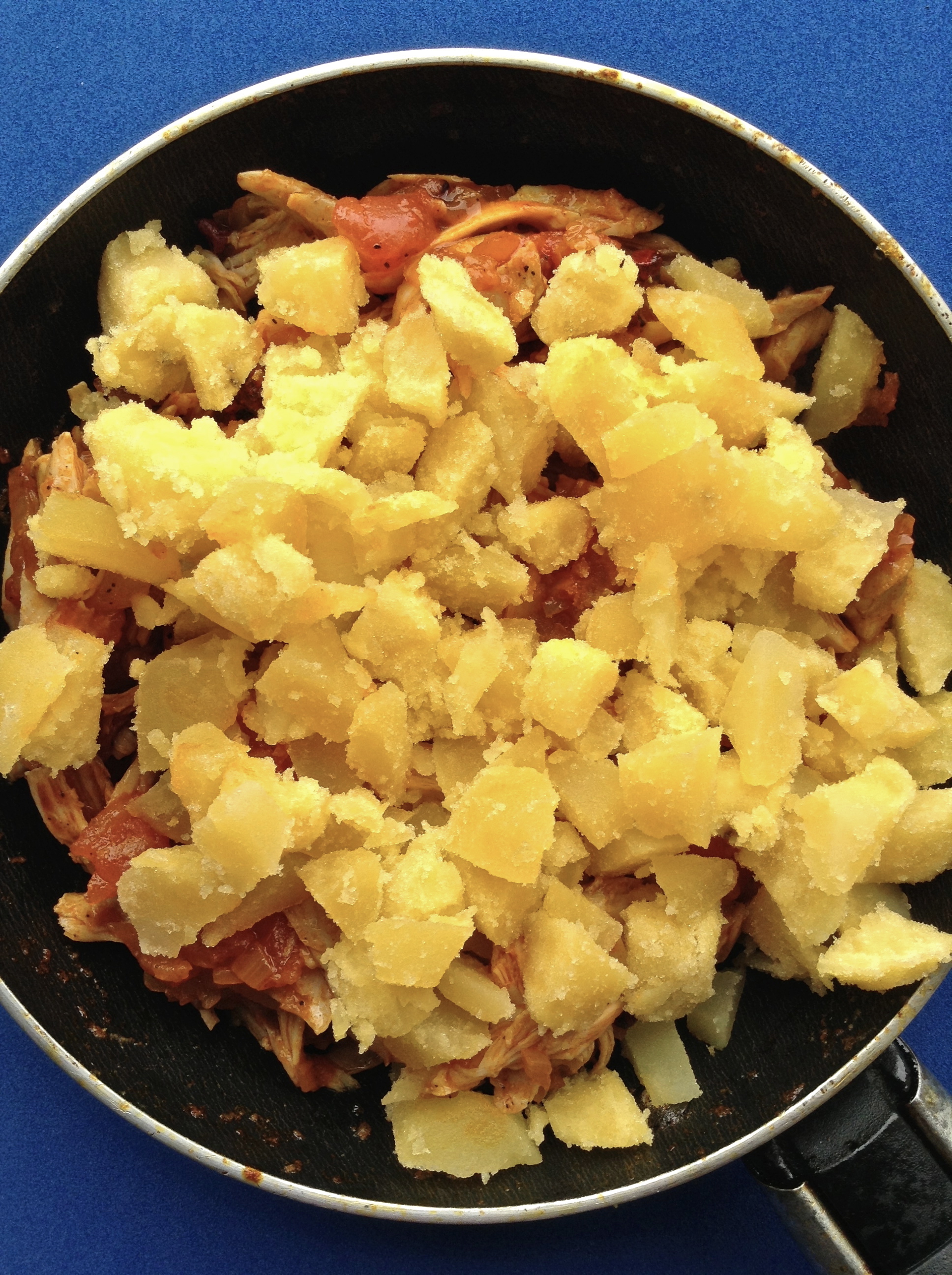 Lo mezclo y añado la mitad de daditos de papa en cada sartén. Le doy unas vueltas durante un par de minutos y las retiro del fuego.