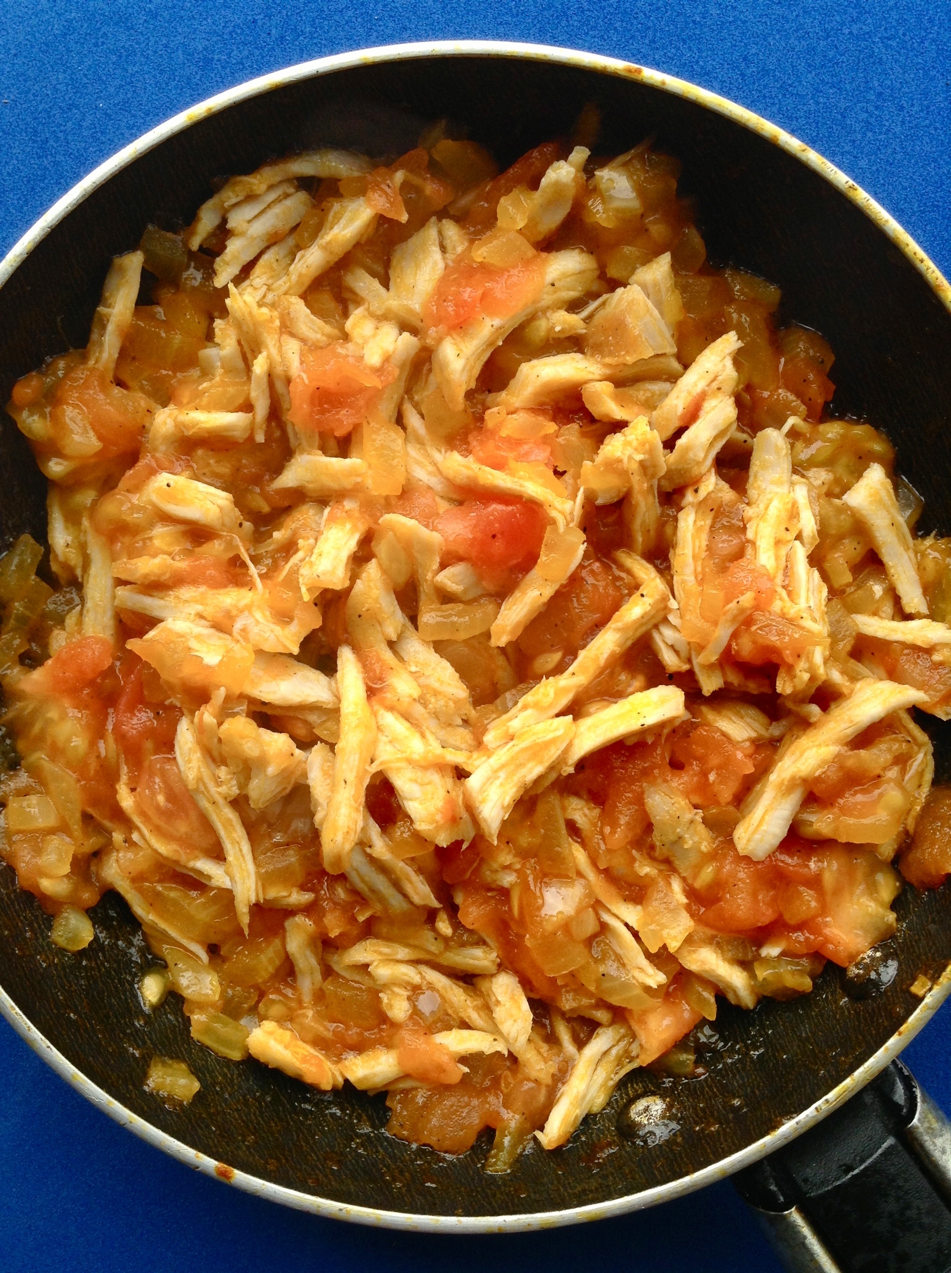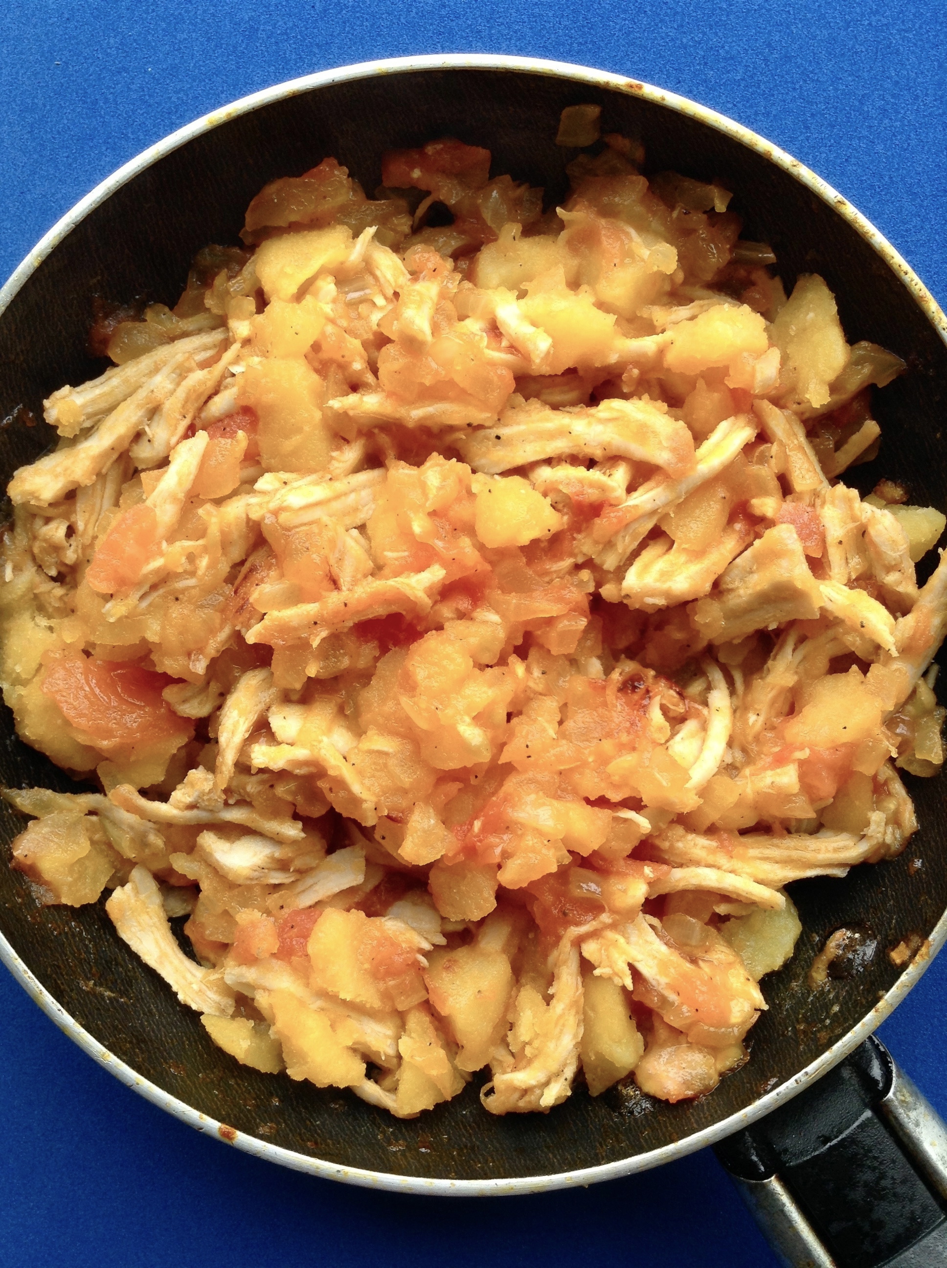 Una vez está rehogado el tomate, pongo el pollo en una sartén y el chancho en la otra.