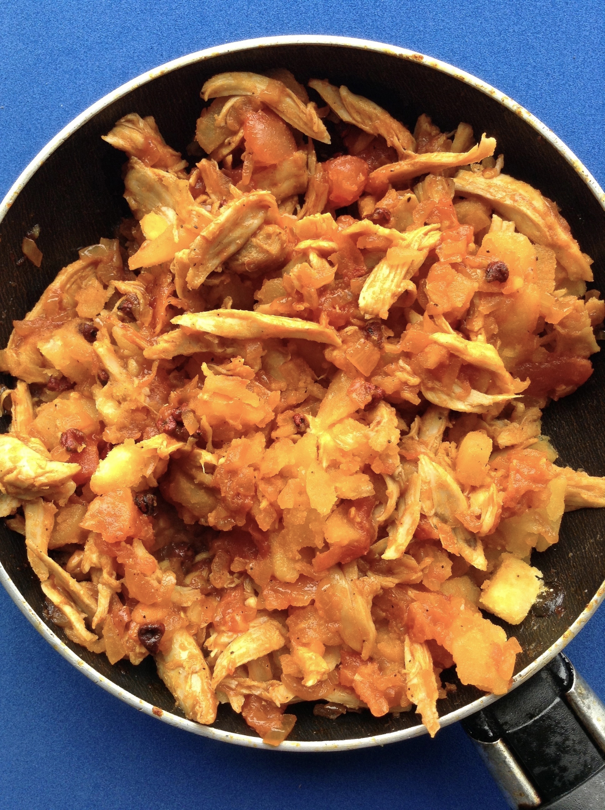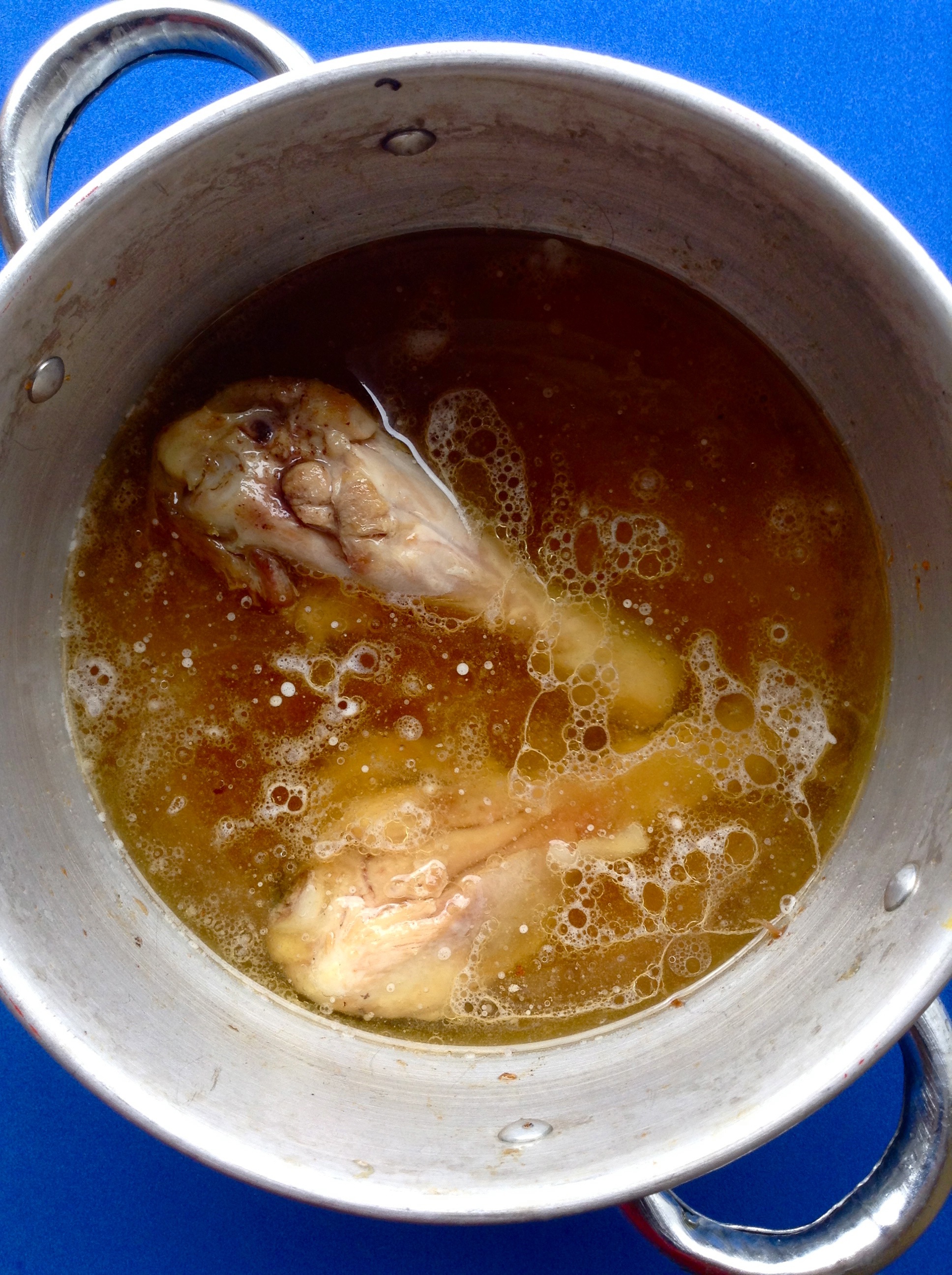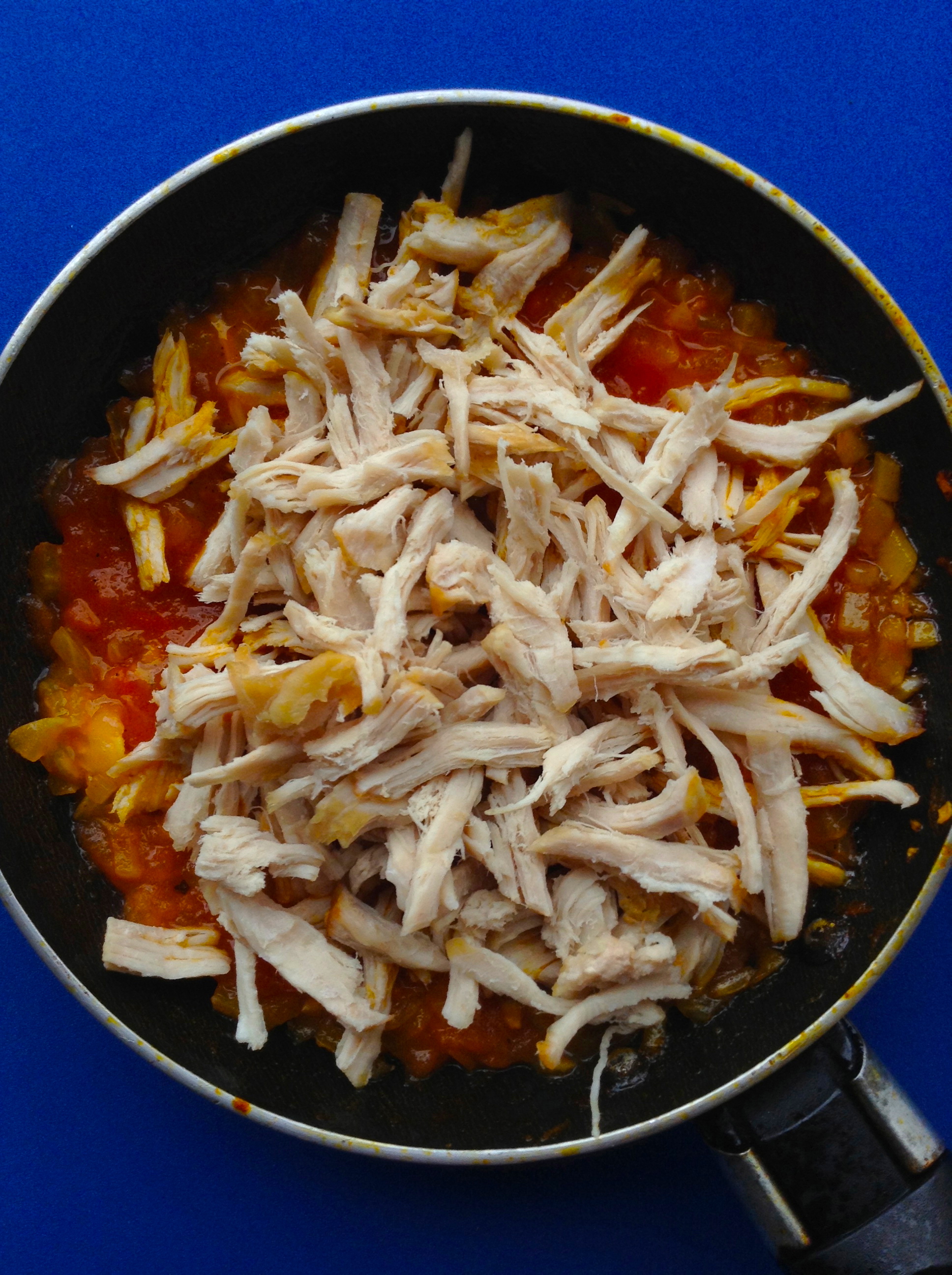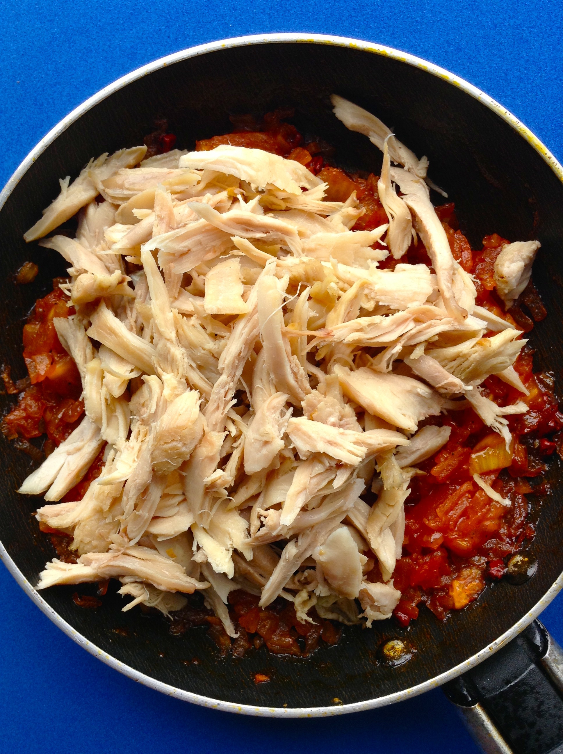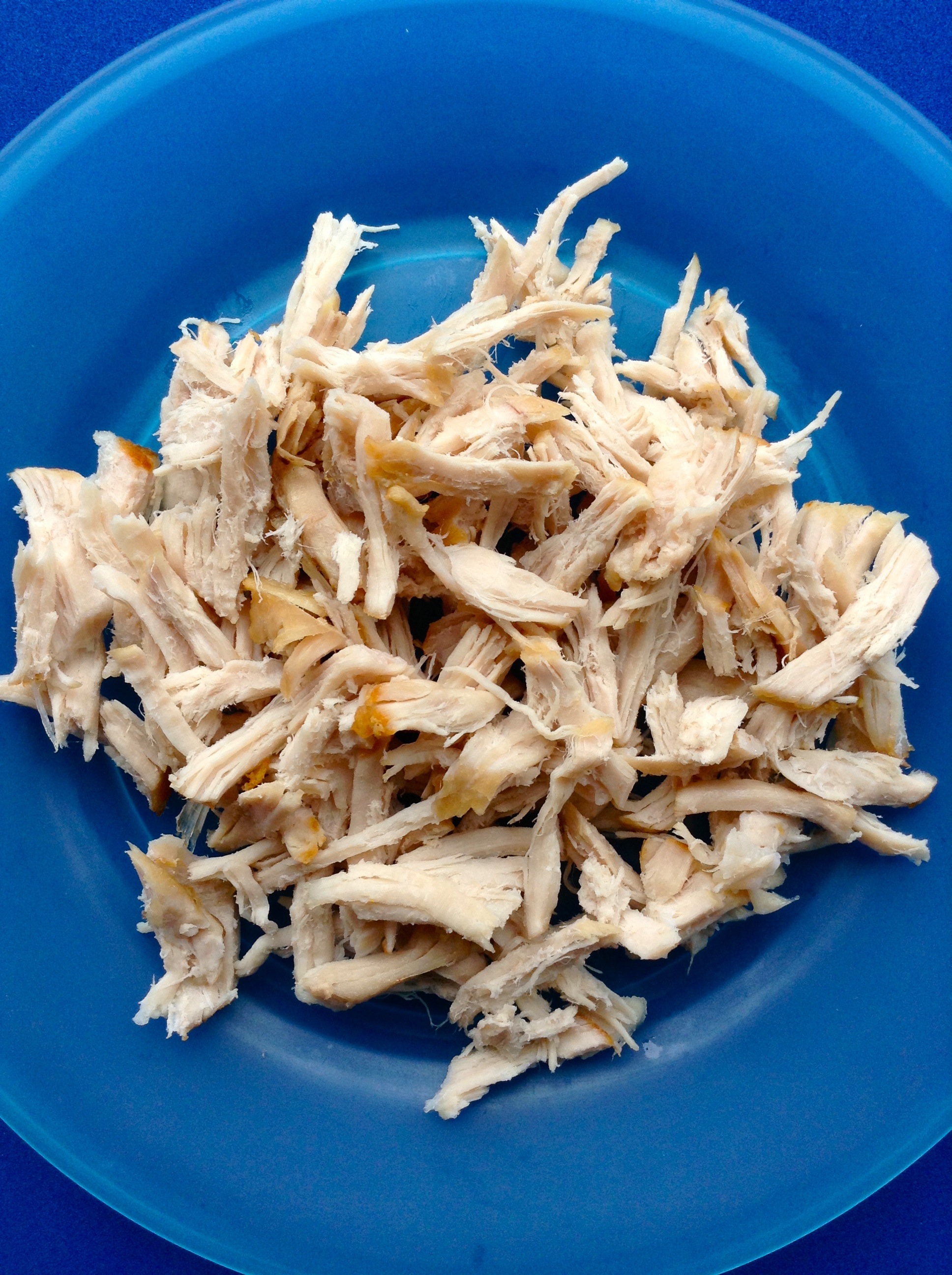 Pasada la media hora, escurro el pollo y el chancho, los dejo templar y los deshilacho por separado.