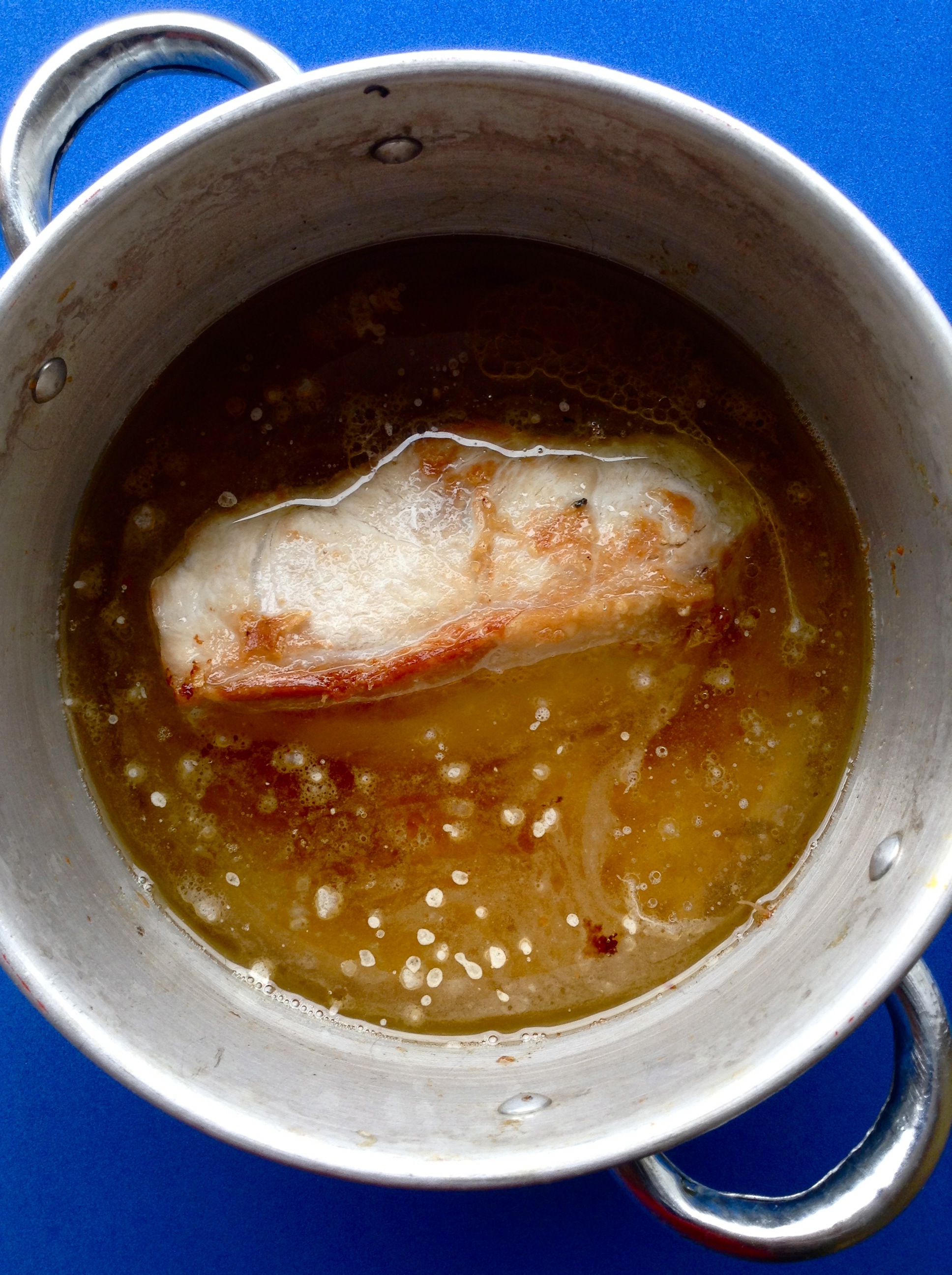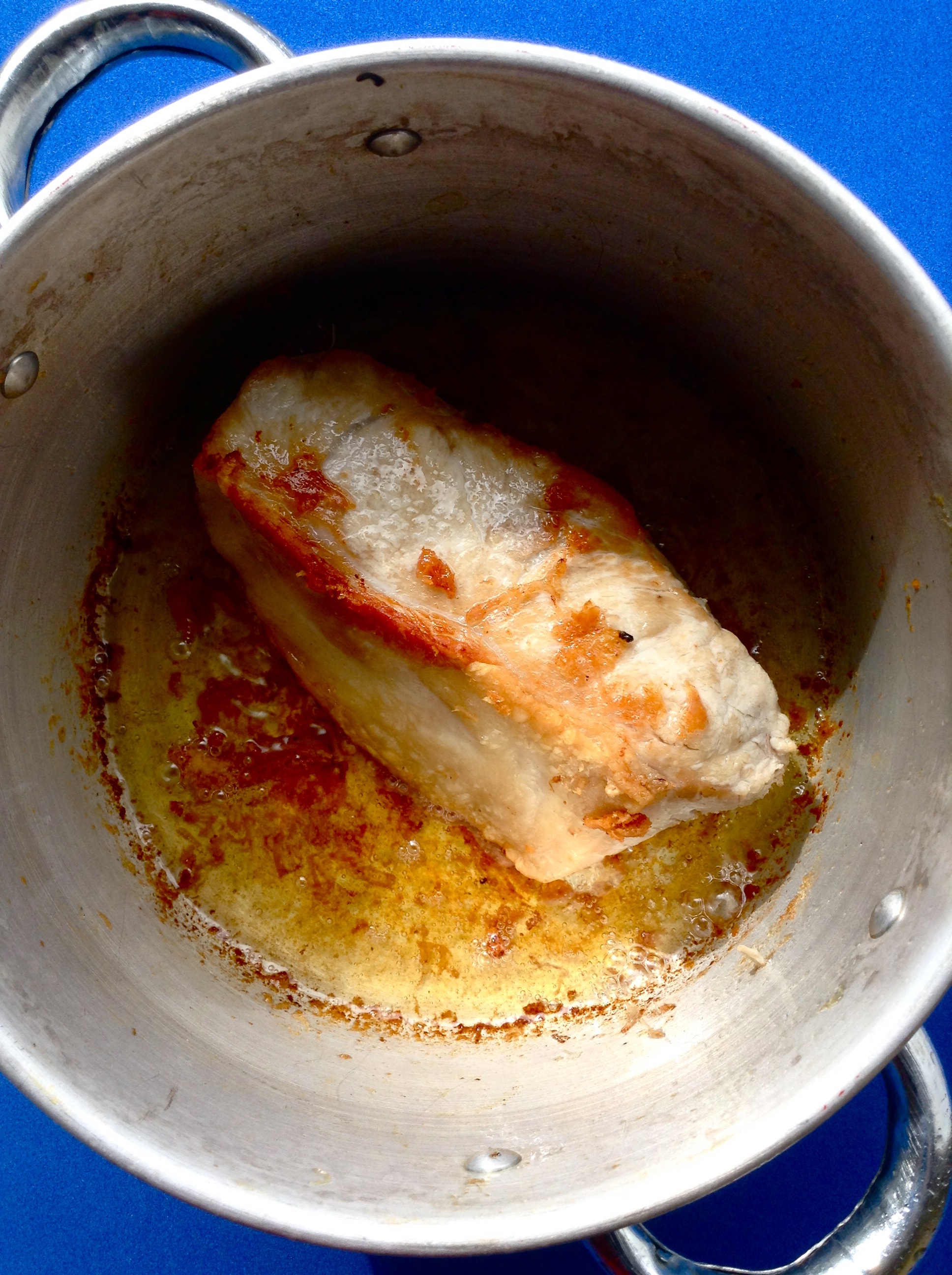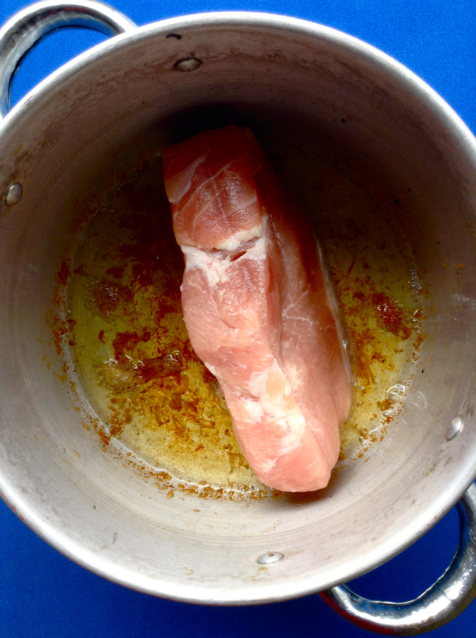 Para prepararlas, empiezo calentando un poco de aceite en dos cazuelas profundas. Sello, por separado, el lomo de chancho y la pechuga de pollo.