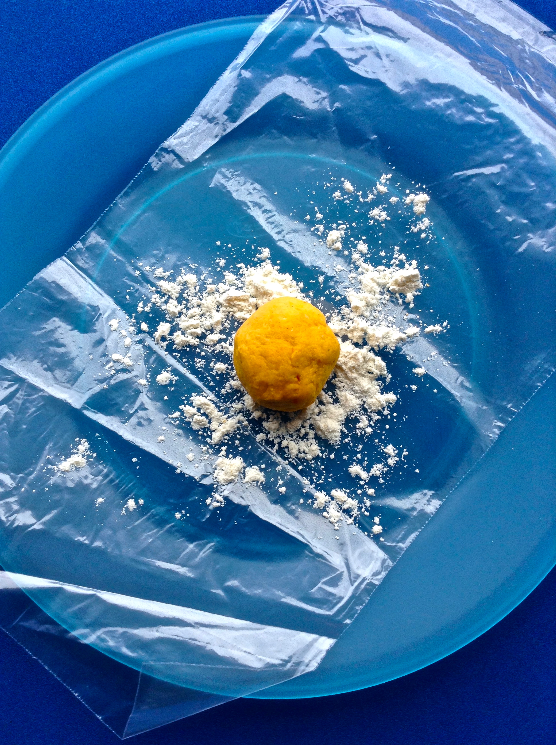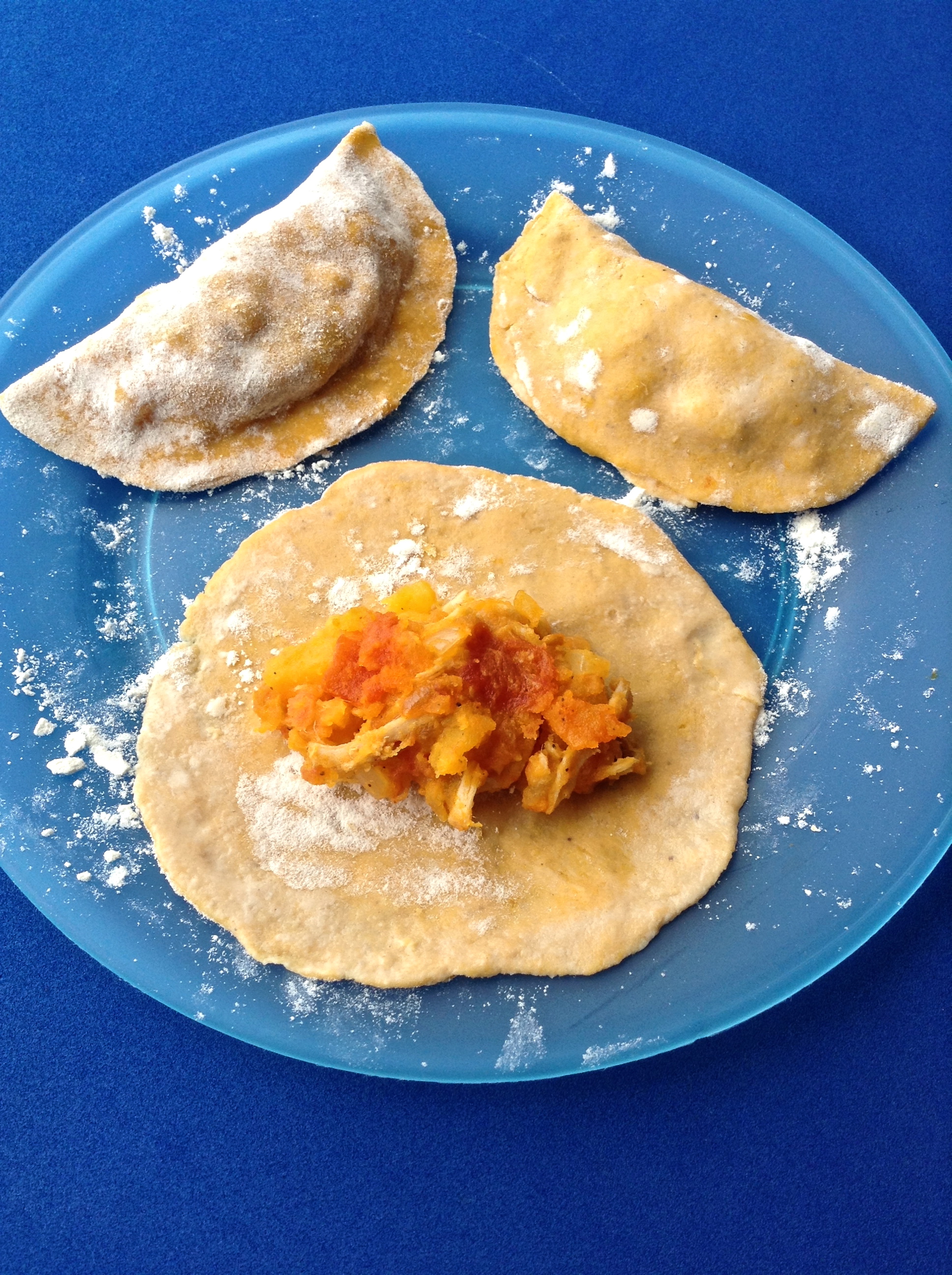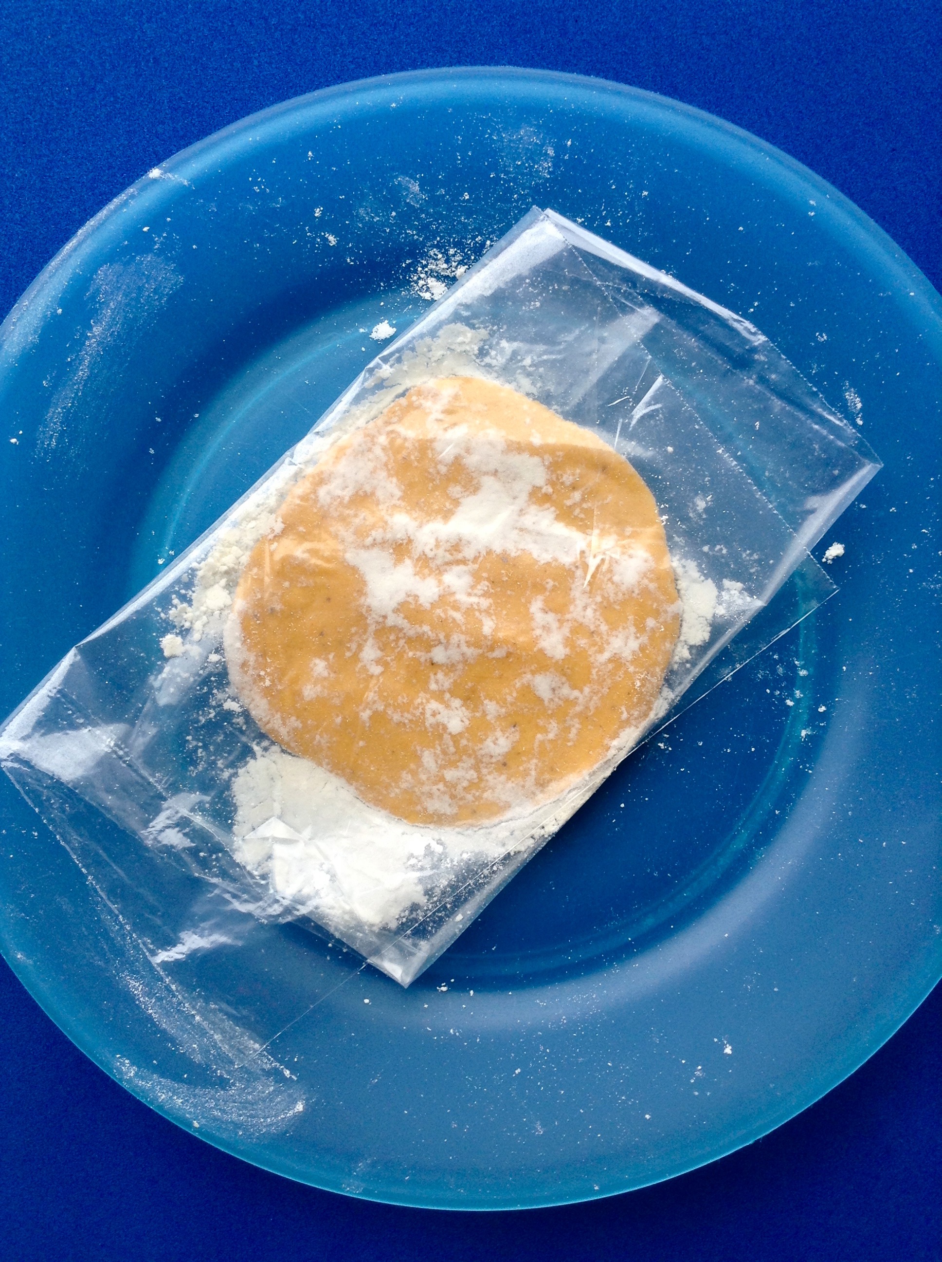 Formo pequeñas bolas que aplasto con la ayuda de un poco de harina y de unas bolsitas de plástico. Deben resultar unas láminas finas para que luego las empanadas queden crujientes.