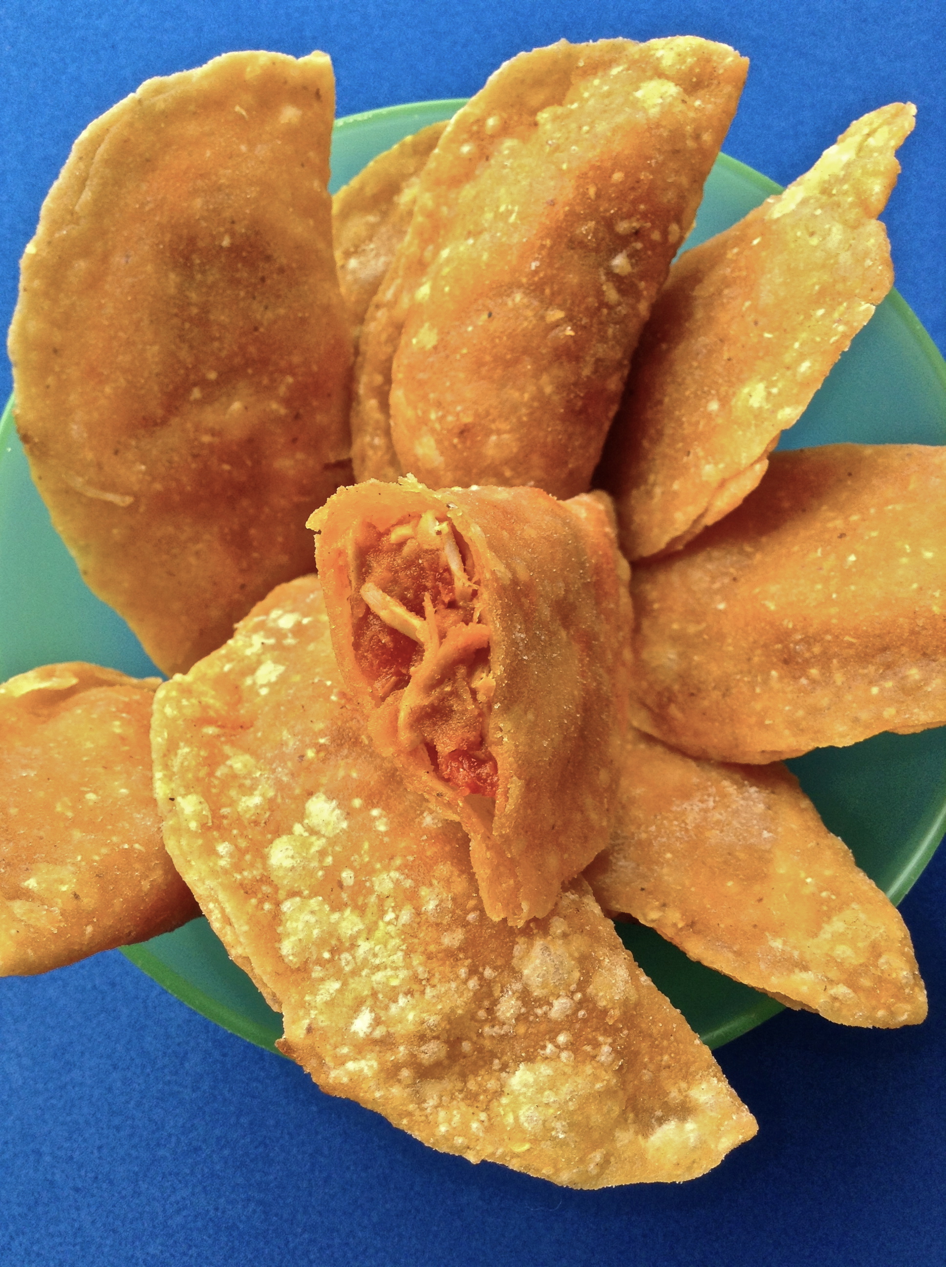 Relleno unas láminas con el relleno de pollo y otros con el de chancho. Mojo el borde y me aseguro de que quedan bien cerradas.