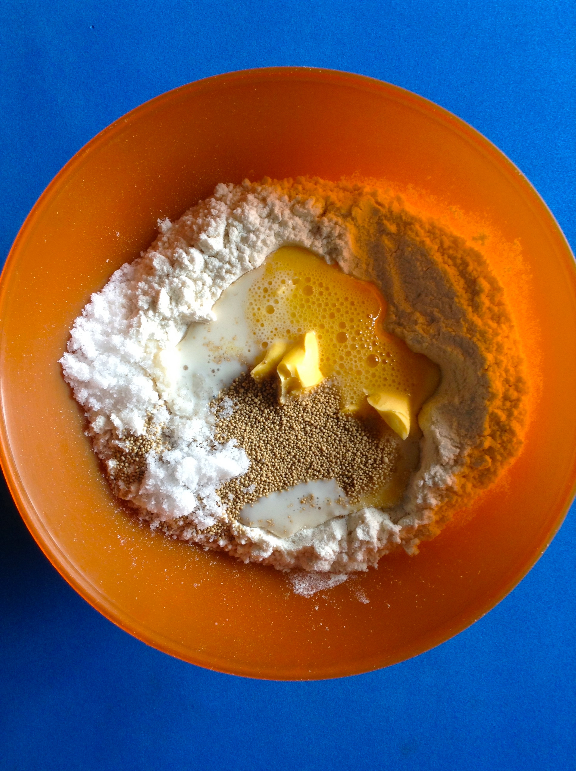 Bato el huevo en un bol y lo mezclo con la harina, la leche, la mantequilla, la levadura y la sal, hasta que la masa se despegue de los bordes. Entonces lo vuelco sobre una superficie enharinada y lo amaso hasta que la masa deja de estar pegajosa.