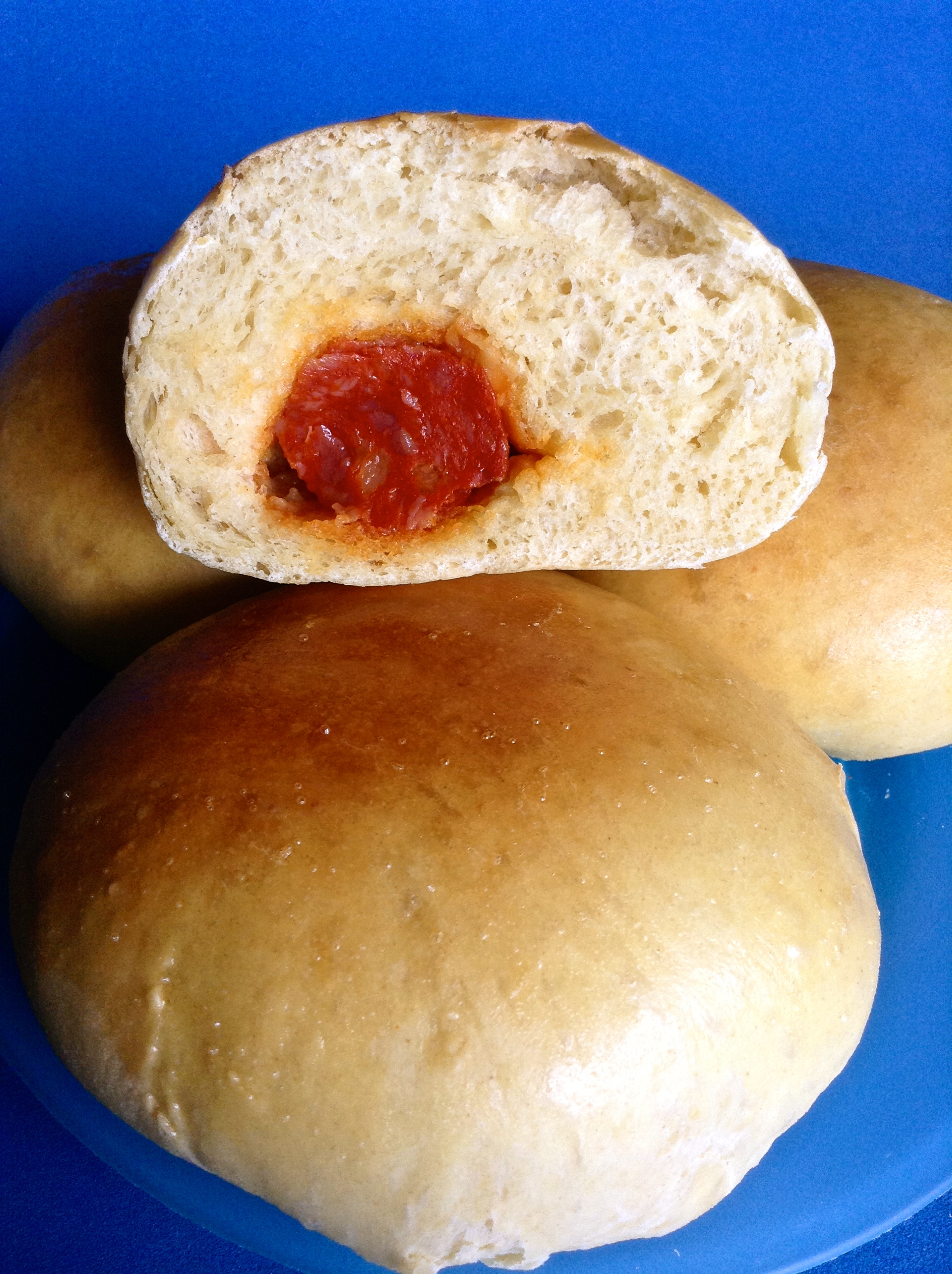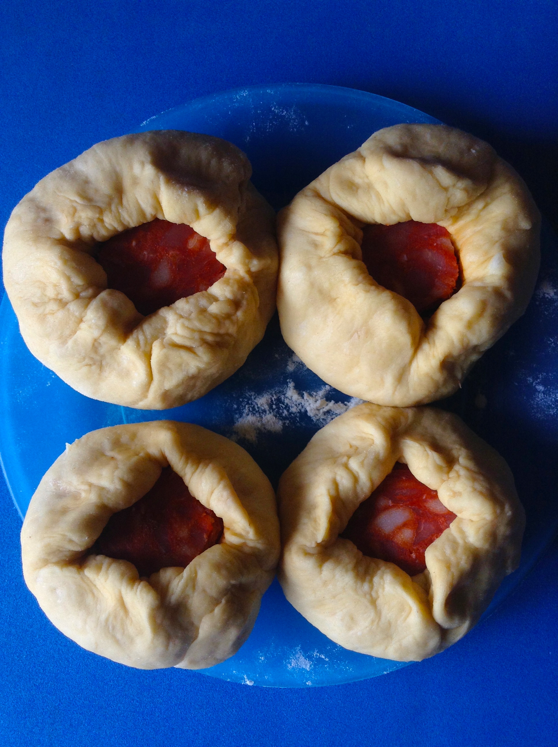 En este tiempo, la masa ha doblado de tamaño. Entonces la vuelvo a amasar y la divido en 8 partes. Formo 8 bolas, las aplano en la palma de la mano formando barquitas, las relleno con un trozo del chorizo y las cierro dándoles forma de bollo.