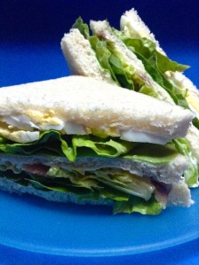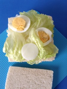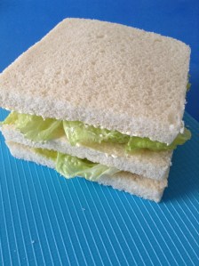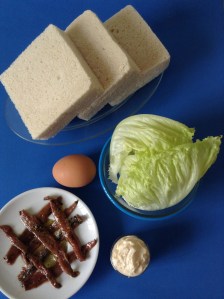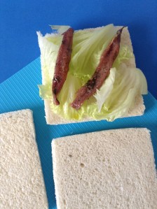 Encima, pongo las anchoas y la lechuga, y lo cubro con la tercera rebanada con la cara untada de mahonesa hacia abajo. Los parto por la mitad.
