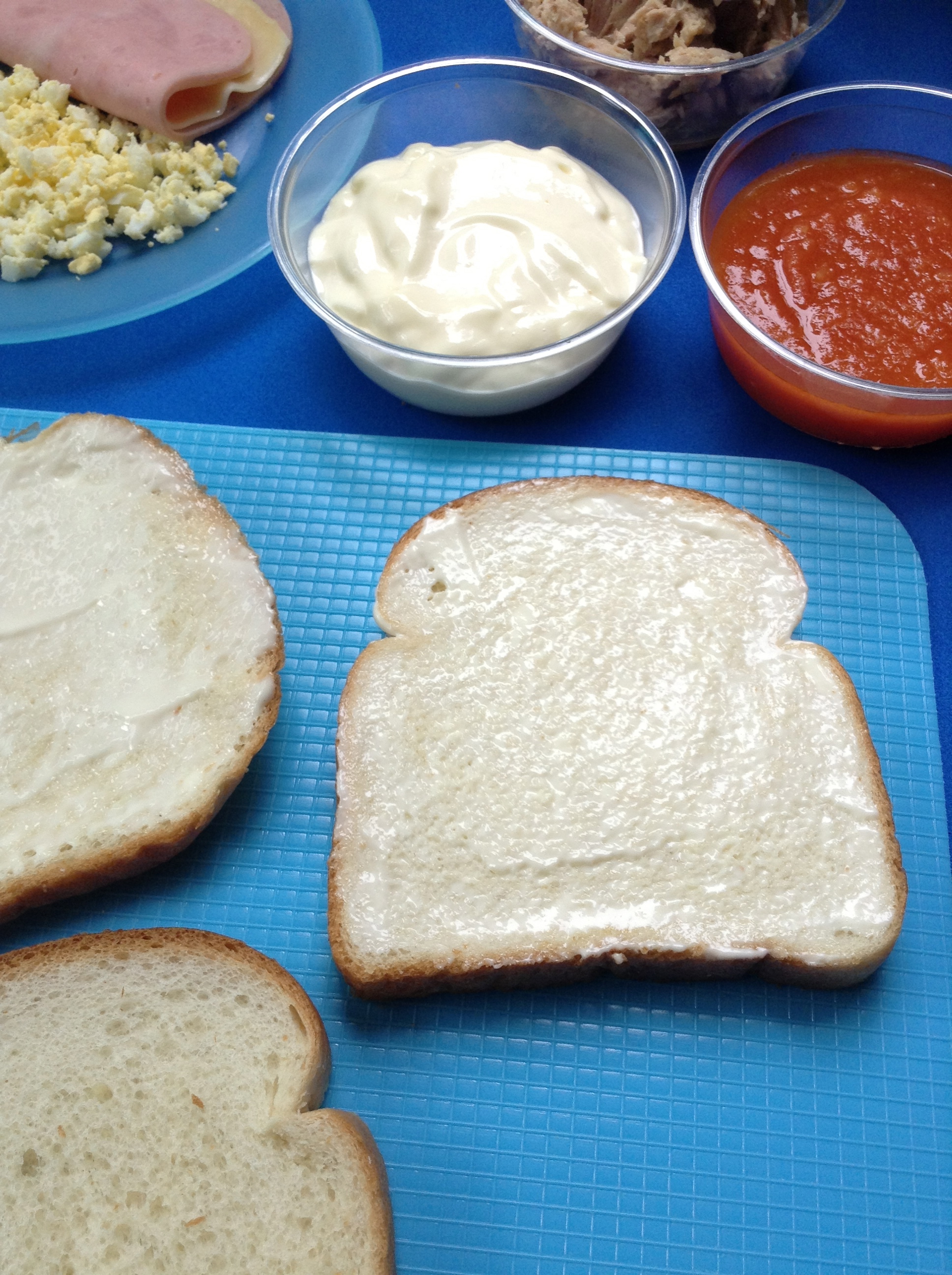 Distribuyo tres rebanadas de pan de molde sobre la mesa y las unto con mahonesa.