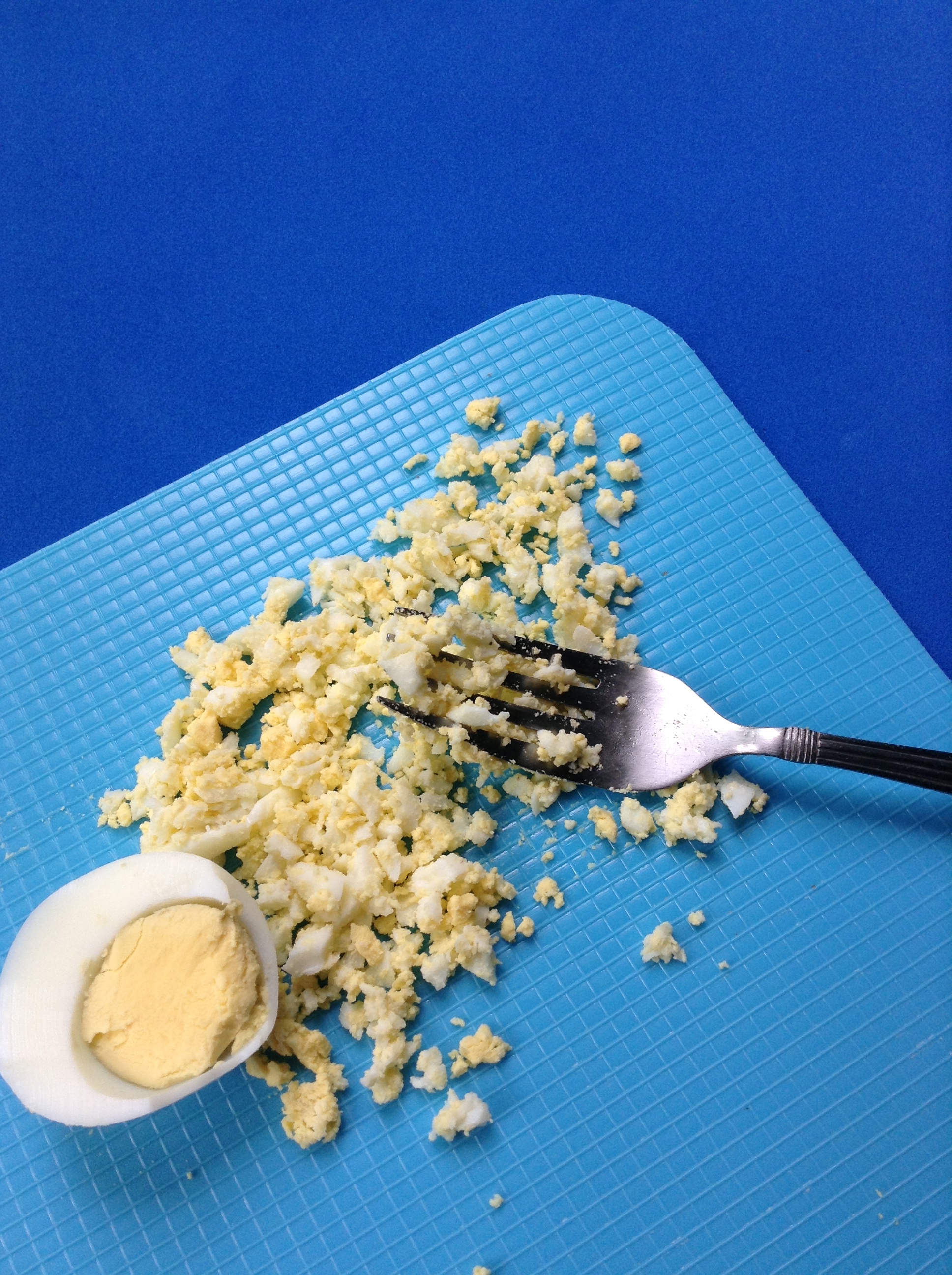 Pongo al fuego los huevos en agua con sal. Cuento 10 minutos desde que rompa a hervir. Los pelo y los escacho.