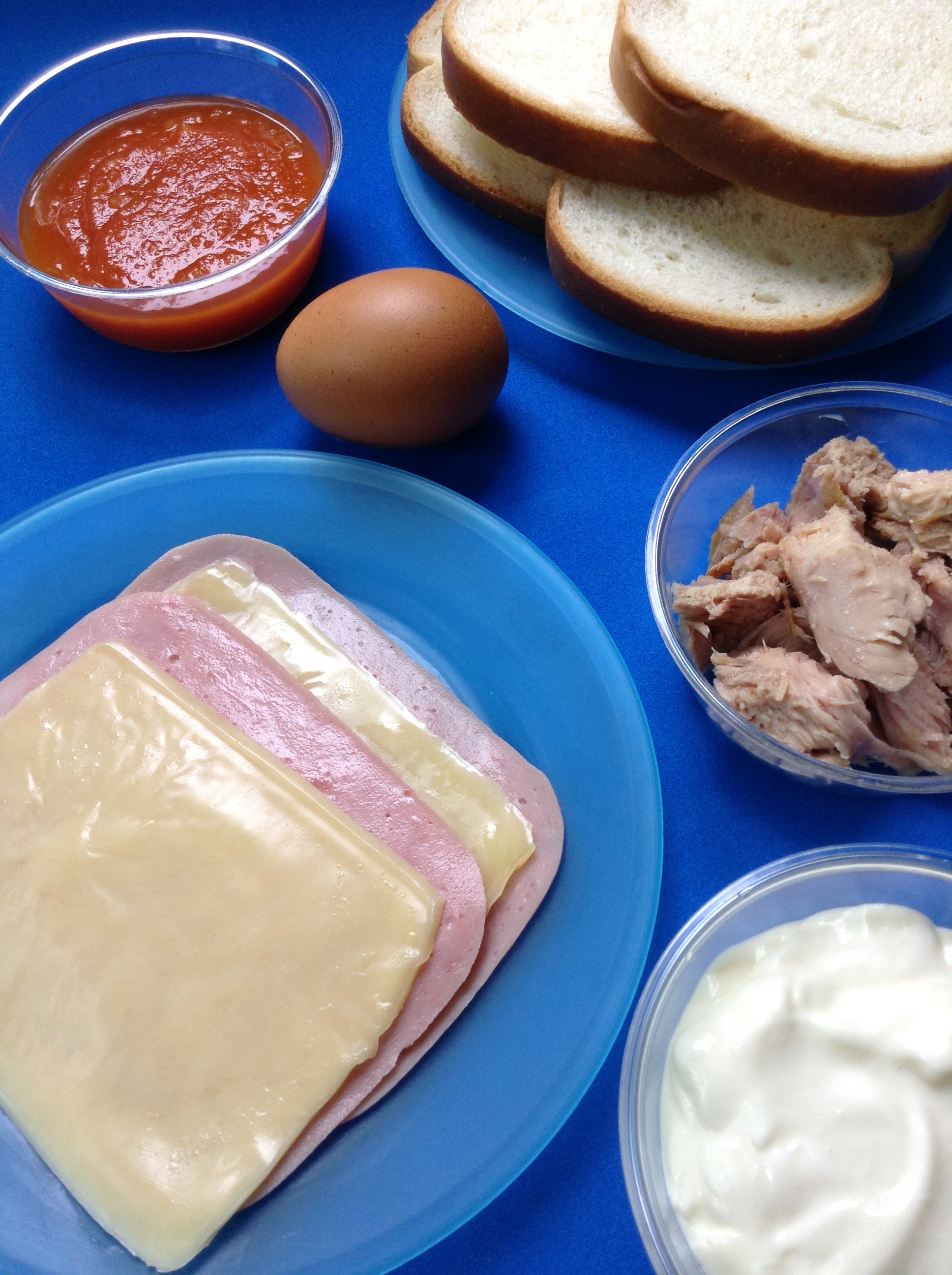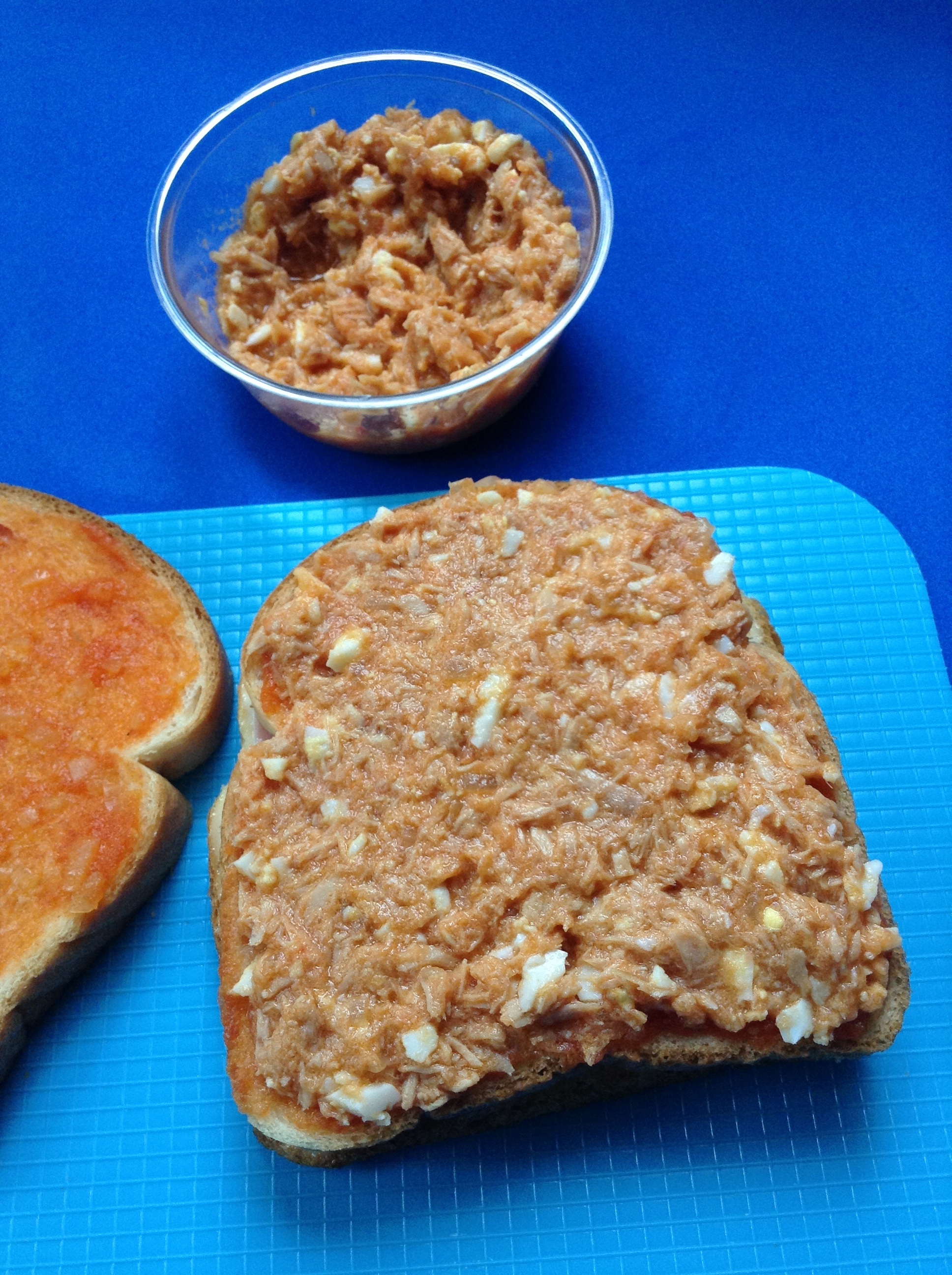 Encima, extiendo la mezcla de bonito y huevo con tomate, y lo cubro con la tercera rebanada con la cara untada de mahonesa hacia abajo. Los parto por la mitad.