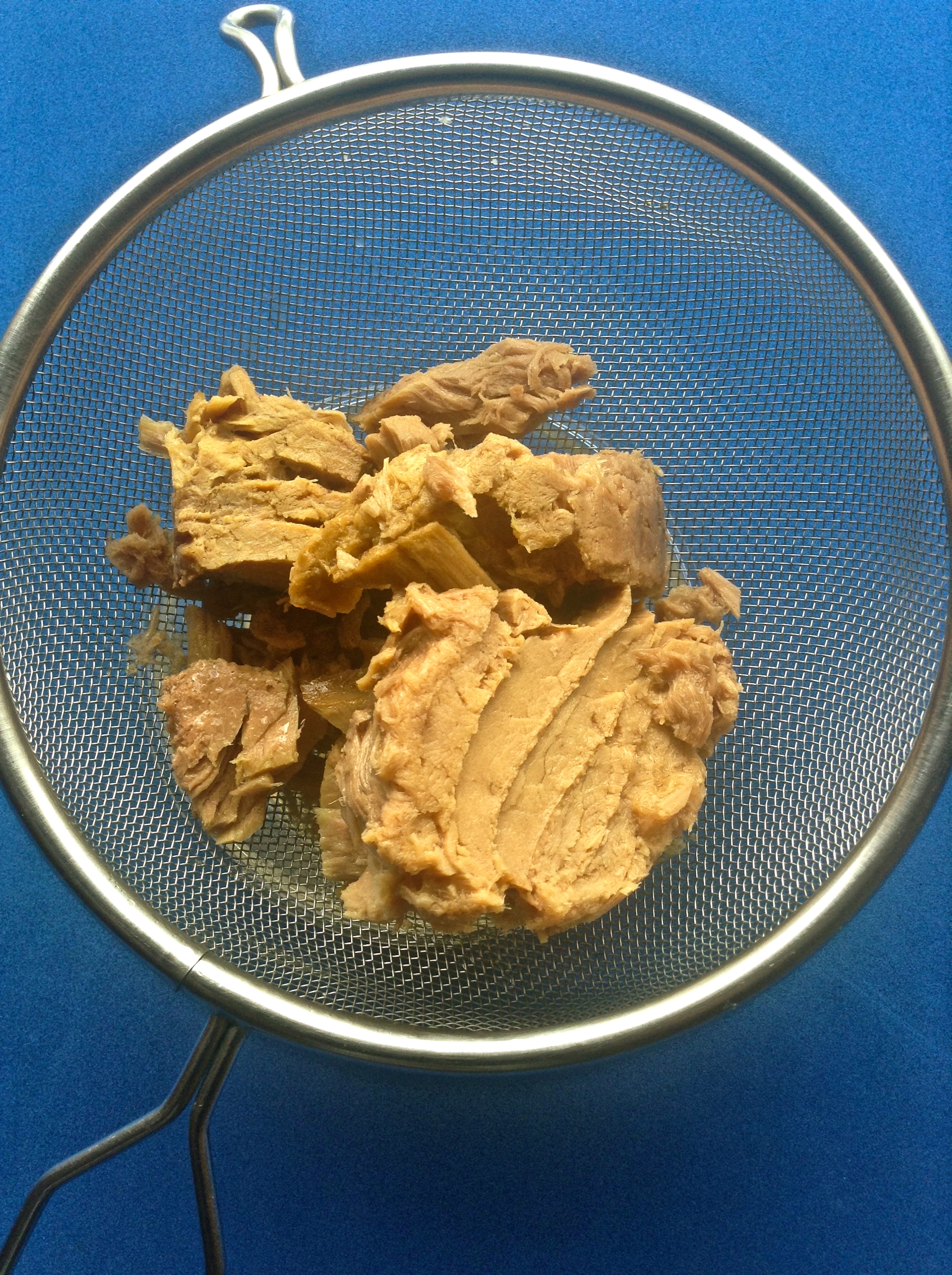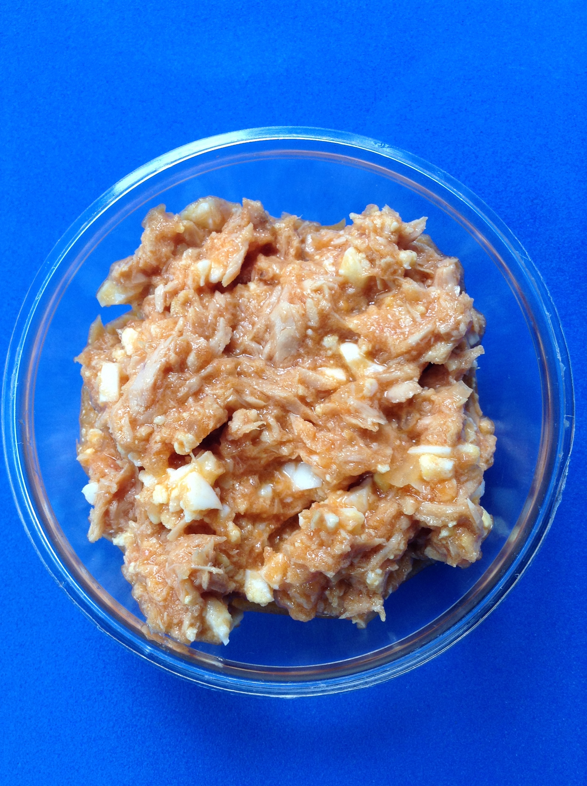 En un bol, mezclo los huevos escachados y el bonito desmenuzado con la salsa de tomate suficiente para que quede bien jugoso.