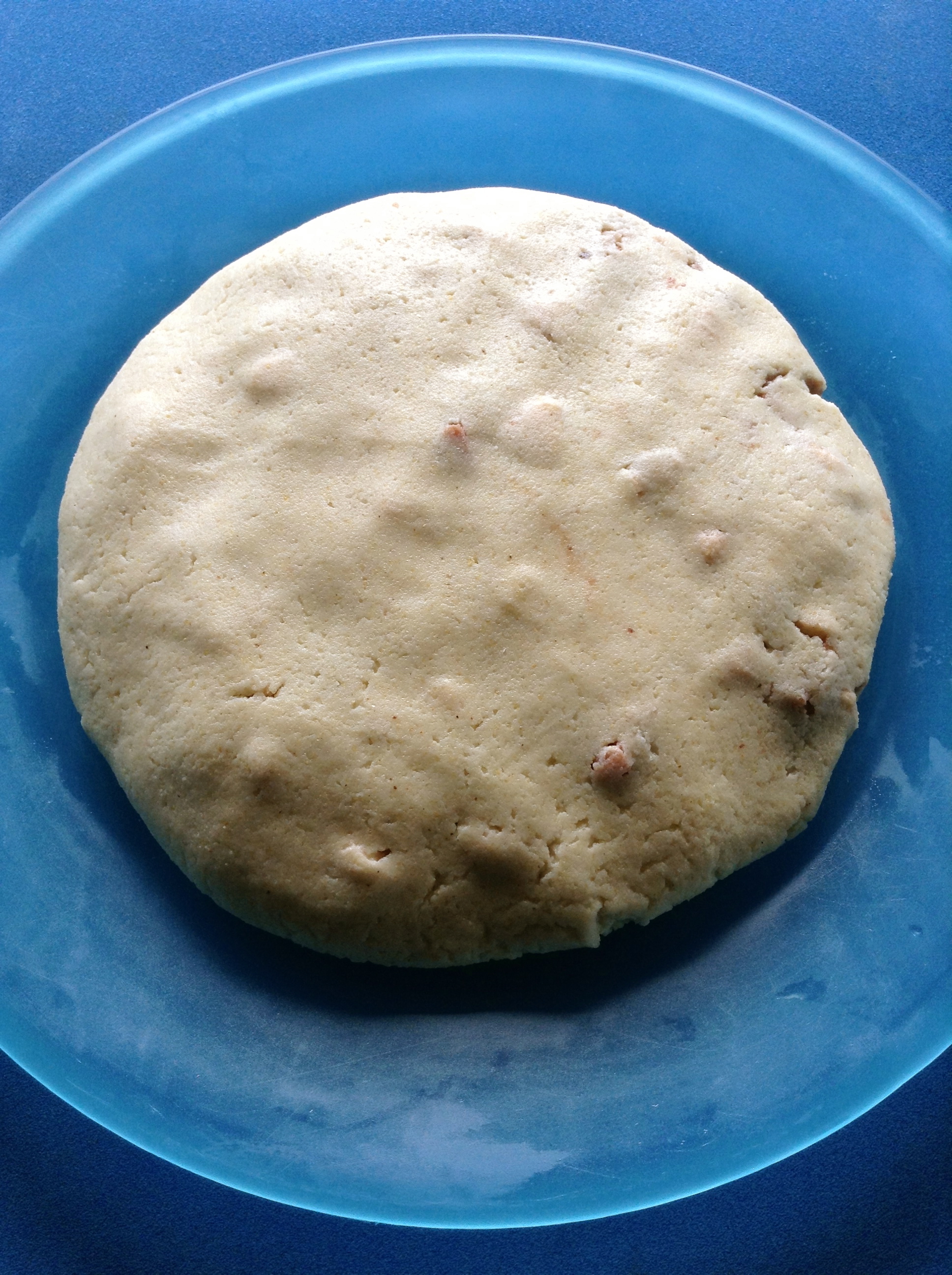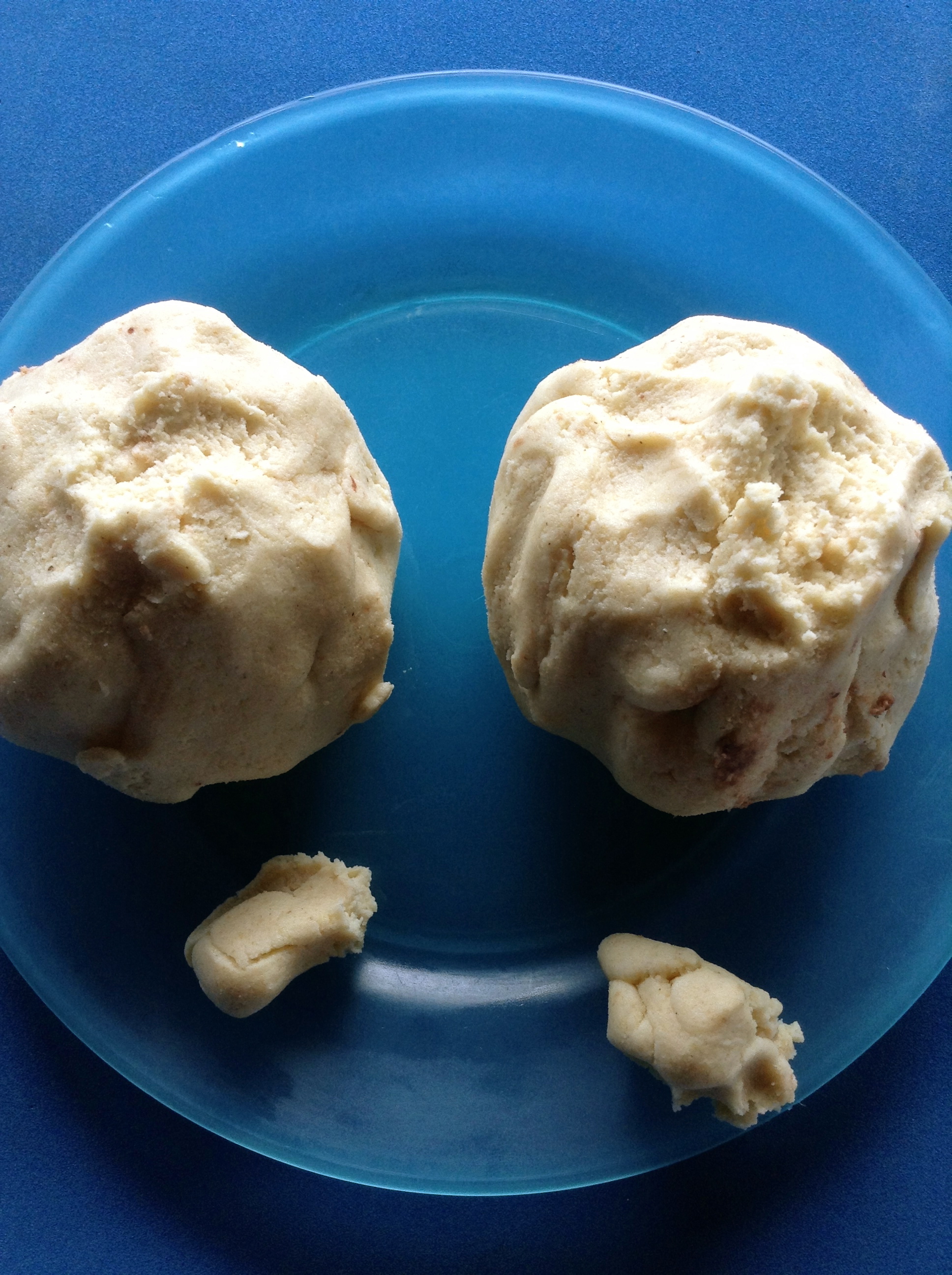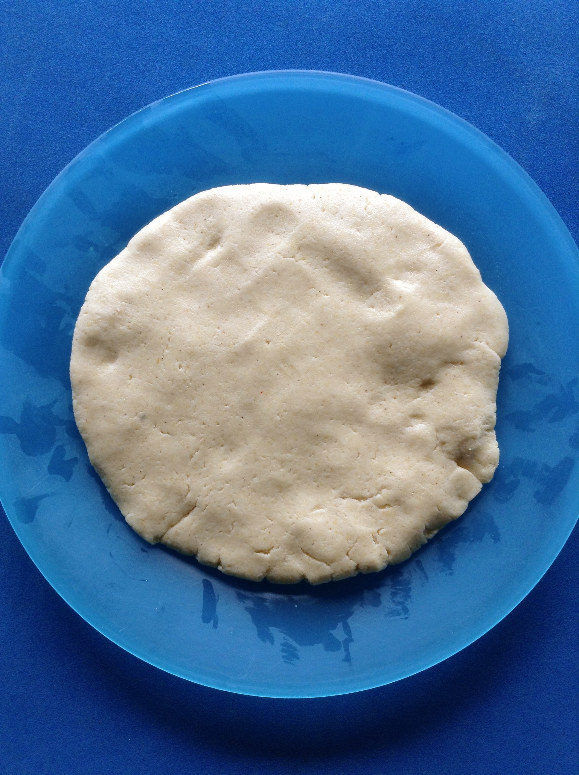Mezclo la harina con una taza del caldo de pollo y sal hasta que quede una masa sin grumos y no pegajosa. Amaso durante unos 10 minutos. Si es necesario, añado un poco más de harina o de caldo. La dejo reposar media hora.