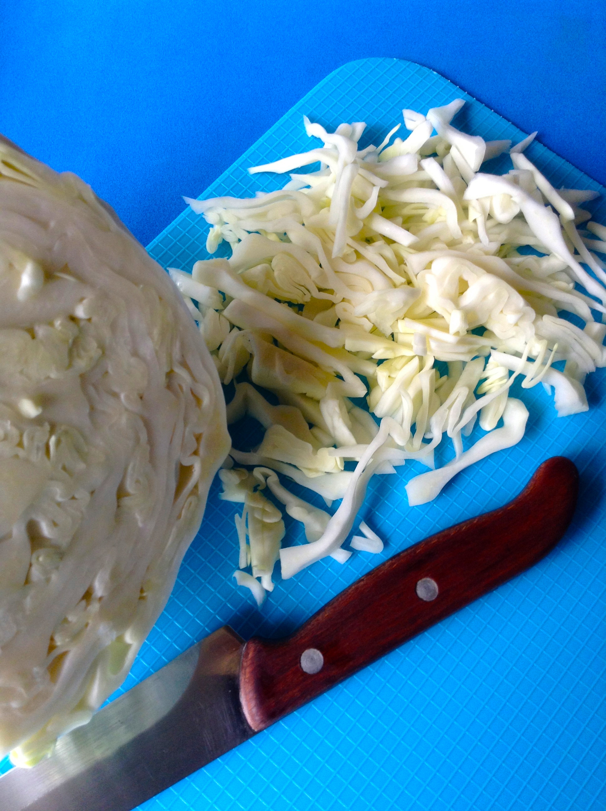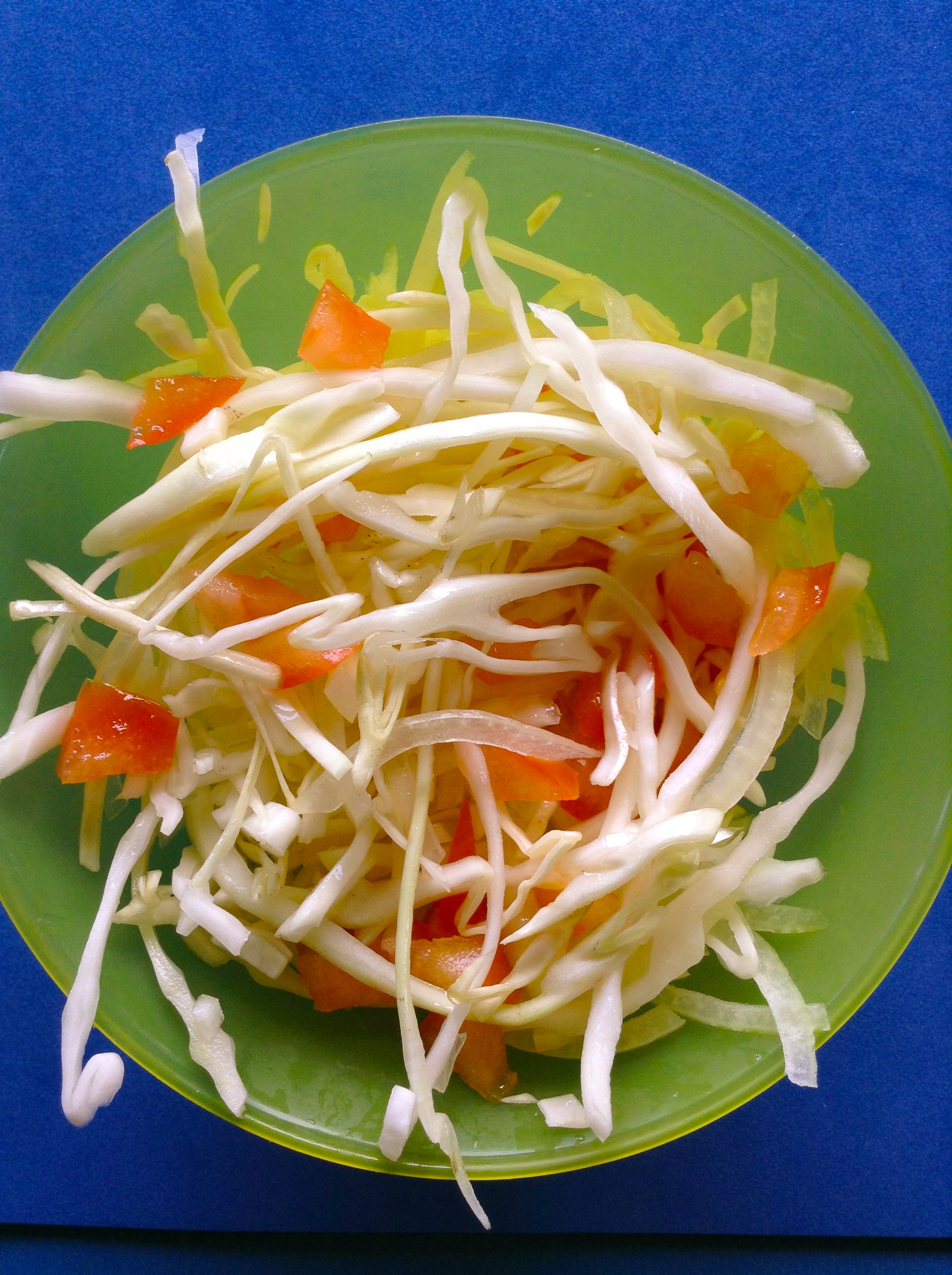 Mientras hago la ensalada. Para ello, corto el repollo en juliana, troceo el tomate, pico el cilantro y exprimo la lima.