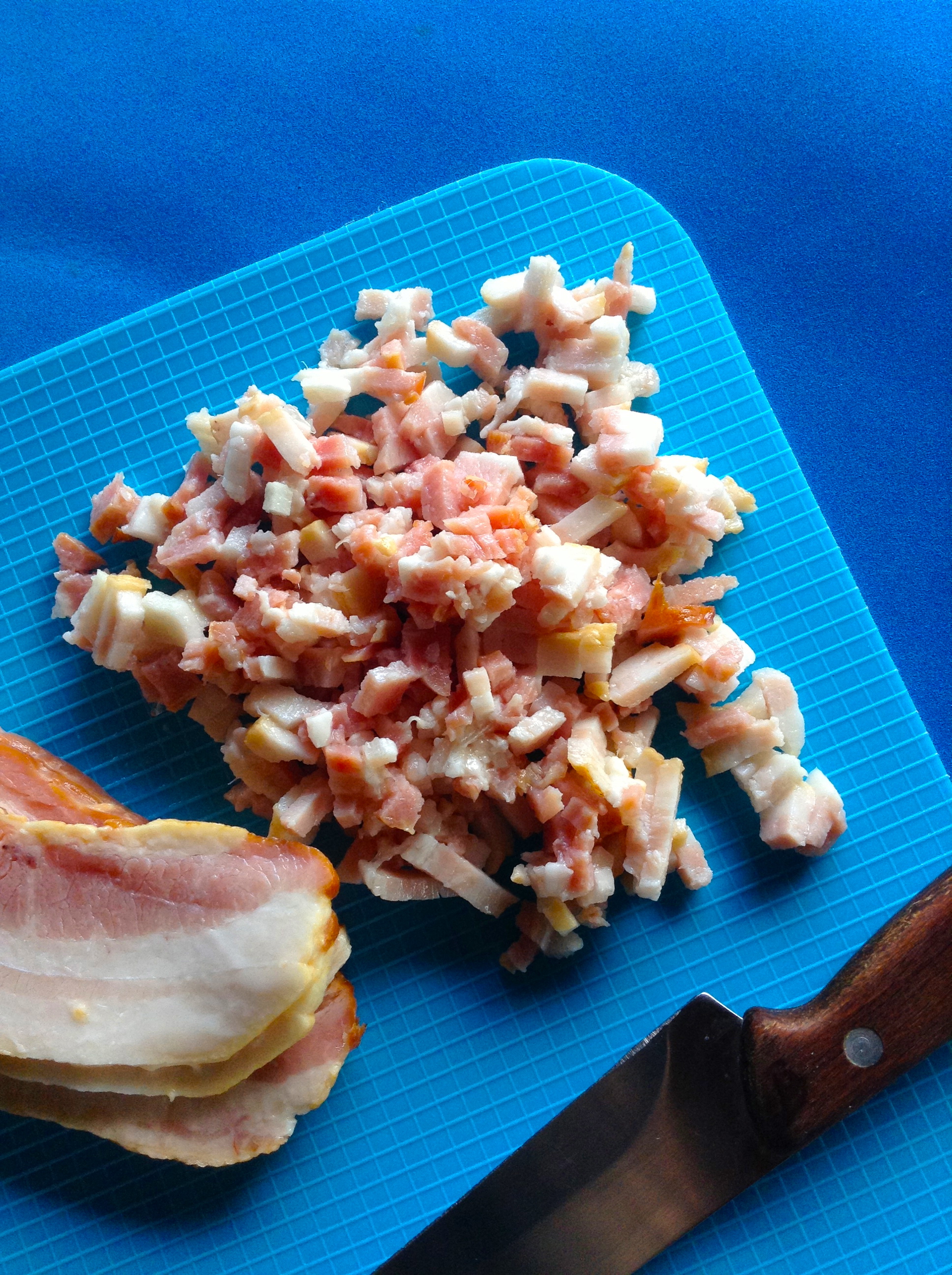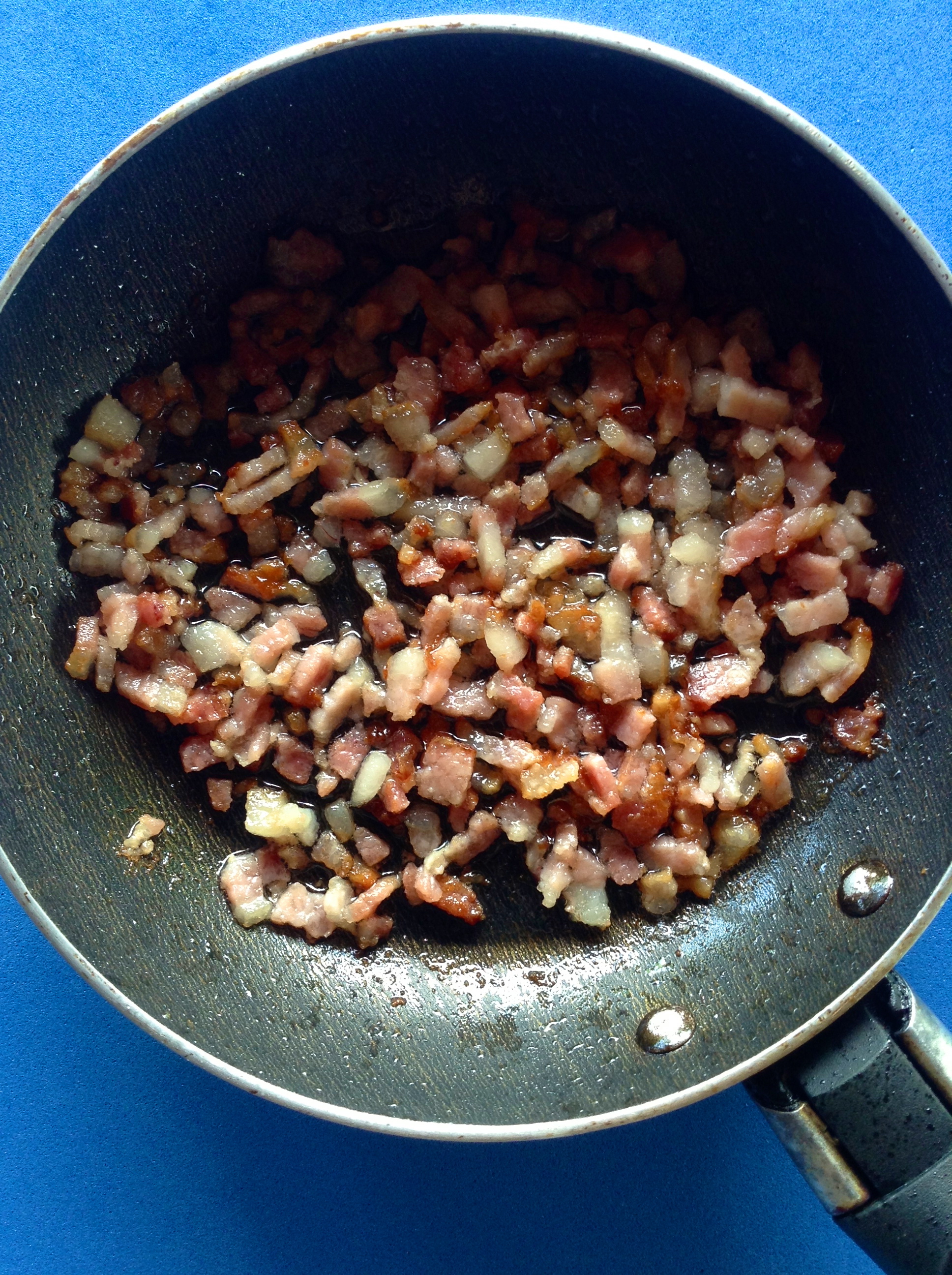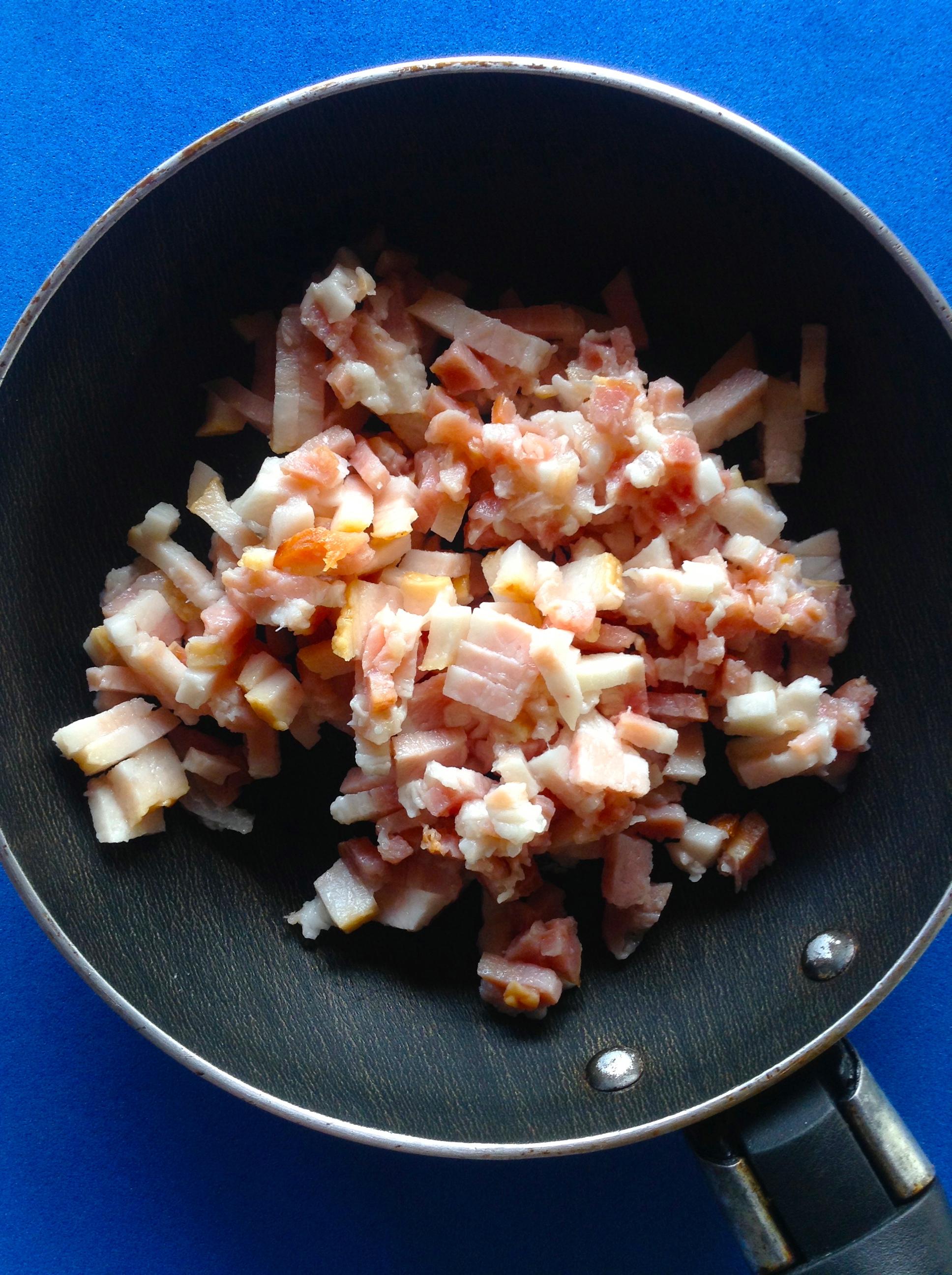 Mientras, rallo el queso. Pico el tocino y lo frío en su propia grasa.